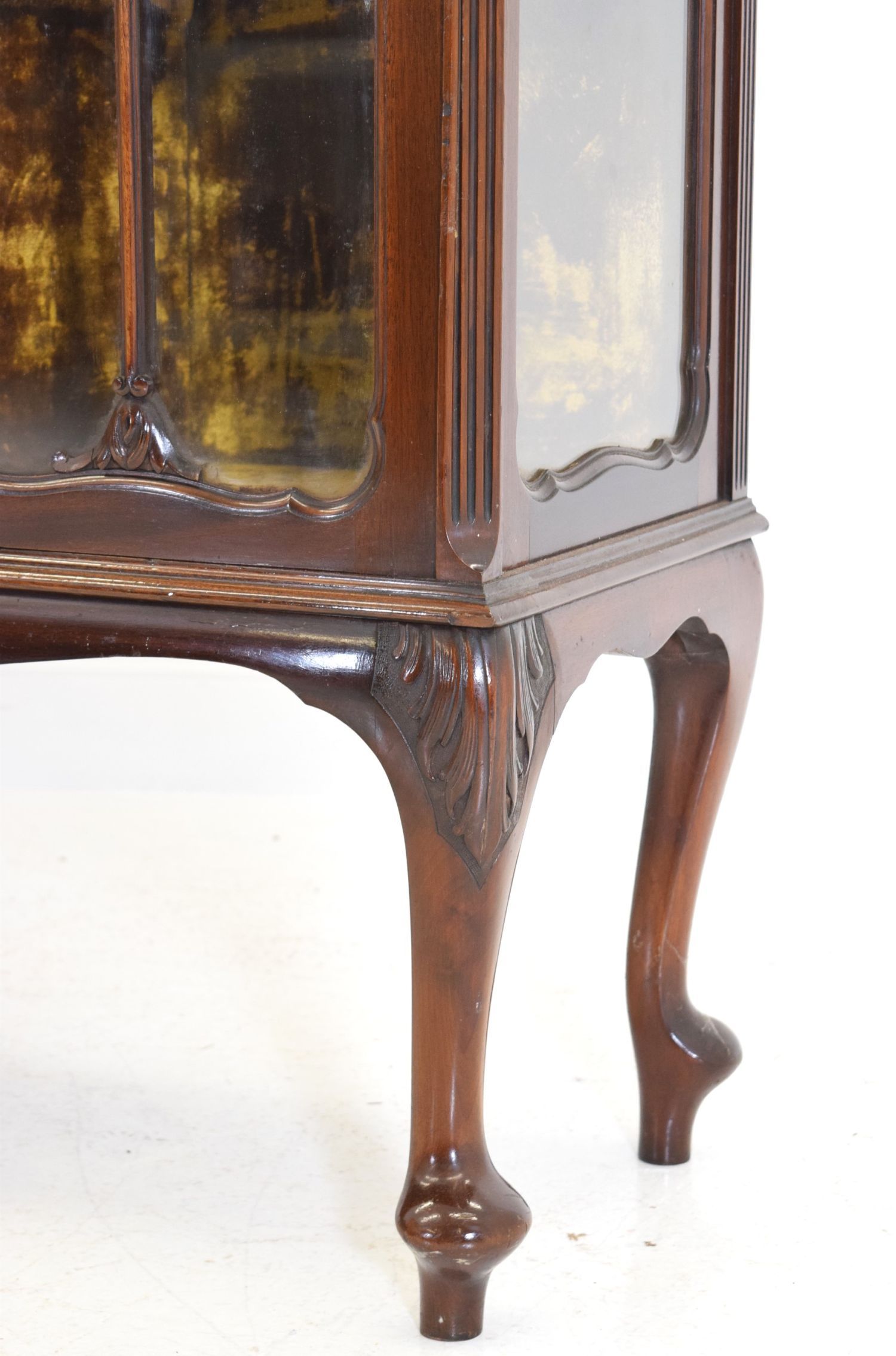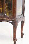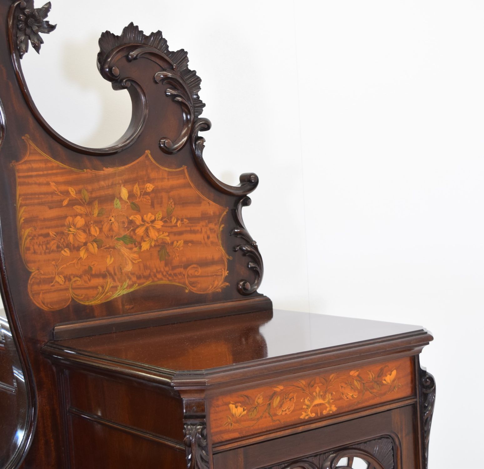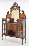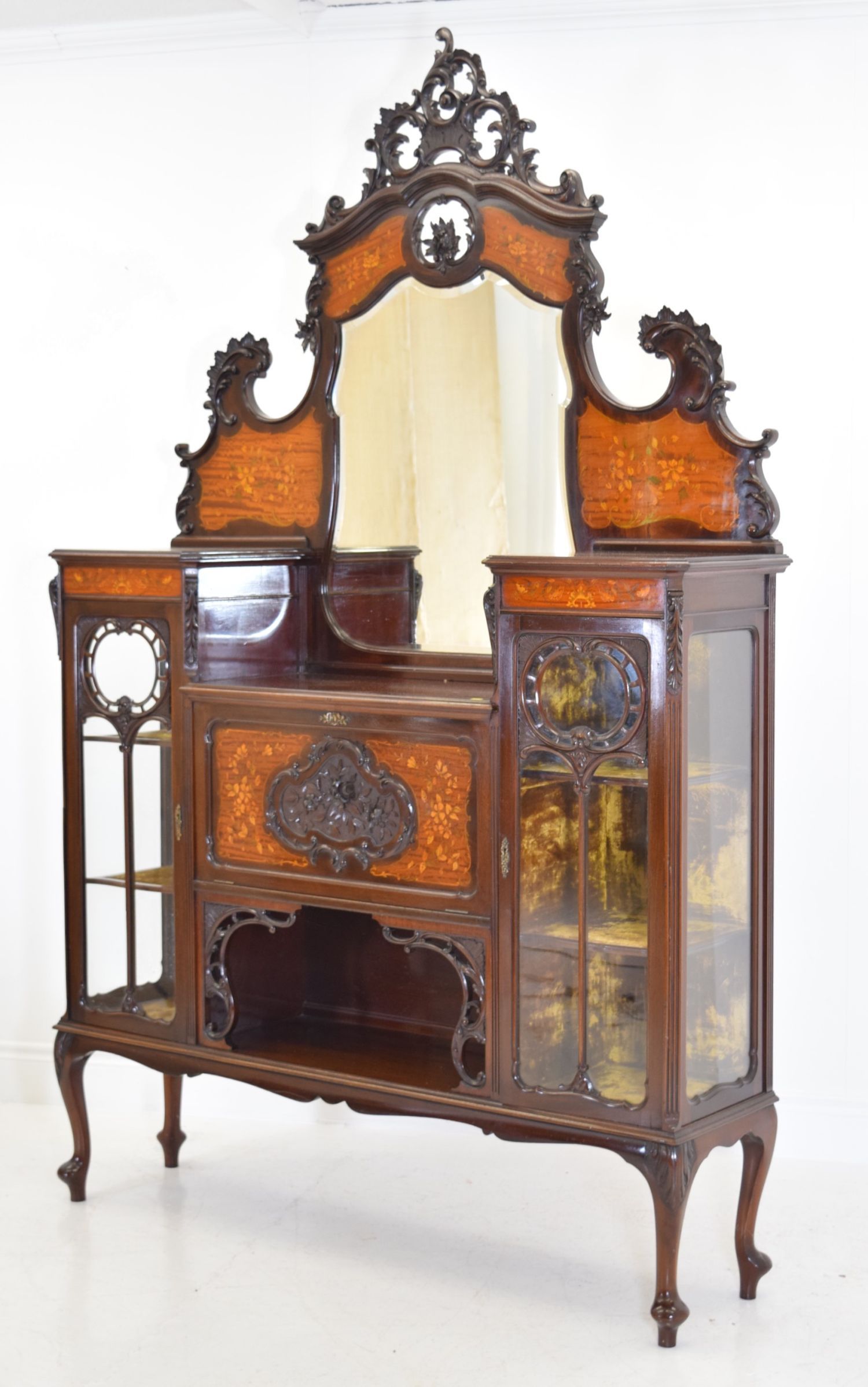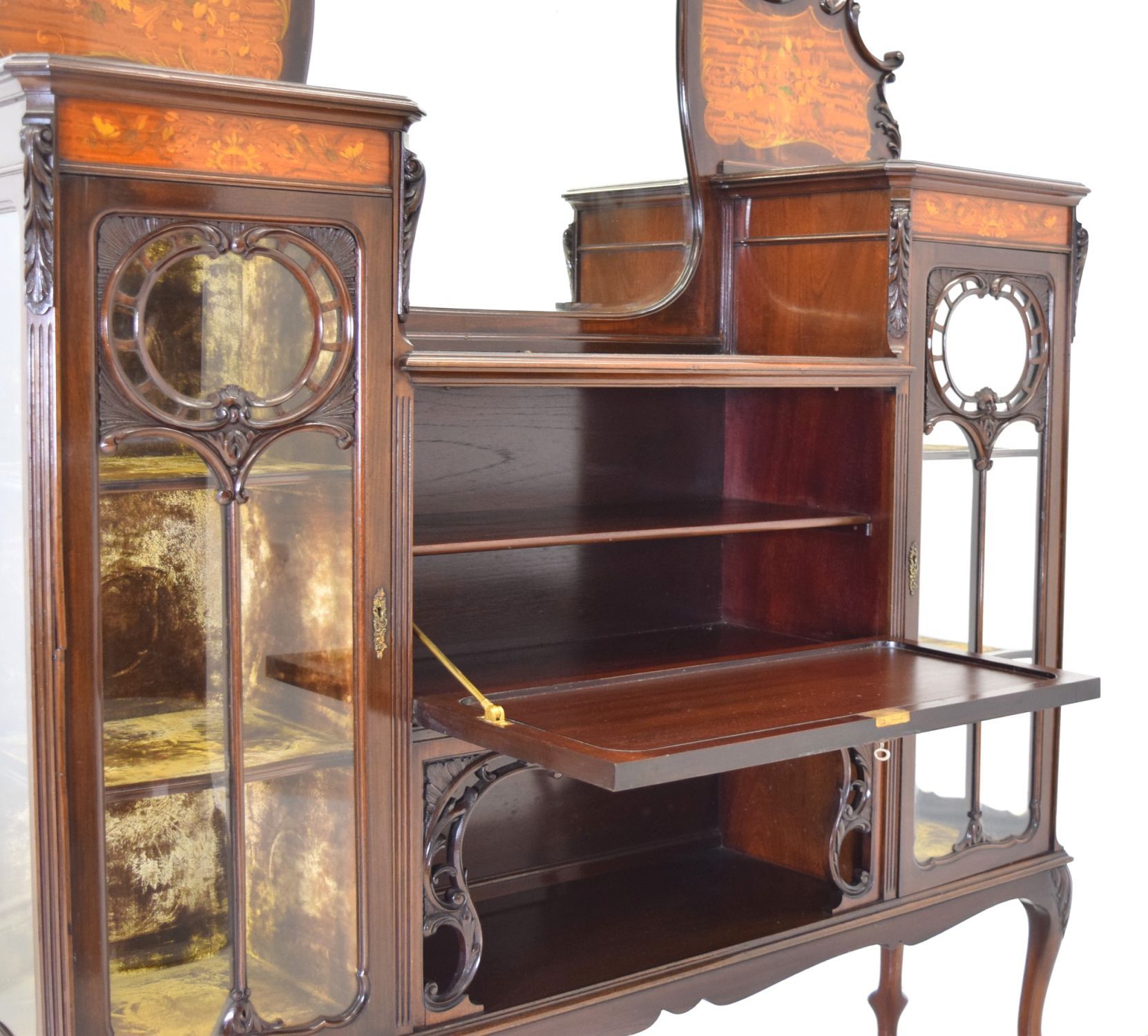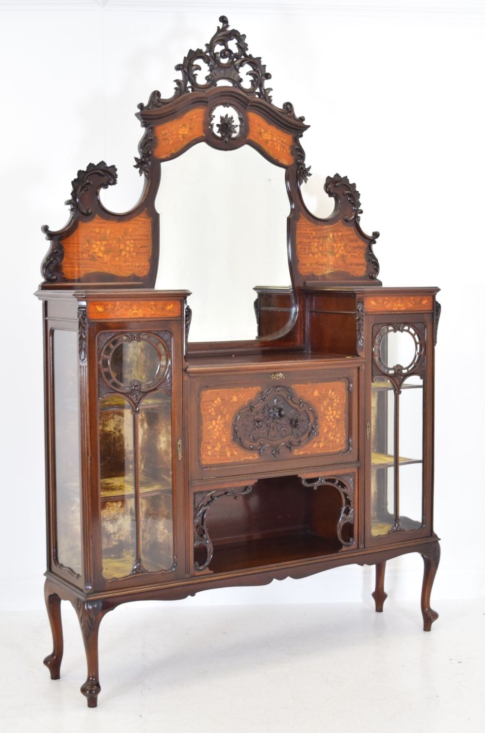 A fine late 19th-century mahogany and marquetry mirror-back side cabinet by Edwards & Roberts. The central fall-front veneered with floral inlay, flanked by glazed cabinets with serpentine mullions, surmounted by a shaped bevelled mirror back with scrolling carved cresting and further floral marquetry panels. The cabinet is richly embellished with carved scrollwork and decorative motifs throughout.