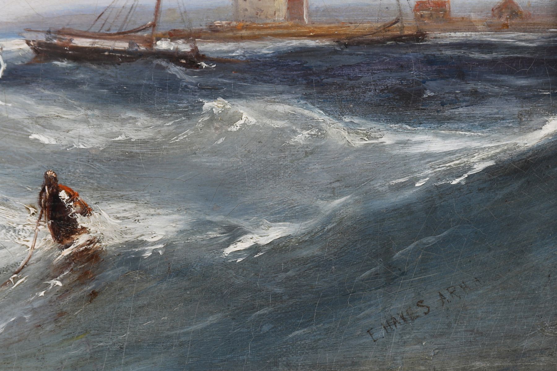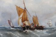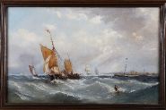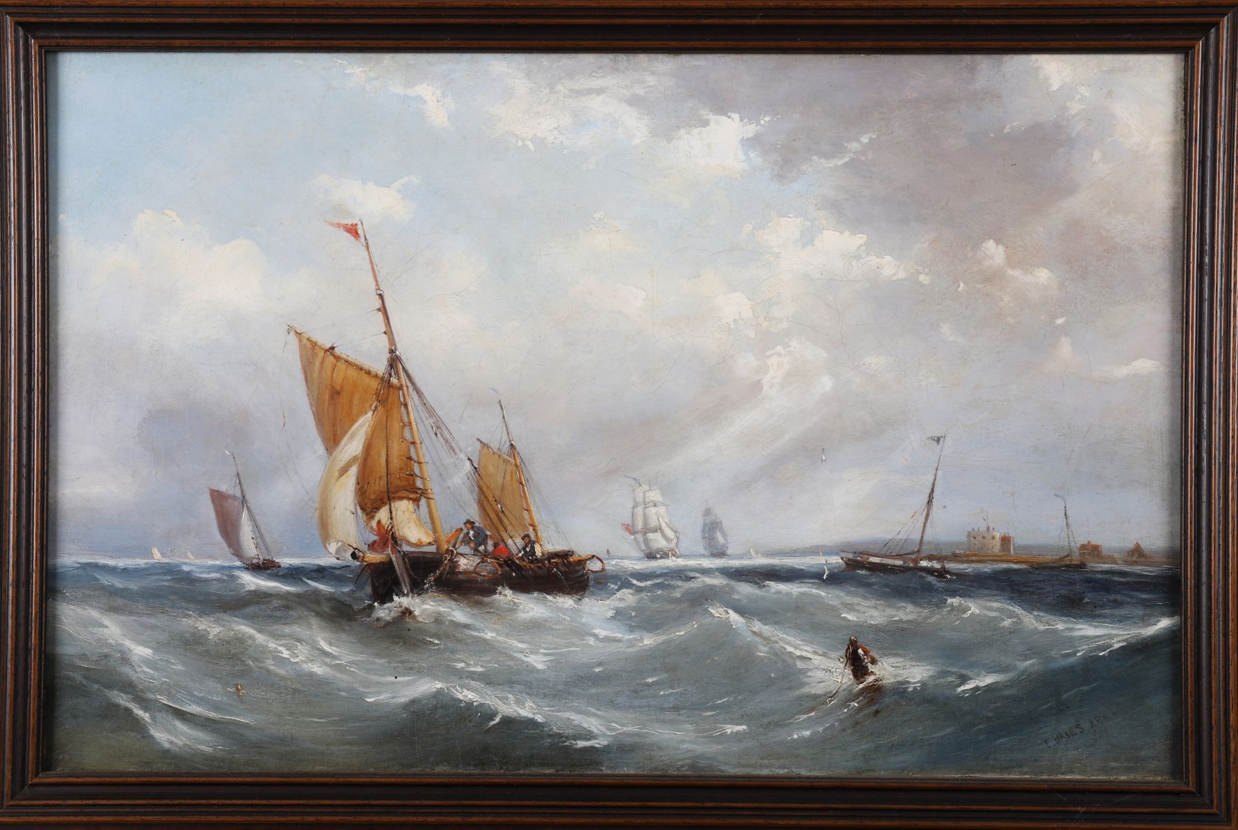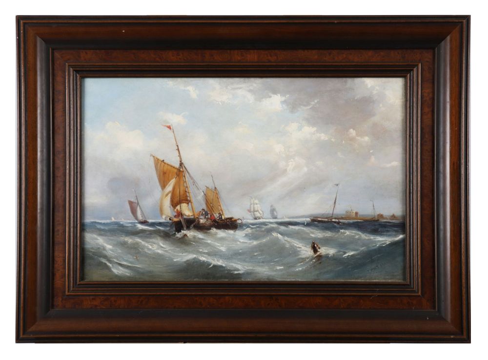 A dramatic seascape depicting sailing vessels navigating through rough waters under a clouded sky, with distant ships and coastal fortifications beyond. Oil on canvas, signed lower right. Presented in a dark walnut frame.