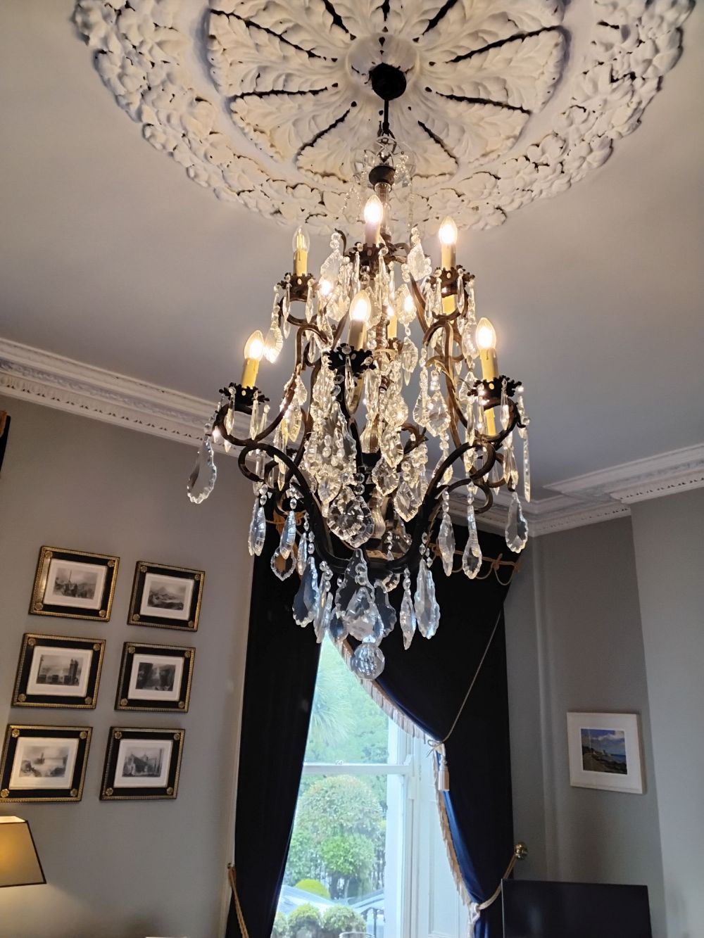 An eight-branch chandelier with black-painted metal arms and profuse faceted glass droppers, including pear and spear-shaped lustres, arranged around a central baluster shaft — elegant proportions and contrast.