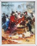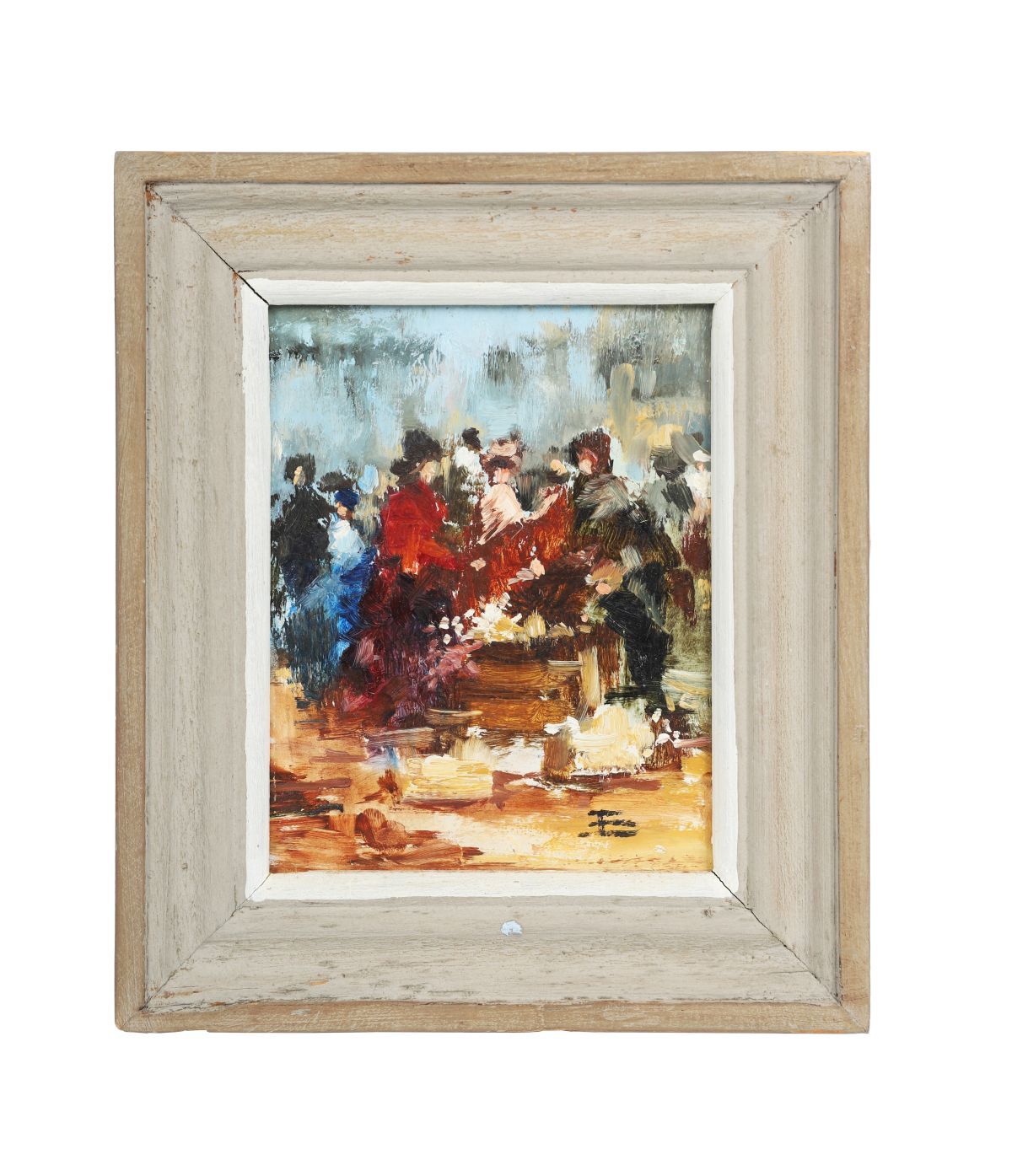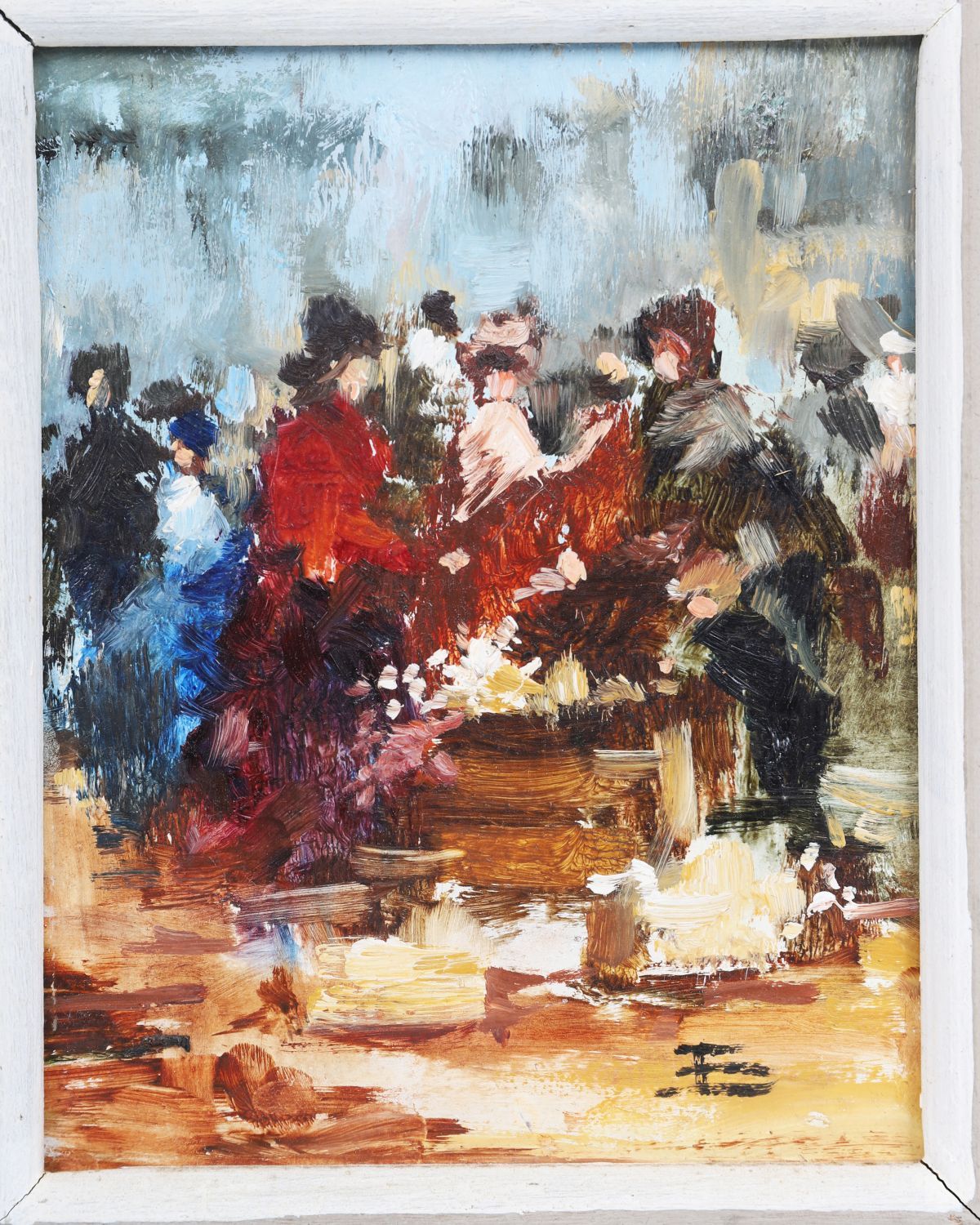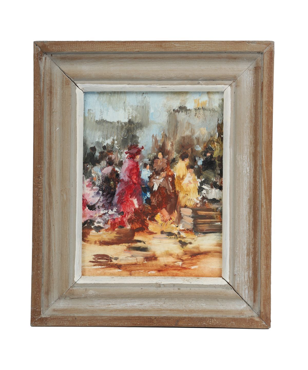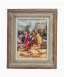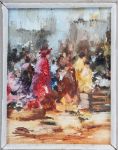 Pair of oil paintings depicting lively market scenes with richly dressed figures. Presented in complementary wooden frames.