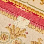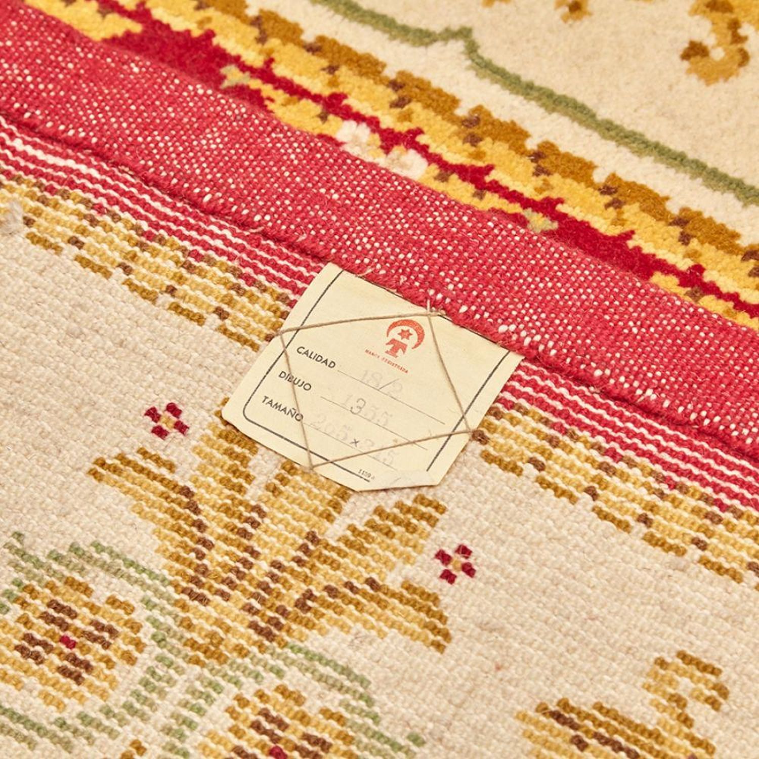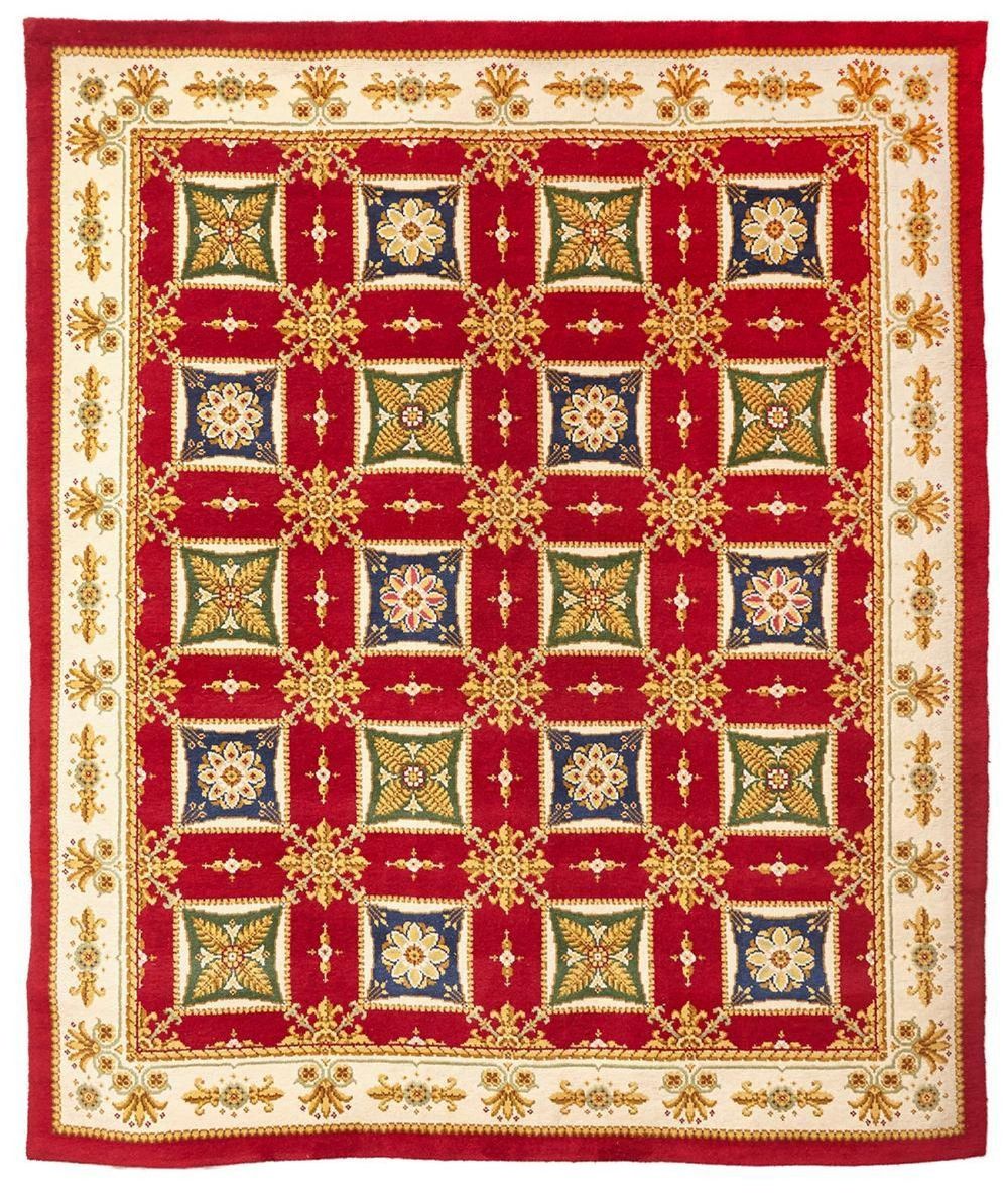 Hand-made, first quarter of 20th century. The vibrant ruby red field set with a formal grid of alternating square medallions enclosing stylised rosettes, laurel wreaths, and neoclassical star motifs in navy, ivory, and gold. The symmetrical design is punctuated at each intersection with ornate fleurons in gold, creating a regal and structured layout. Framed by an ivory border adorned with classical palmettes and anthemia in ochre and russet tones