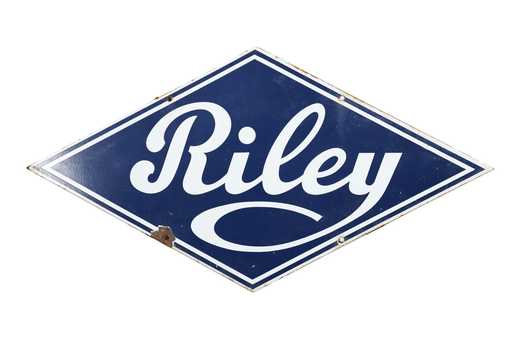 A blue and white enamelled advertising sign for Riley, of diamond form with bold script lettering.