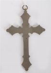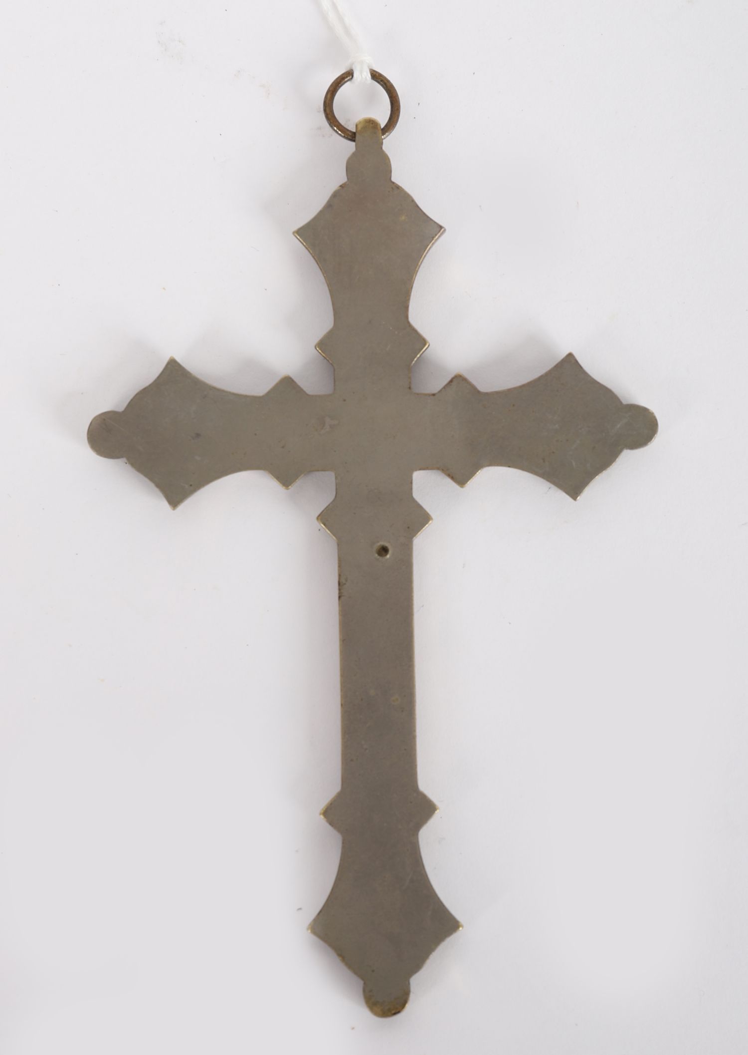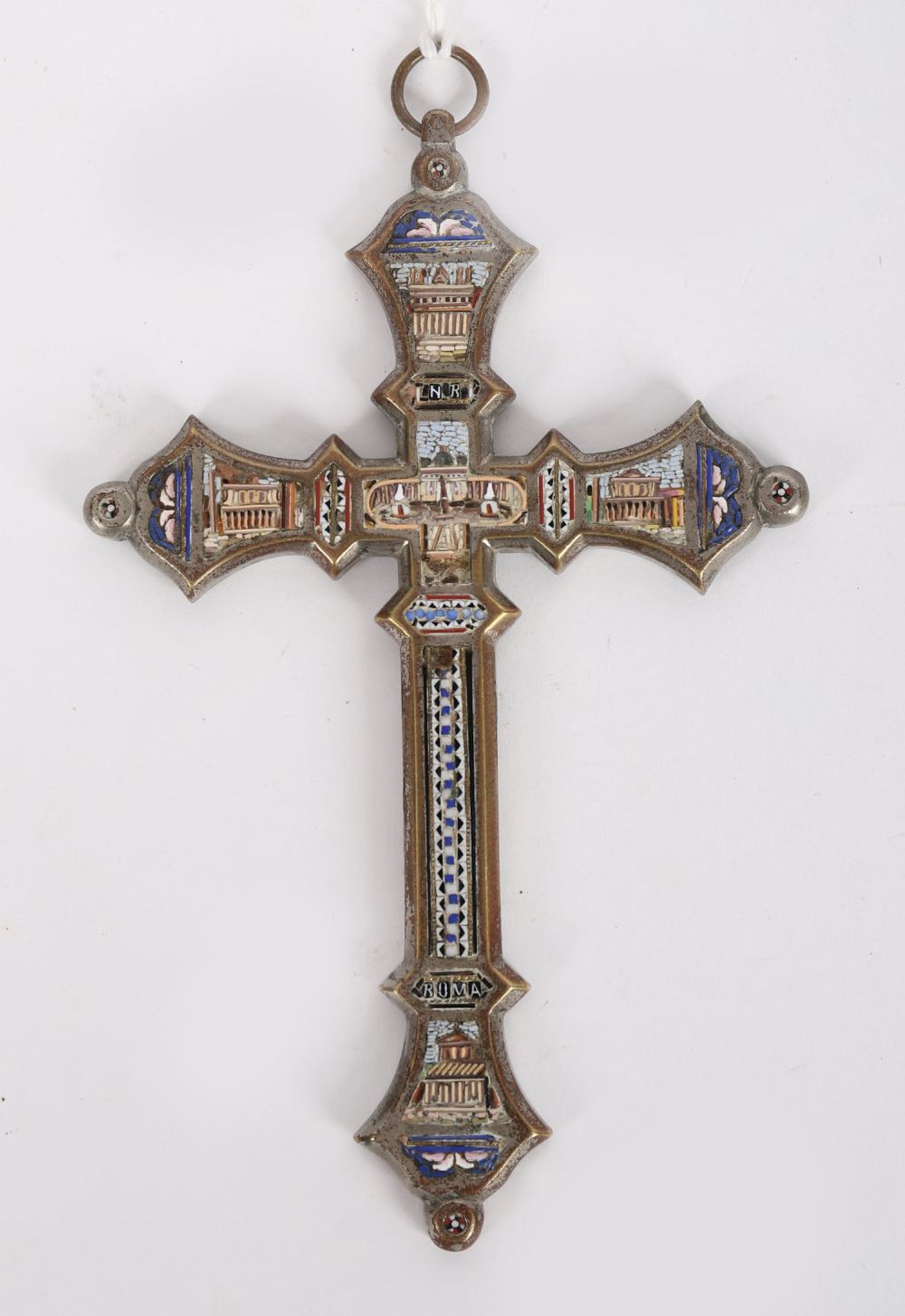 A 19th century Continental brass and micromosaic enamel crucifix, decorated with architectural vignettes including St Peter’s Basilica and other Roman landmarks, inscribed “ROMA.”