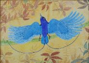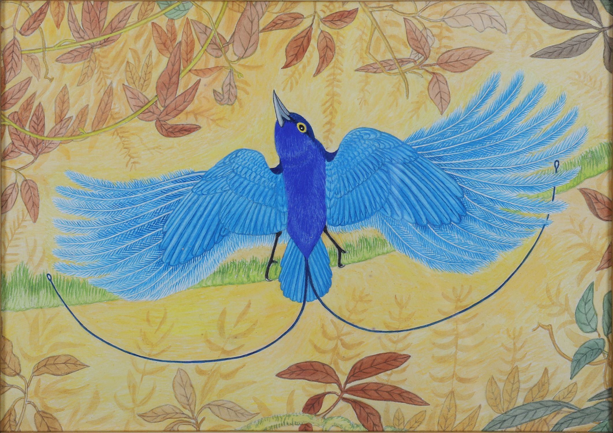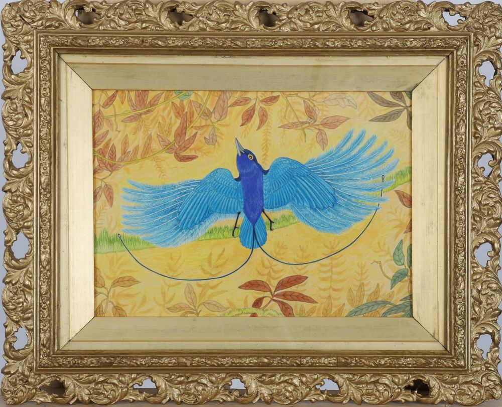 A vibrant watercolour painting on paper of a blue bird in flight amid stylised foliage on a yellow ground. Framed and glazed in a decorative gilt frame. Watercolour.
