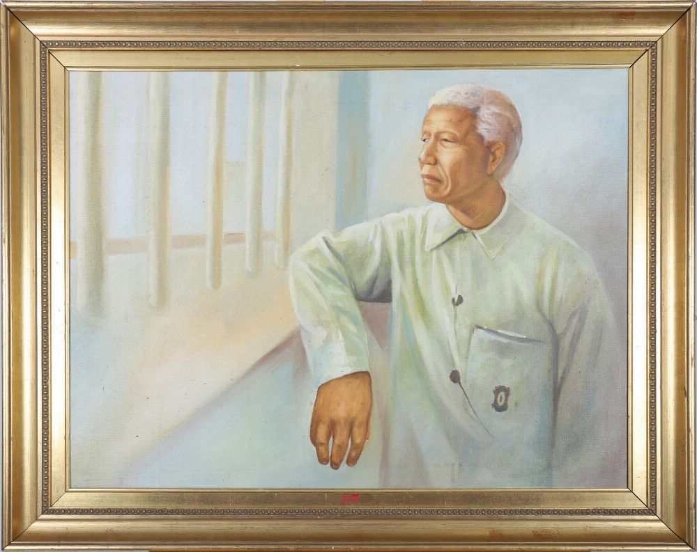 Portrait of Nelson Mandela, shown smiling in a pale shirt. Oil on canvas. Framed and glazed.