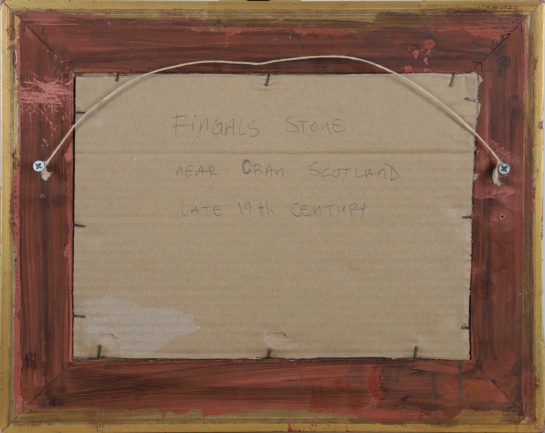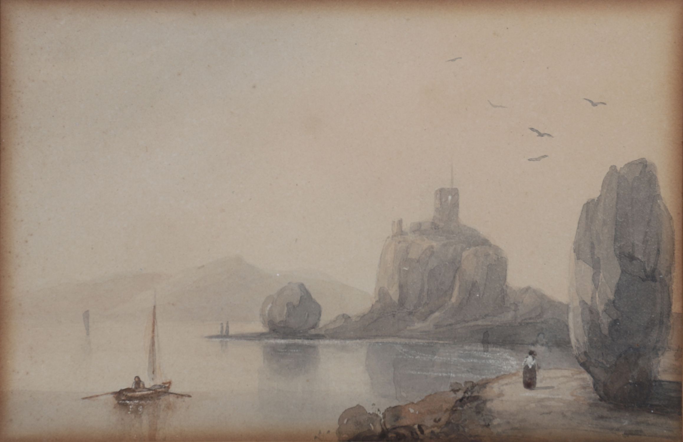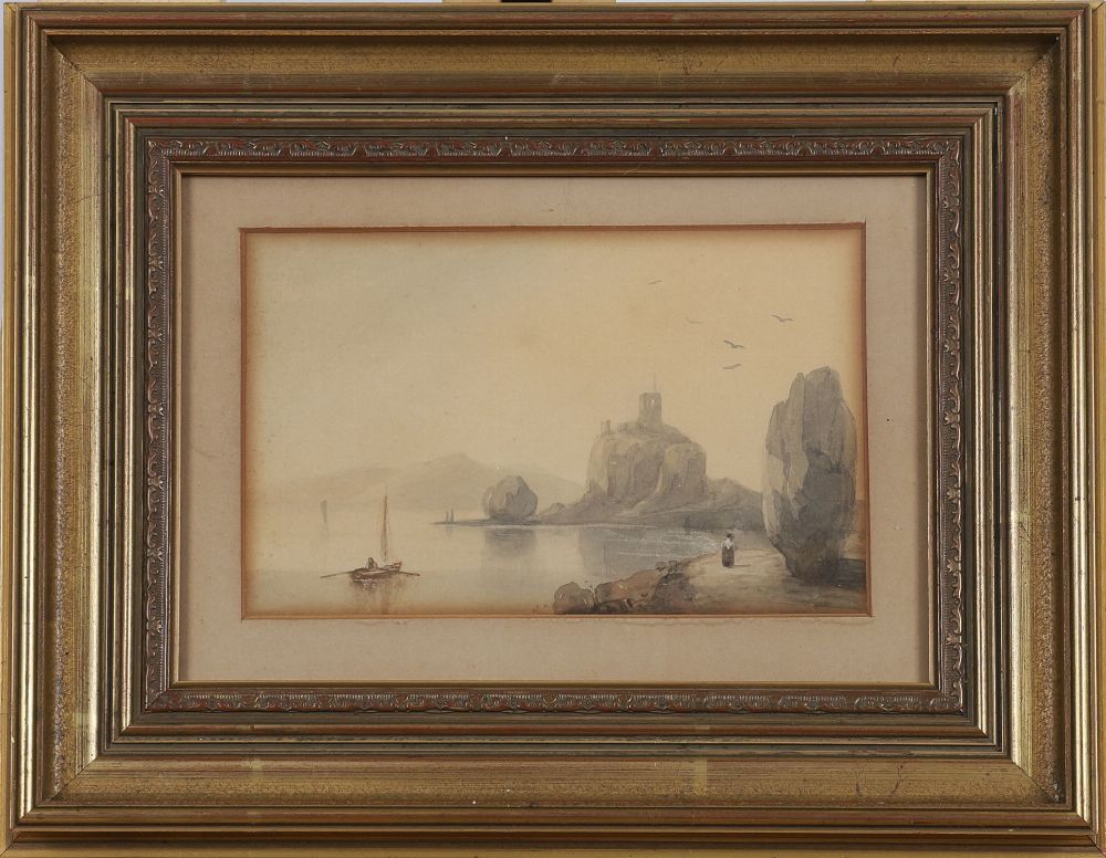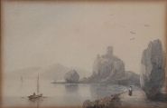A delicate watercolour of a coastal view with boats, rocky shoreline and a ruined castle tower on a hill, Fingals Stone near Oban Scotland. Framed and glazed. Watercolour.