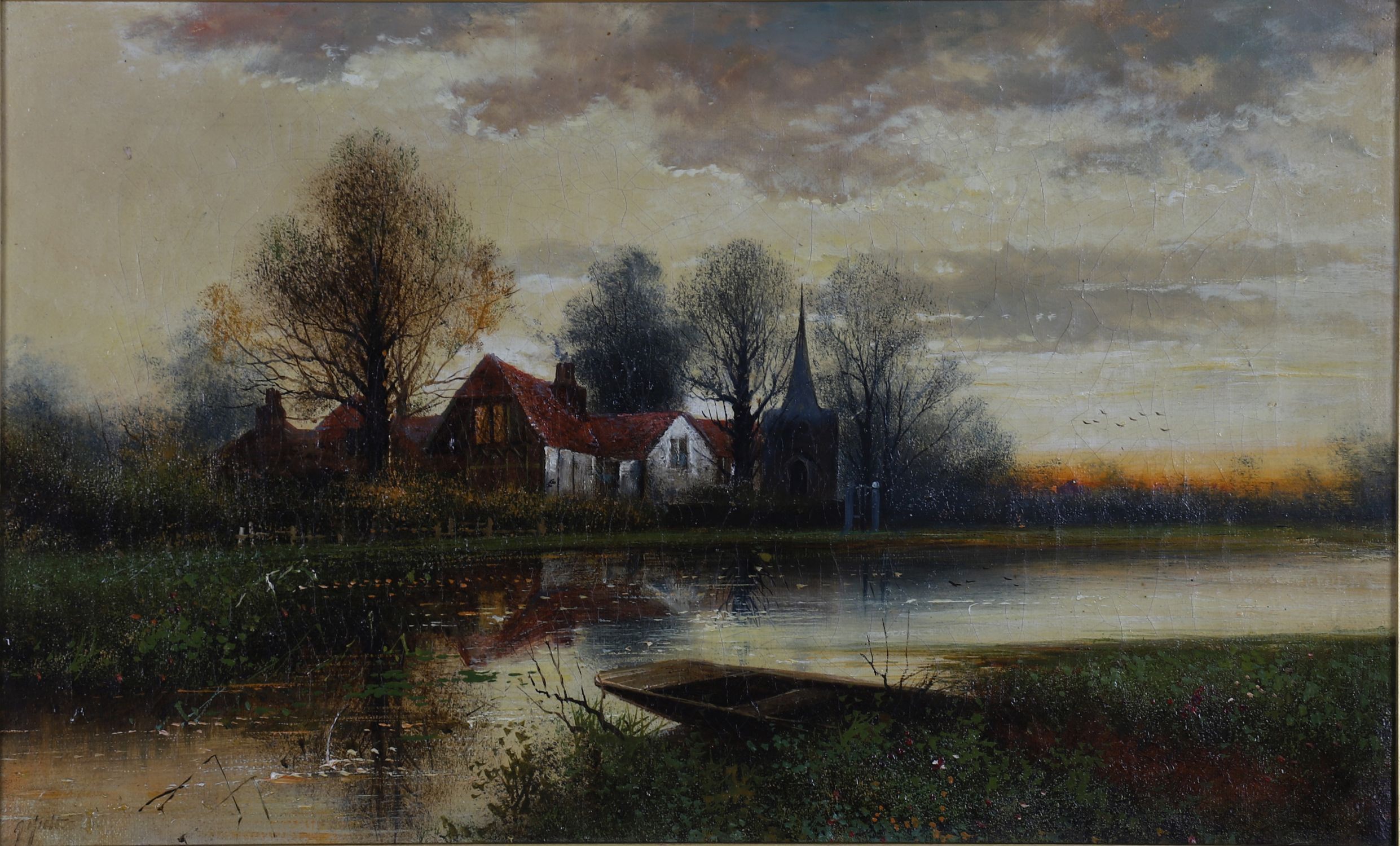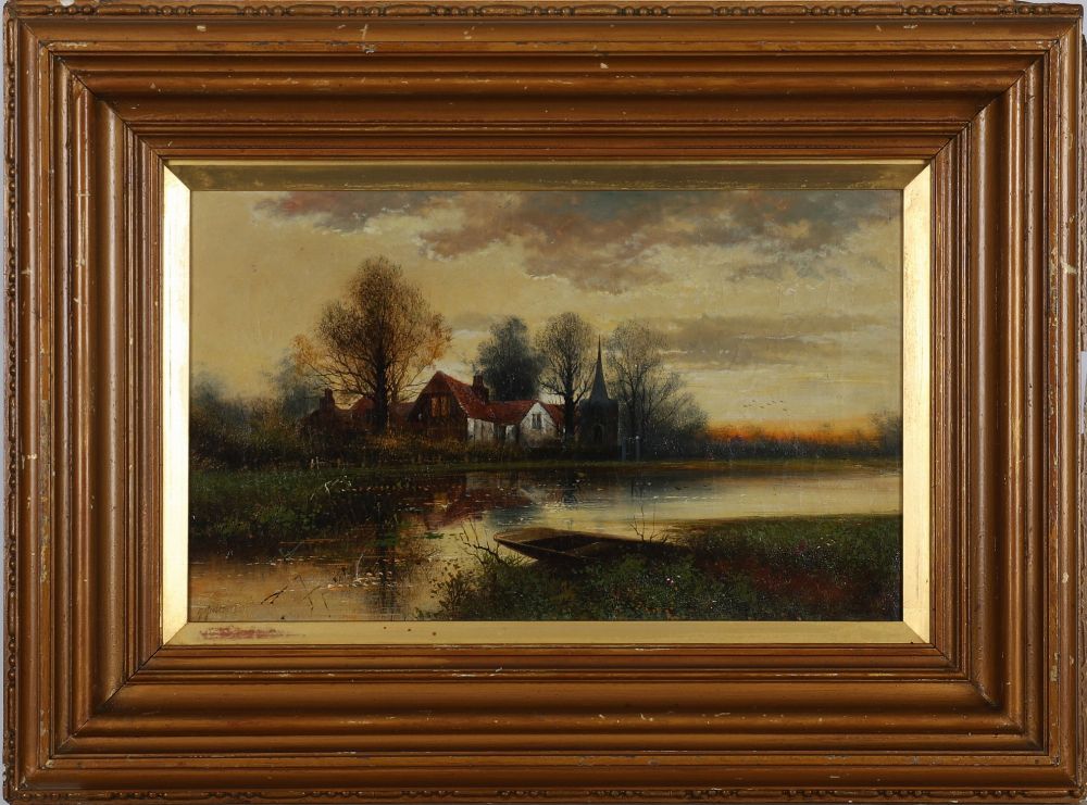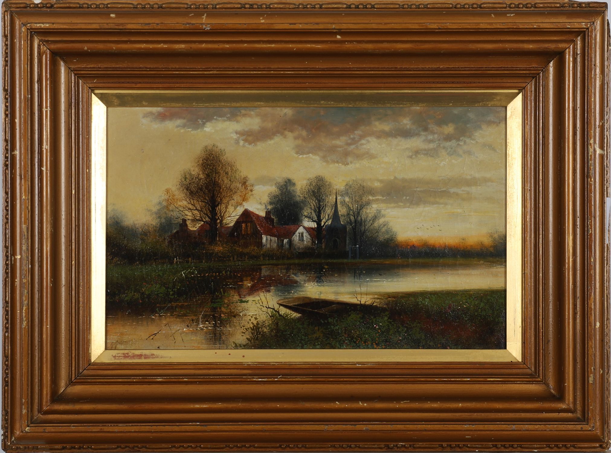 Oil painting depicting cottages and a church beside a river with boat in foreground, under a dusky sky. Fine tonal quality. Oil on canvas. Framed.