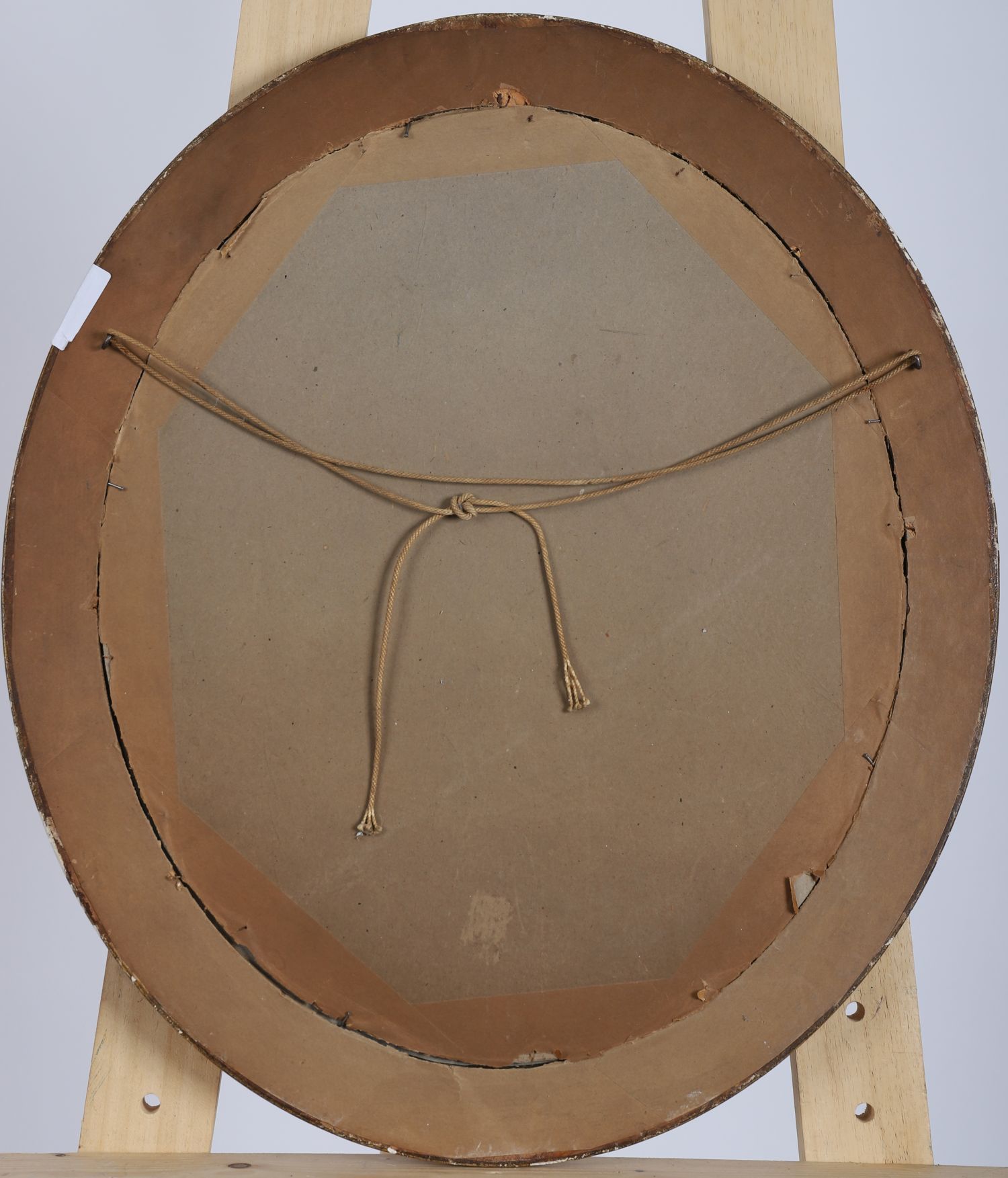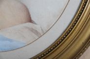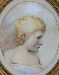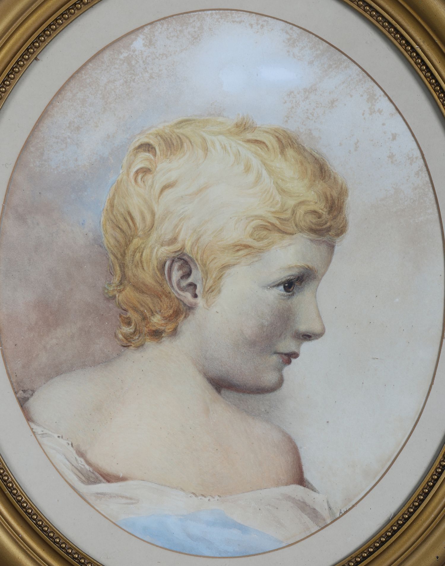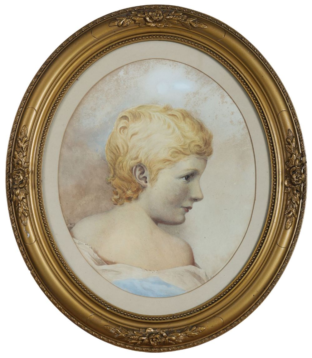Portrait of a young girl. Watercolour and pastel. Enclosed in an oval gilt frame.
