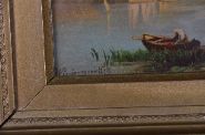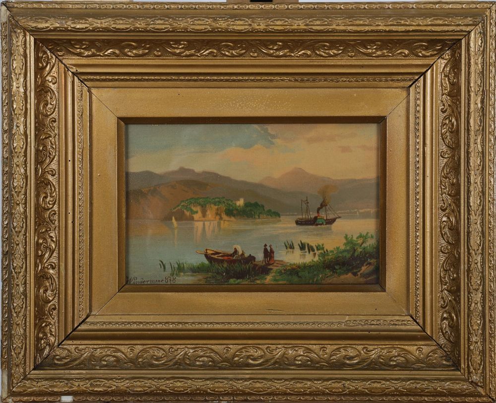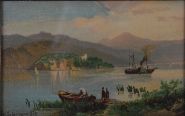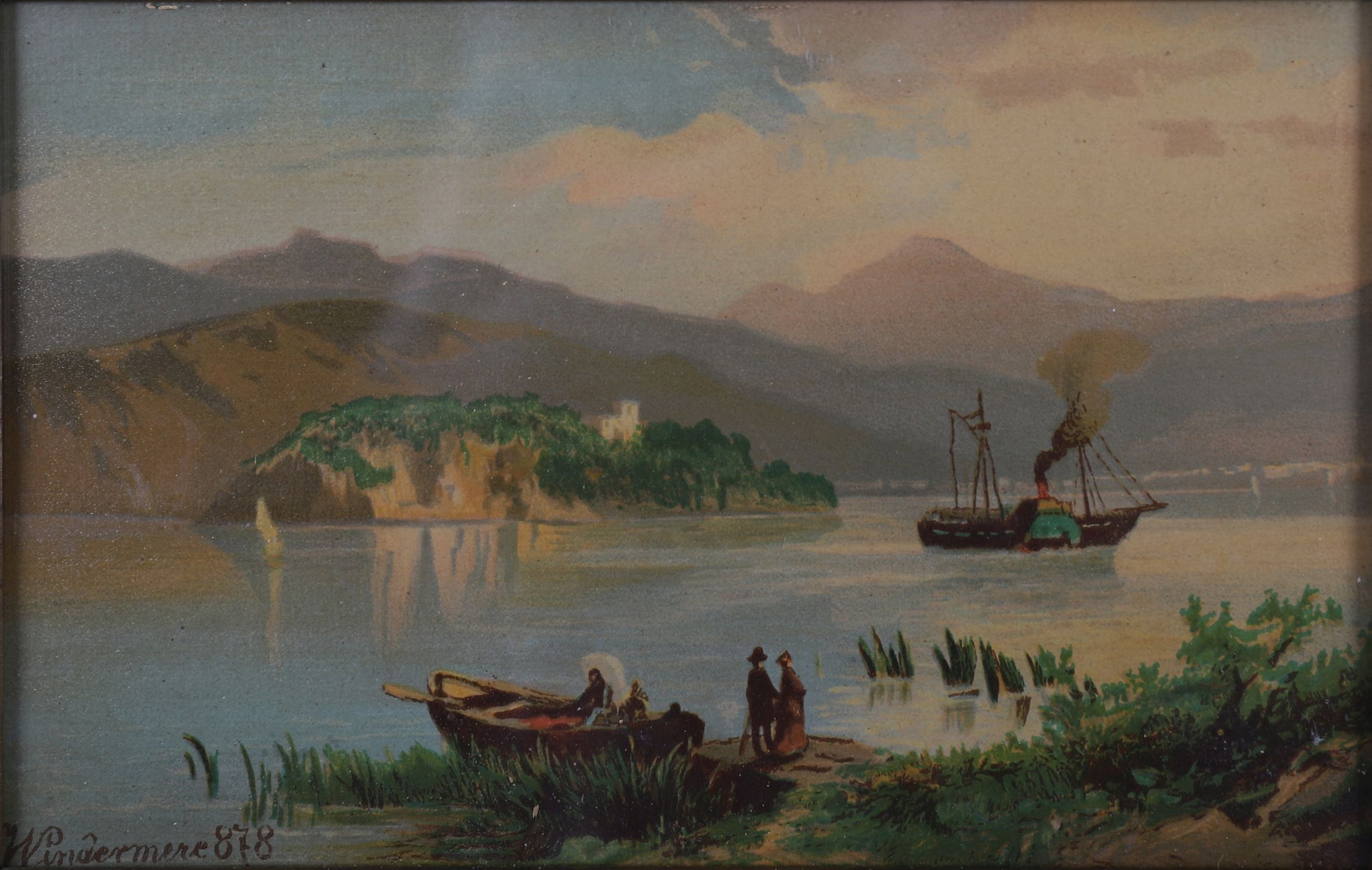 An oil painting depicting figures by the lake shore with boats and a steamship, signed lower left “Windermere 818”. Presented in gilt frame. Oil on card.