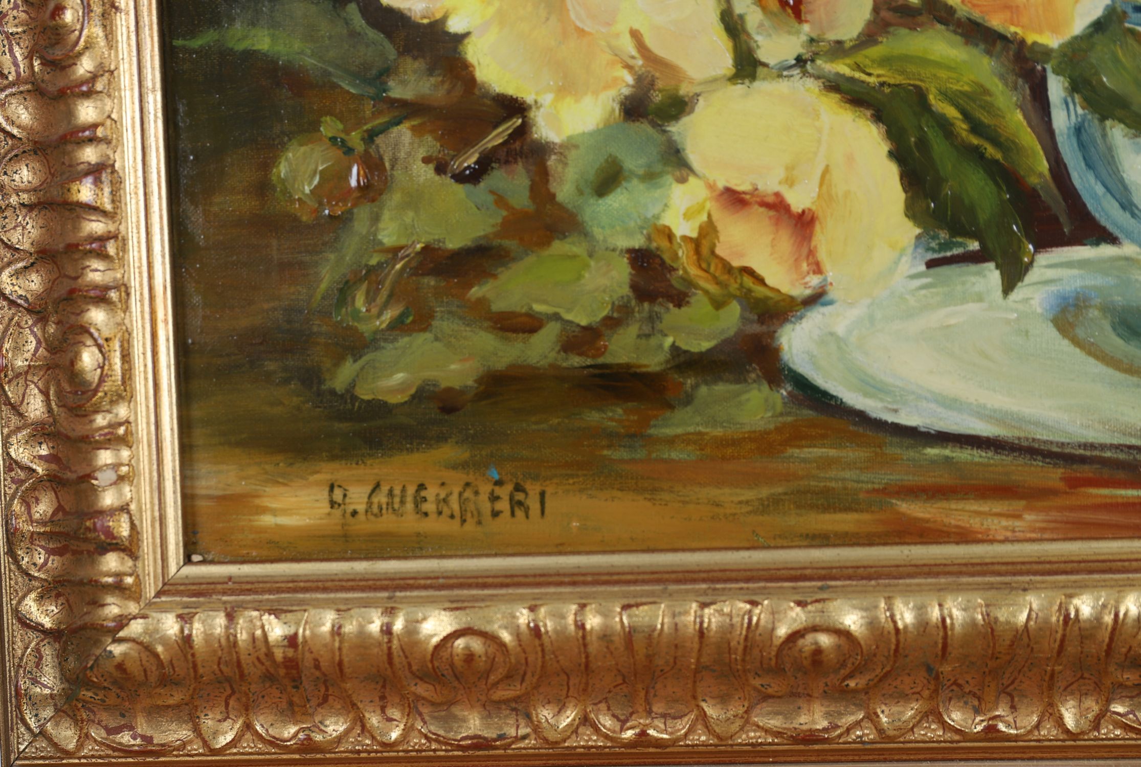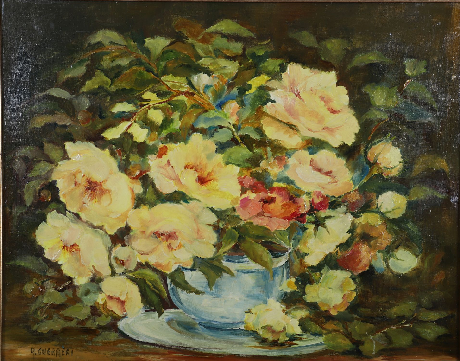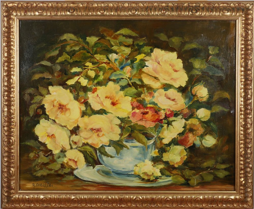 Oil on canvas depicting a floral arrangement of yellow and red roses in a bowl on a table. Housed in gilt frame.