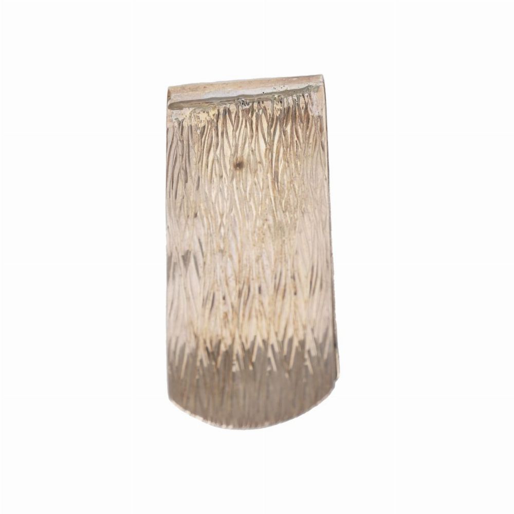 An English hallmarked silver money clip with engine-turned texture to one side and plain polished reverse, bearing maker’s marks.