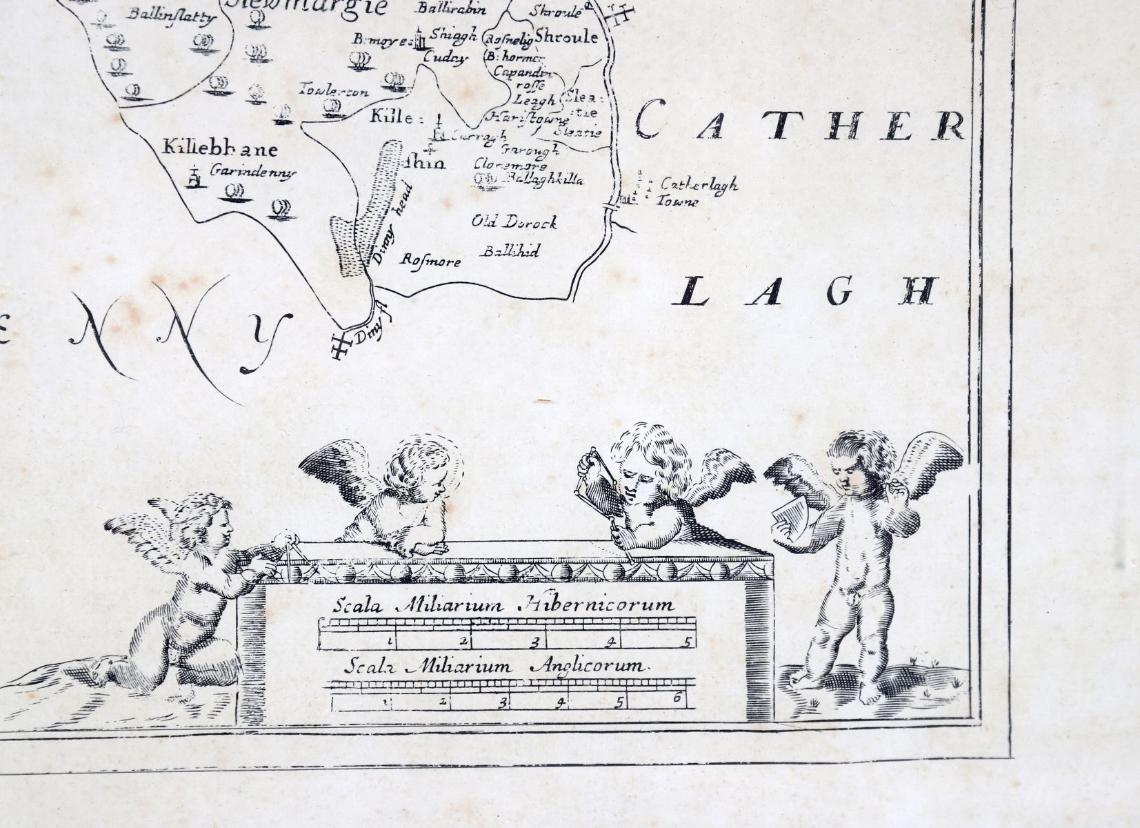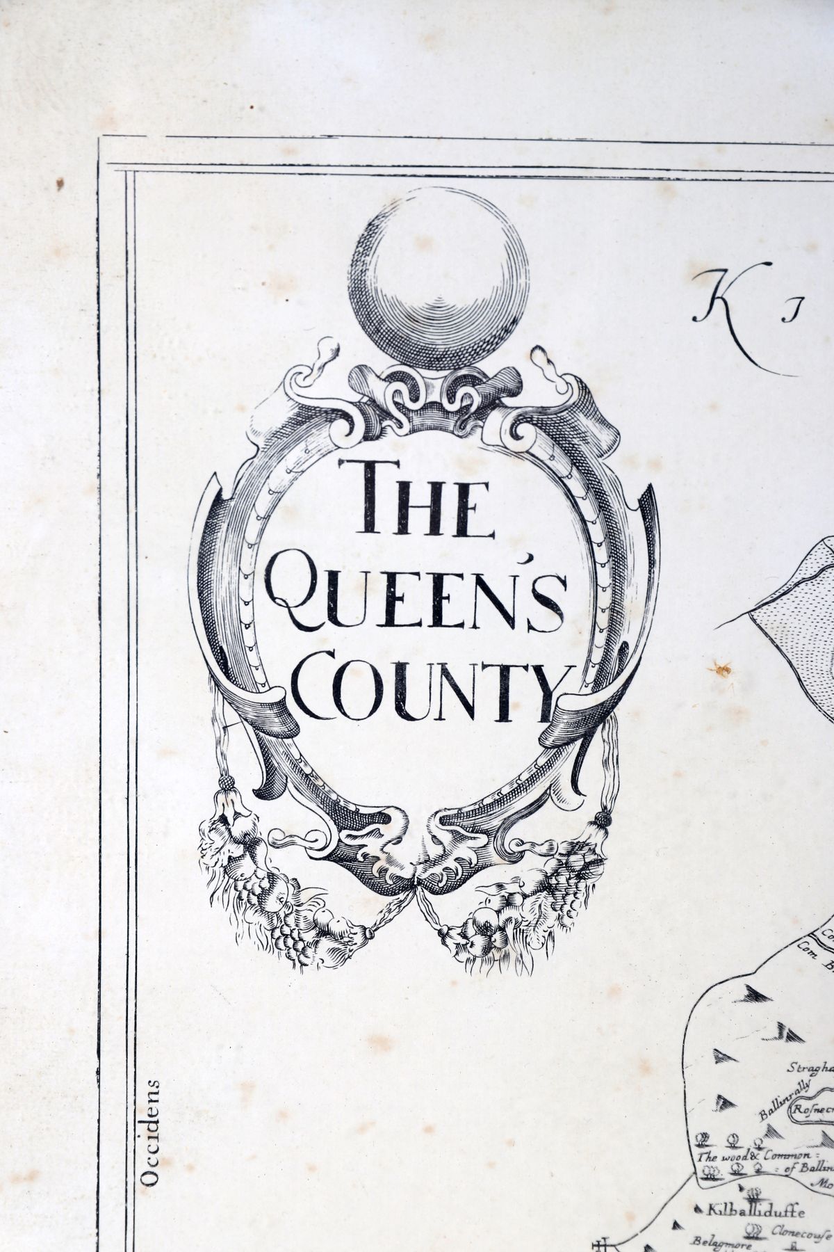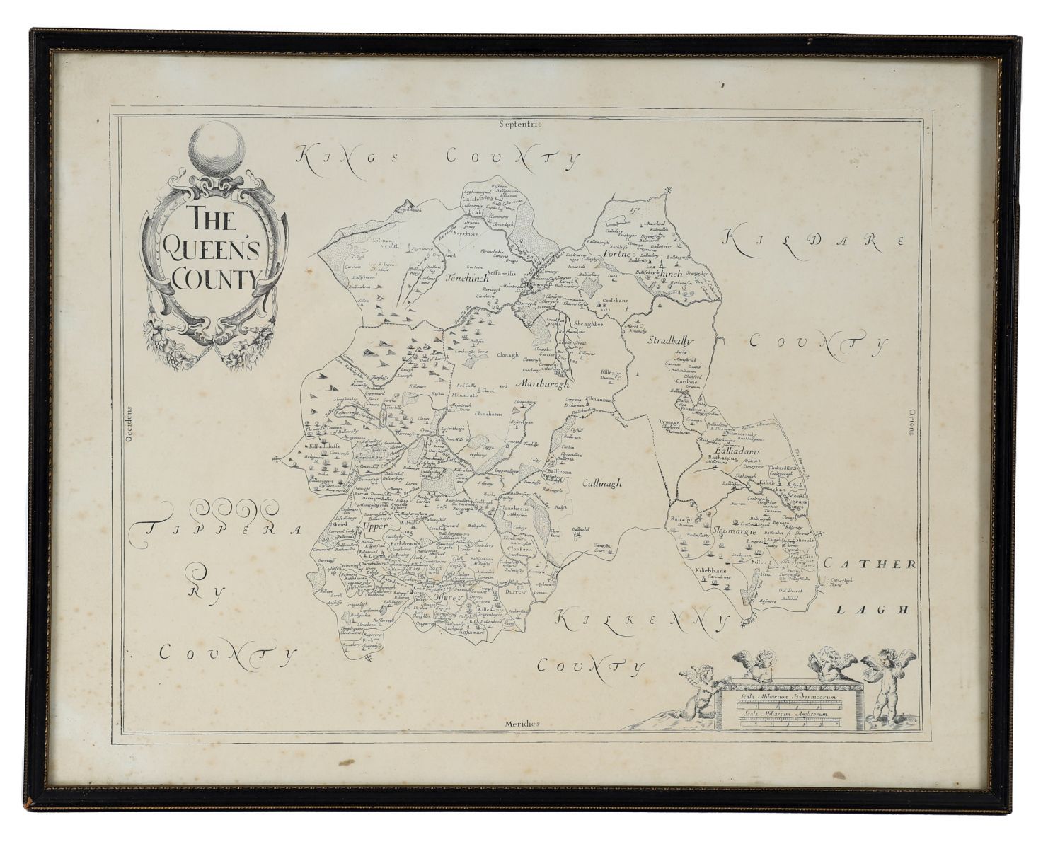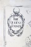 An engraved map titled The Queen’s County, showing baronies, towns, and surrounding counties, with decorative cartouche and cherubic vignette. 18th century, later framed.