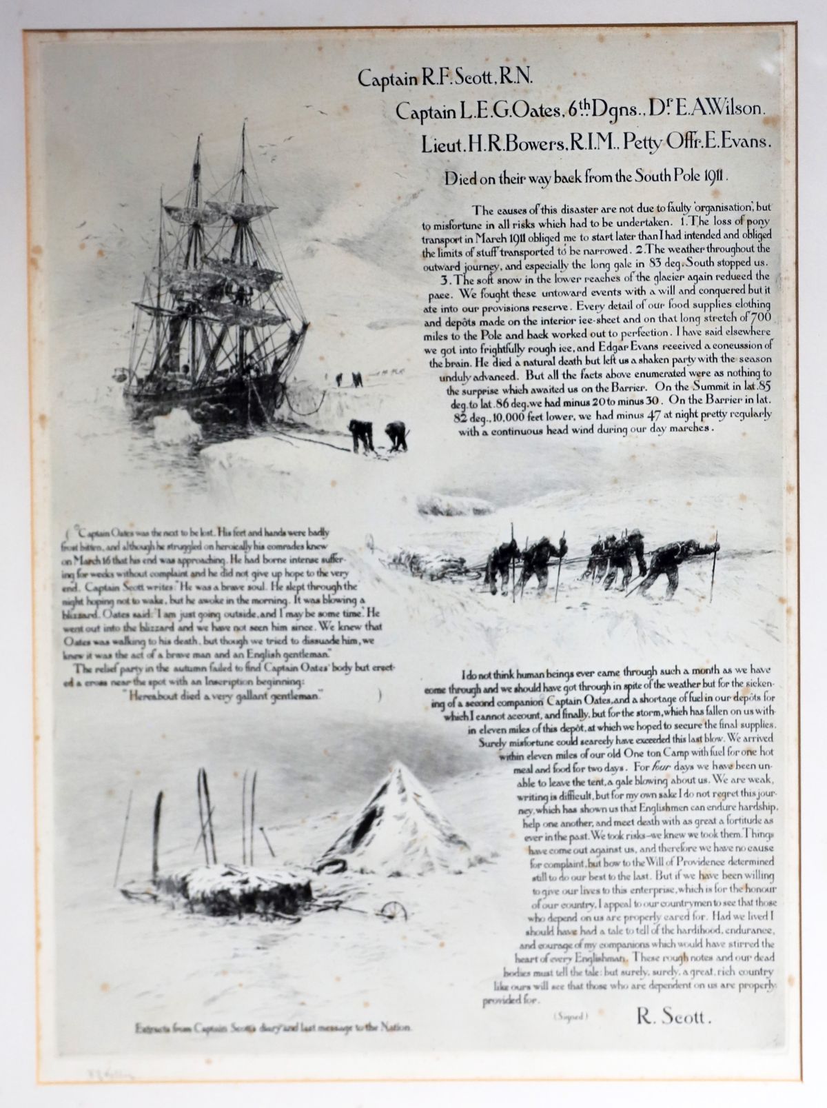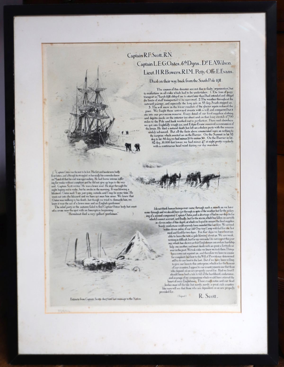 An engraving depicting extracts from Captain Robert Falcon Scott’s diary and last message to the nation, illustrated with polar expedition scenes. Mounted and framed.