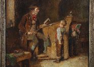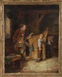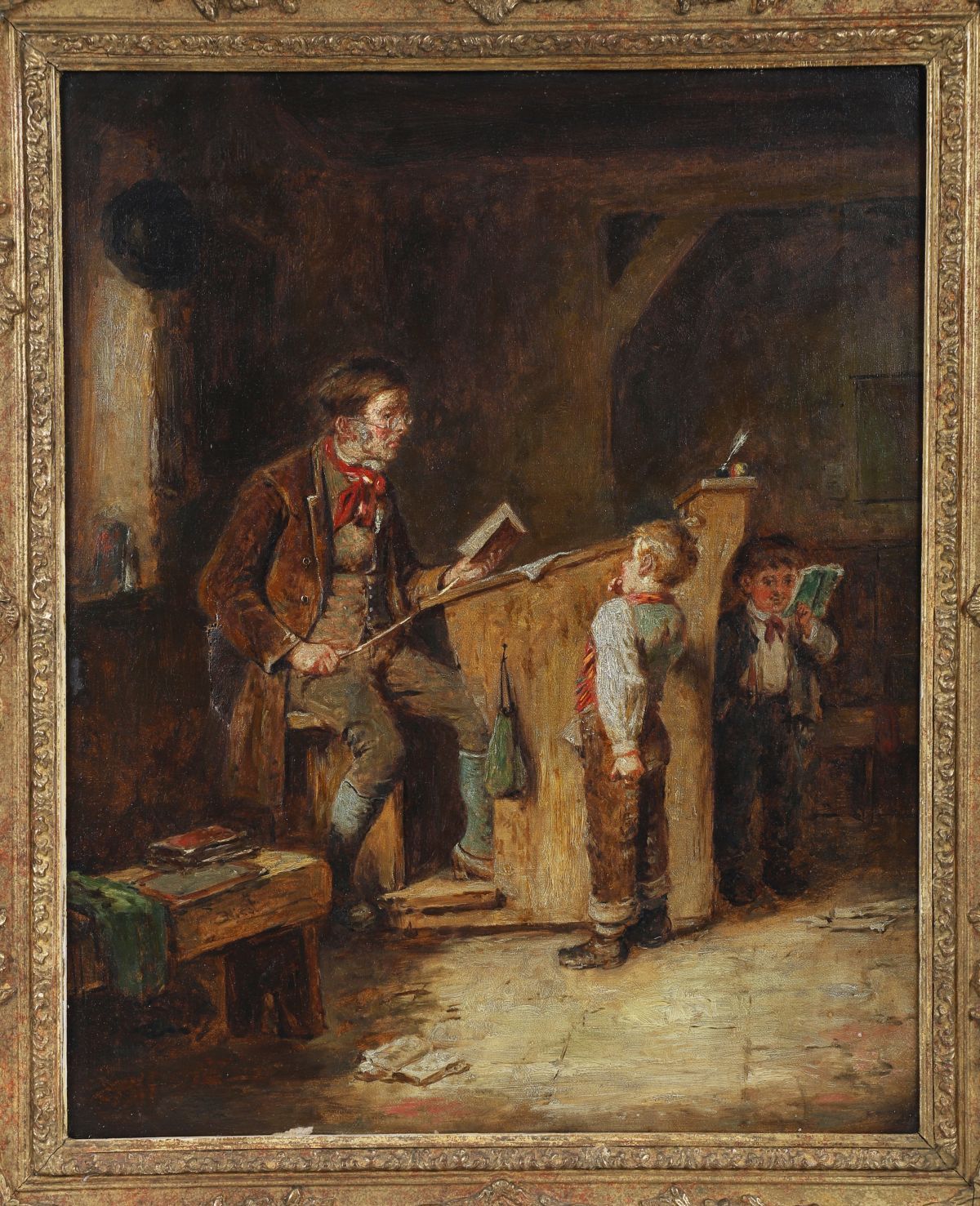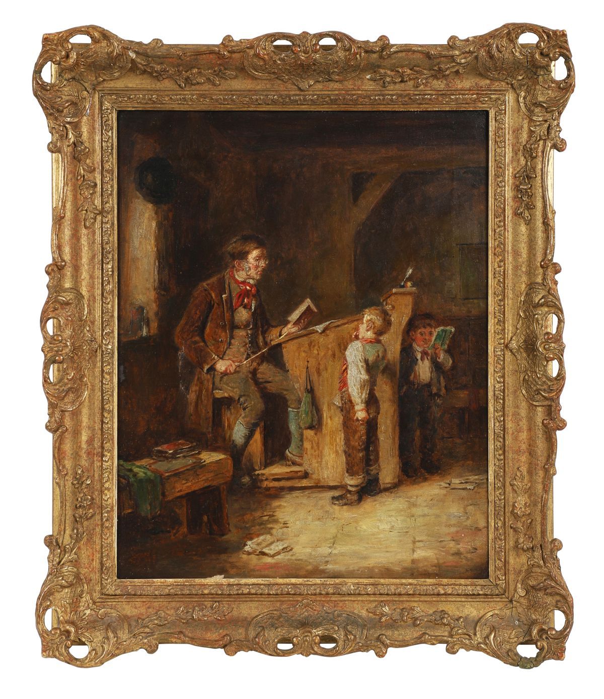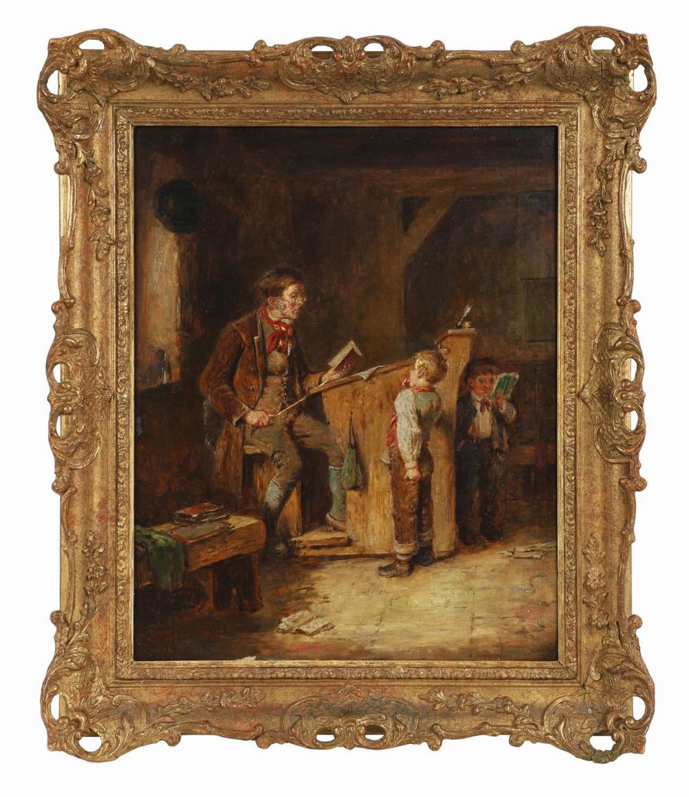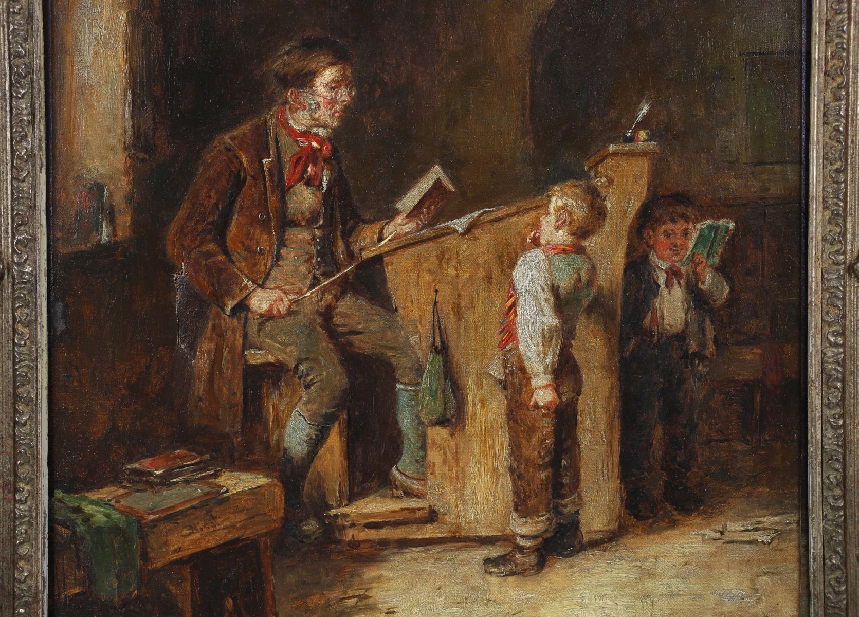 Oil on canvas depicting a rustic interior scene with a schoolmaster instructing two young pupils, one standing uneasily before him while the other reads from a primer. The work captures Nicol’s hallmark blend of realism and humour, reflecting his keen interest in rural Irish character and social observation. The subdued interior tones and careful rendering of light upon the figures evoke the moral gravity and gentle irony typical of the artist’s genre pieces.