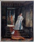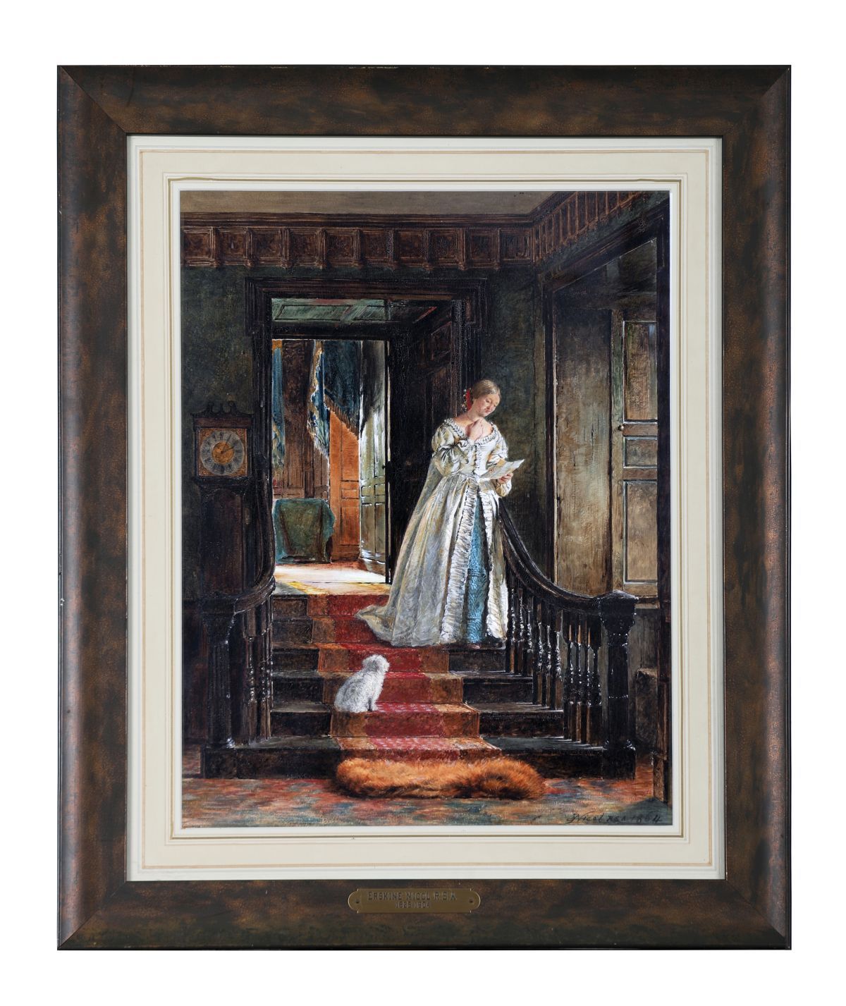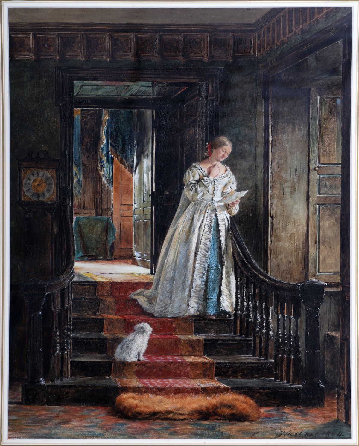 Erskine Nicol R.S.A. (1825–1904), The Love Letter, oil on paper, depicting a young woman reading a letter on a staircase interior, with her small dog seated expectantly at her feet. Signed lower right and presented in a glazed frame with mount.