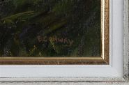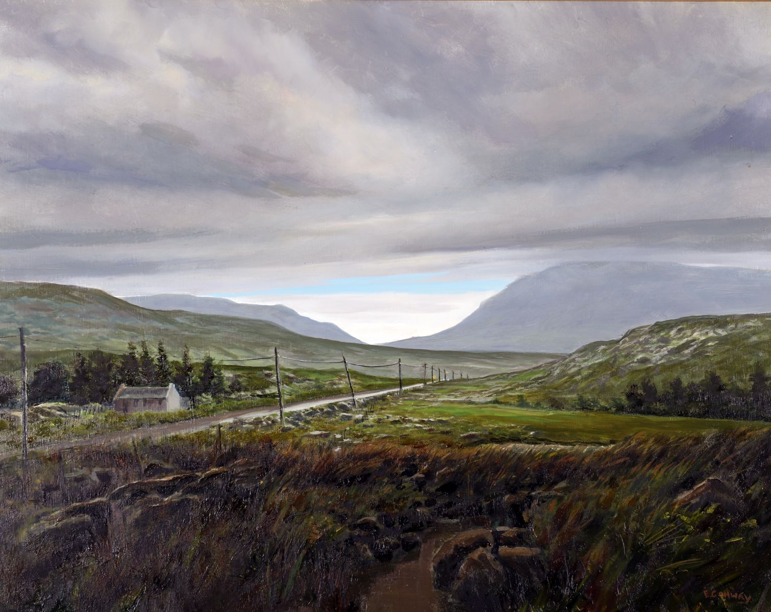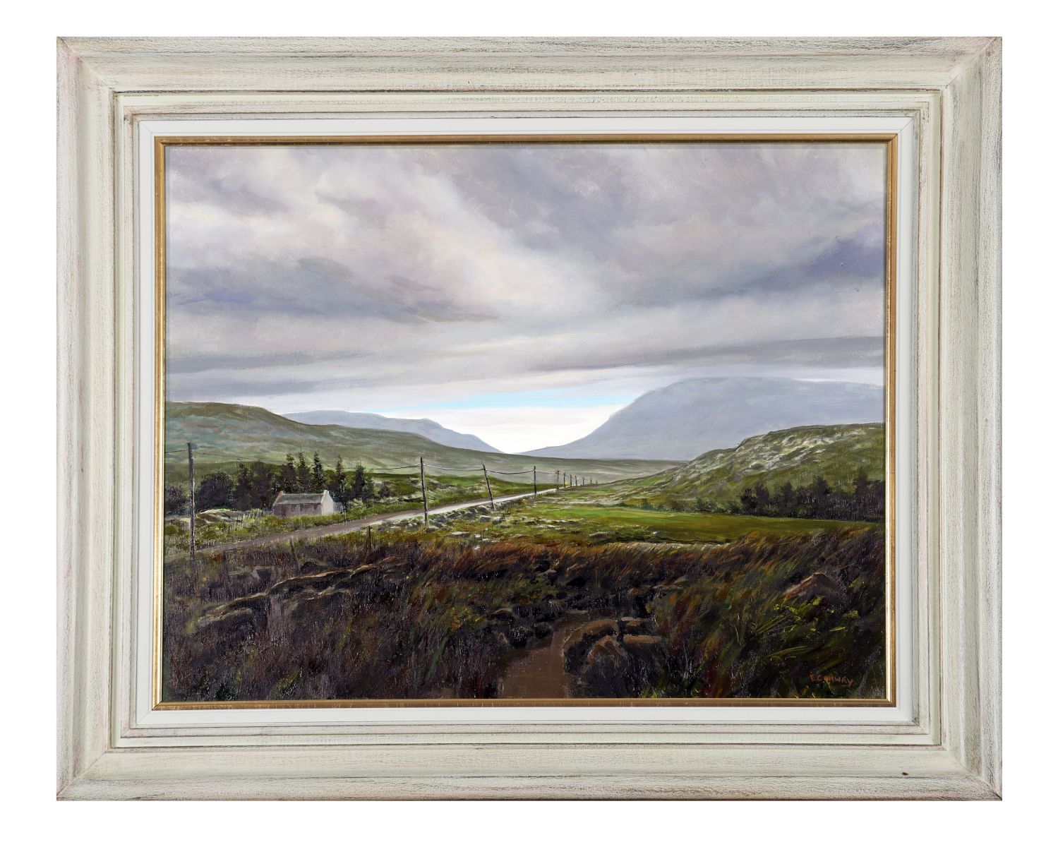 A finely rendered oil on canvas by Eugene Conway depicting a sweeping view of the Mayo countryside under a vast, overcast sky, with a winding rural road leading towards Westport. The artist’s use of layered tones and light masterfully conveys the depth and tranquillity of the western Irish landscape. Signed lower right. Presented in a cream and gilt frame.