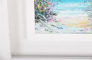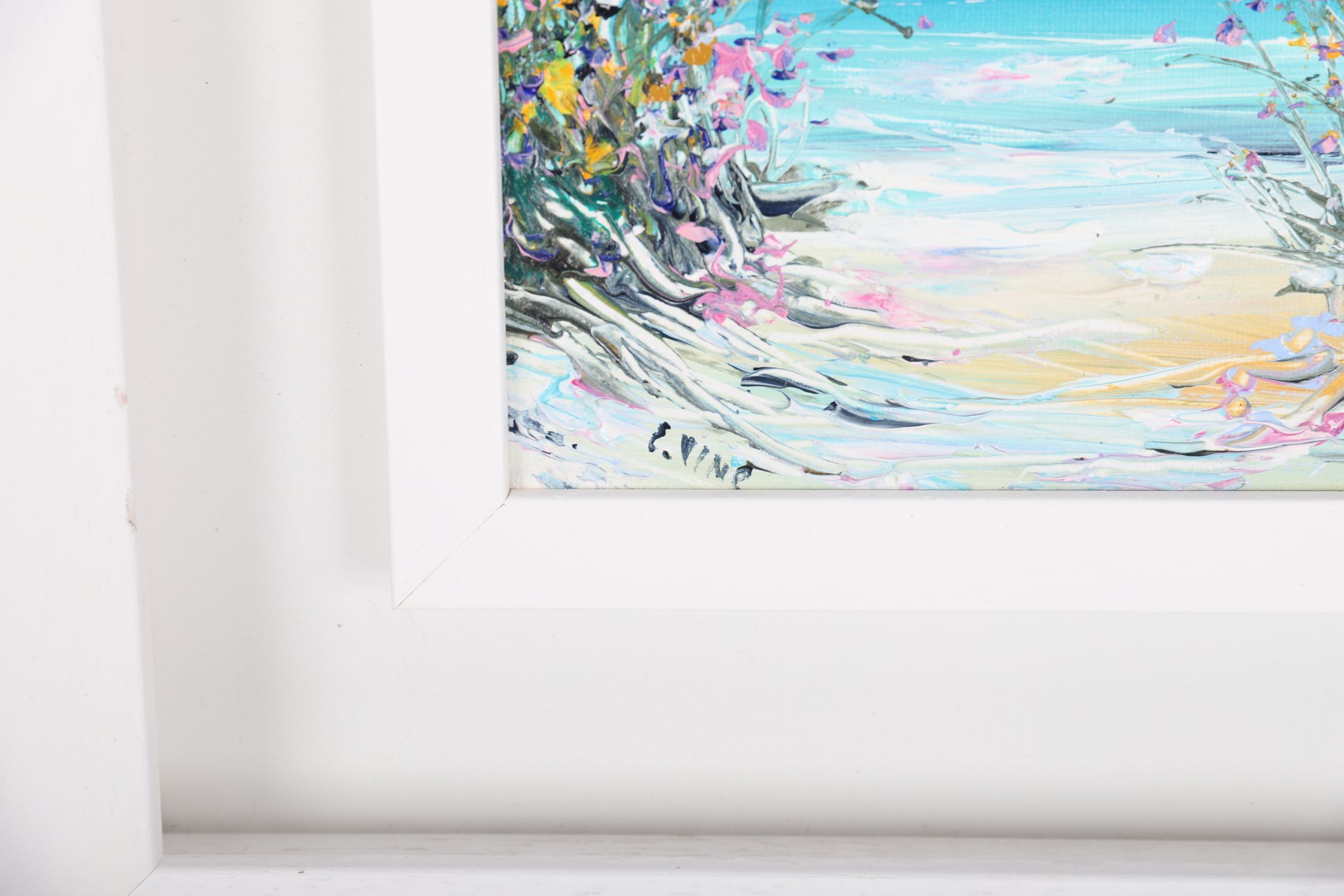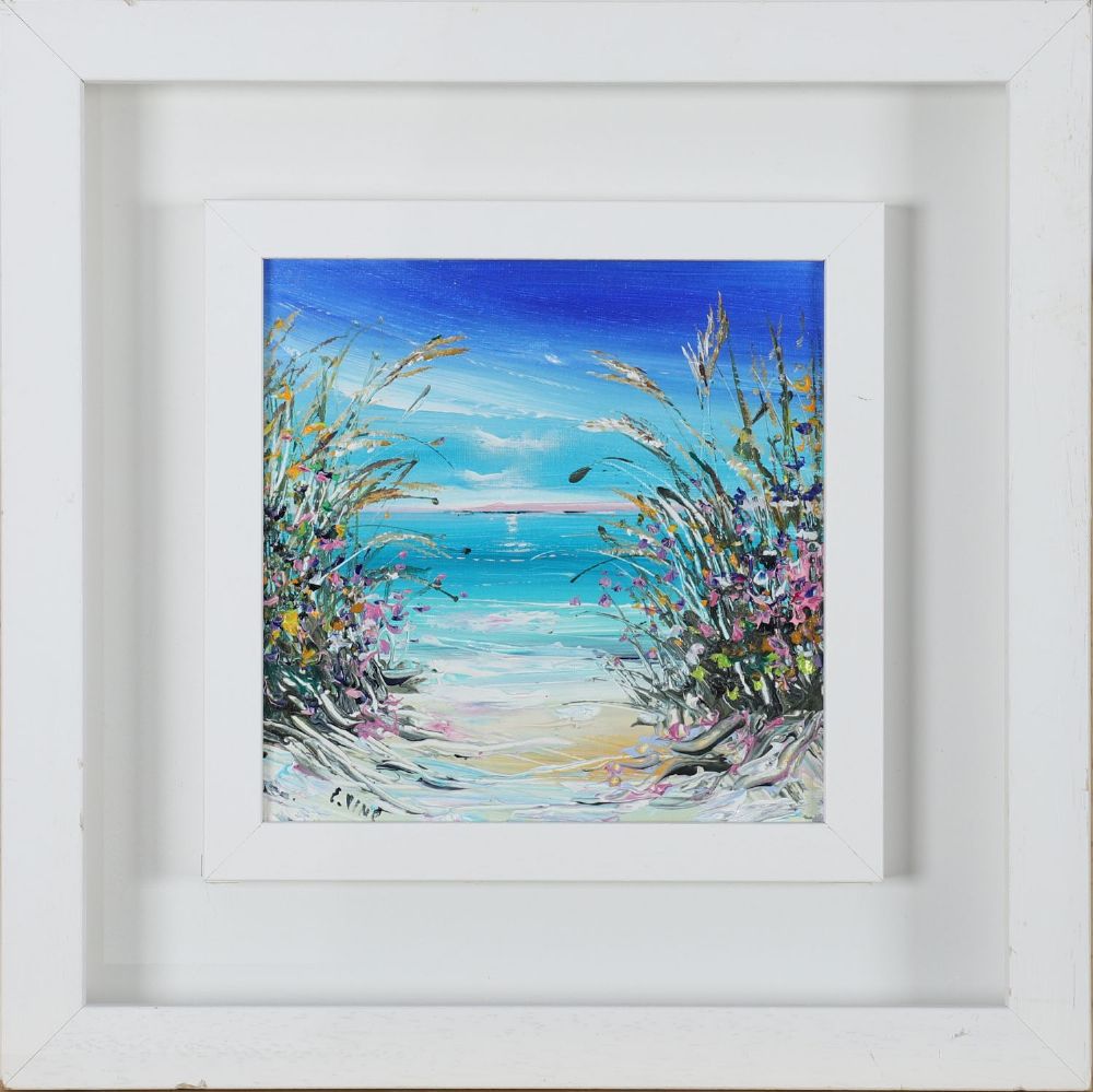An oil on canvas by contemporary artist Evelina Vine, depicting a view of a turquoise sea through flowering grasses and sand dunes under a bright blue sky. The work is painted with thick impasto and expressive palette-knife technique. Signed lower left. Presented in a white painted frame.