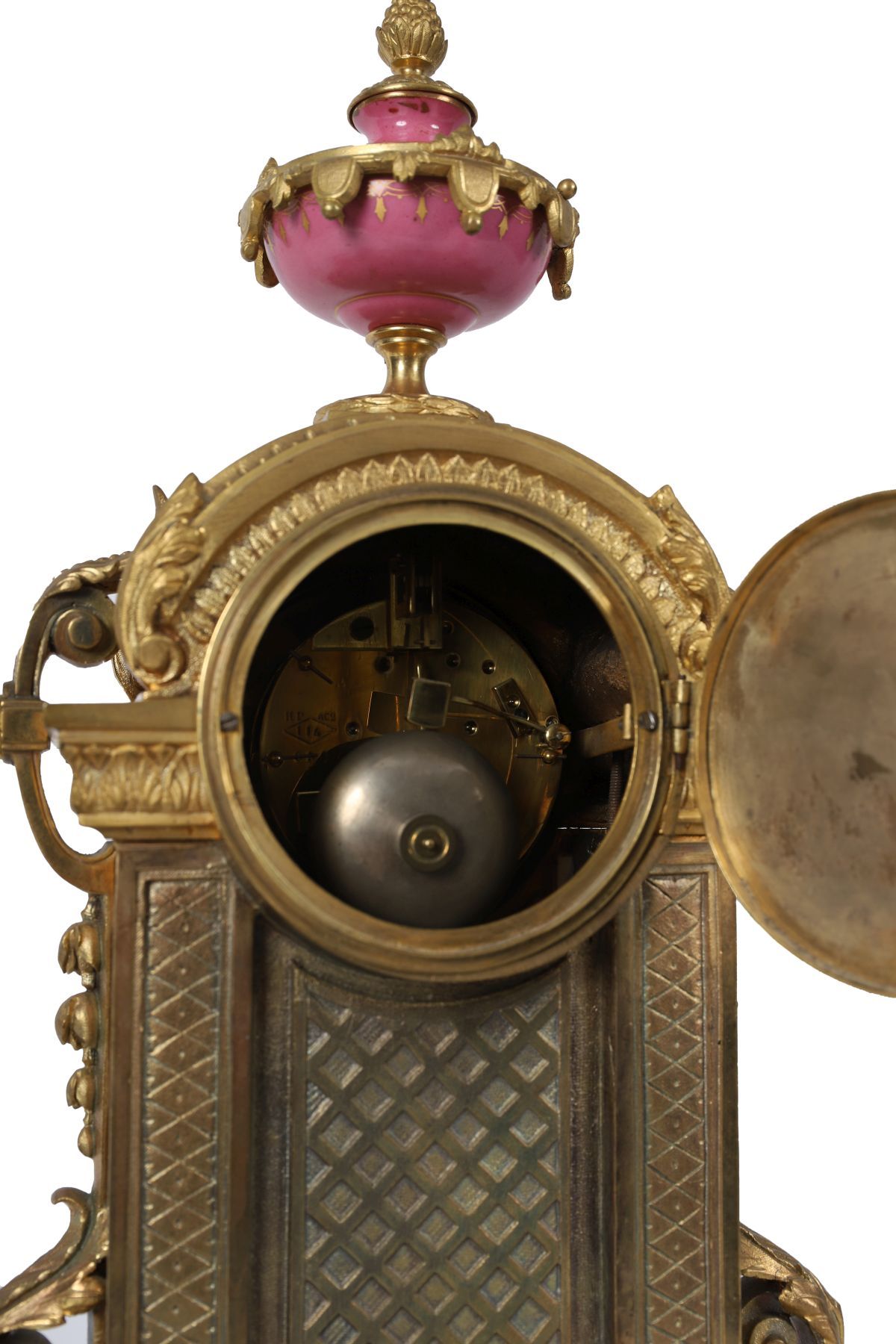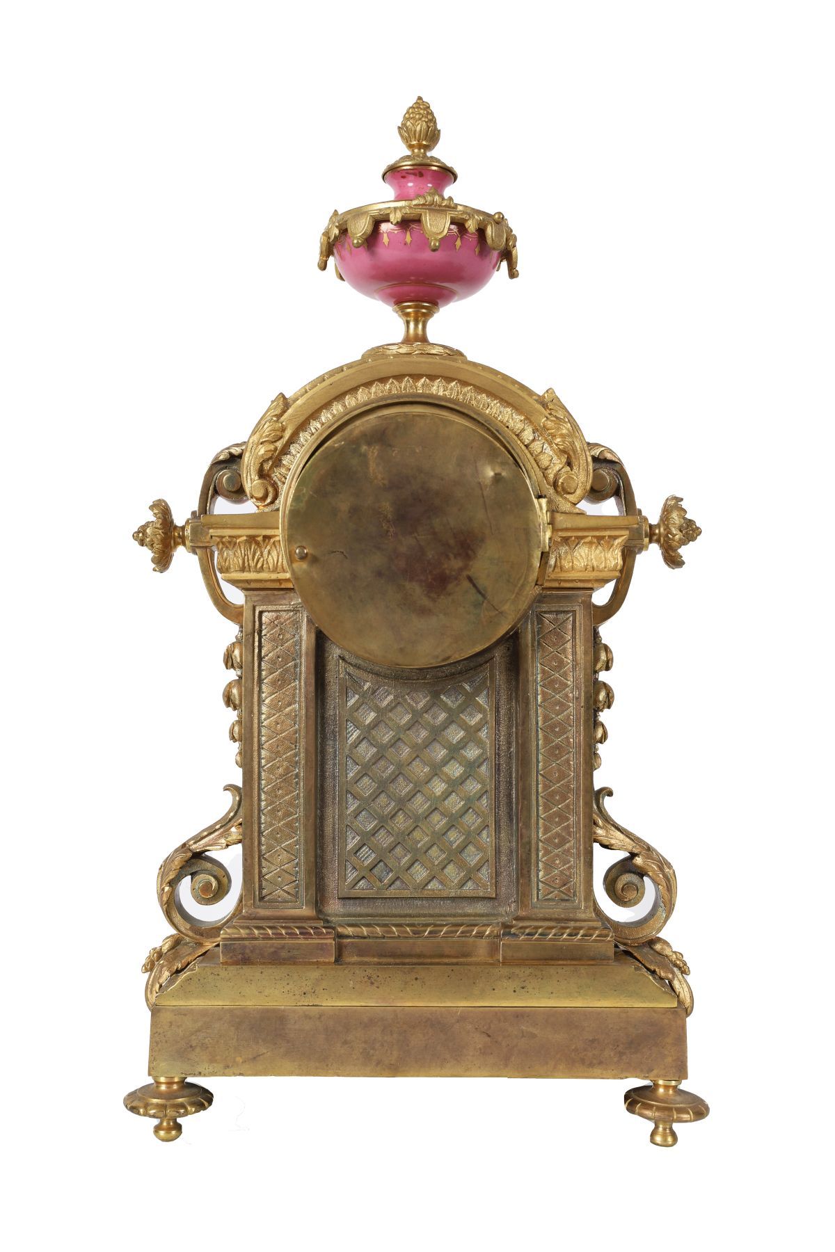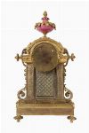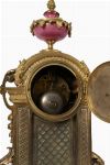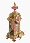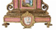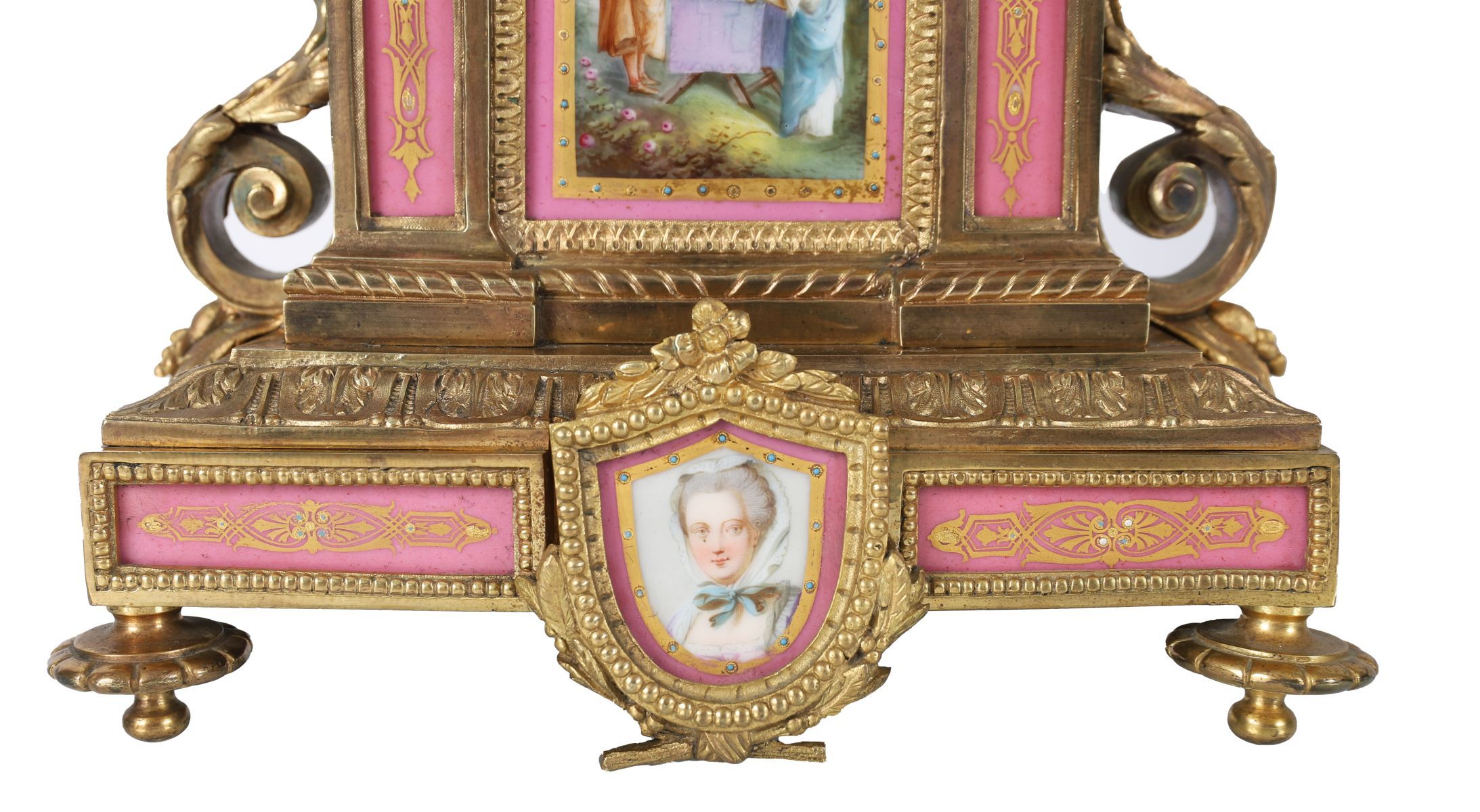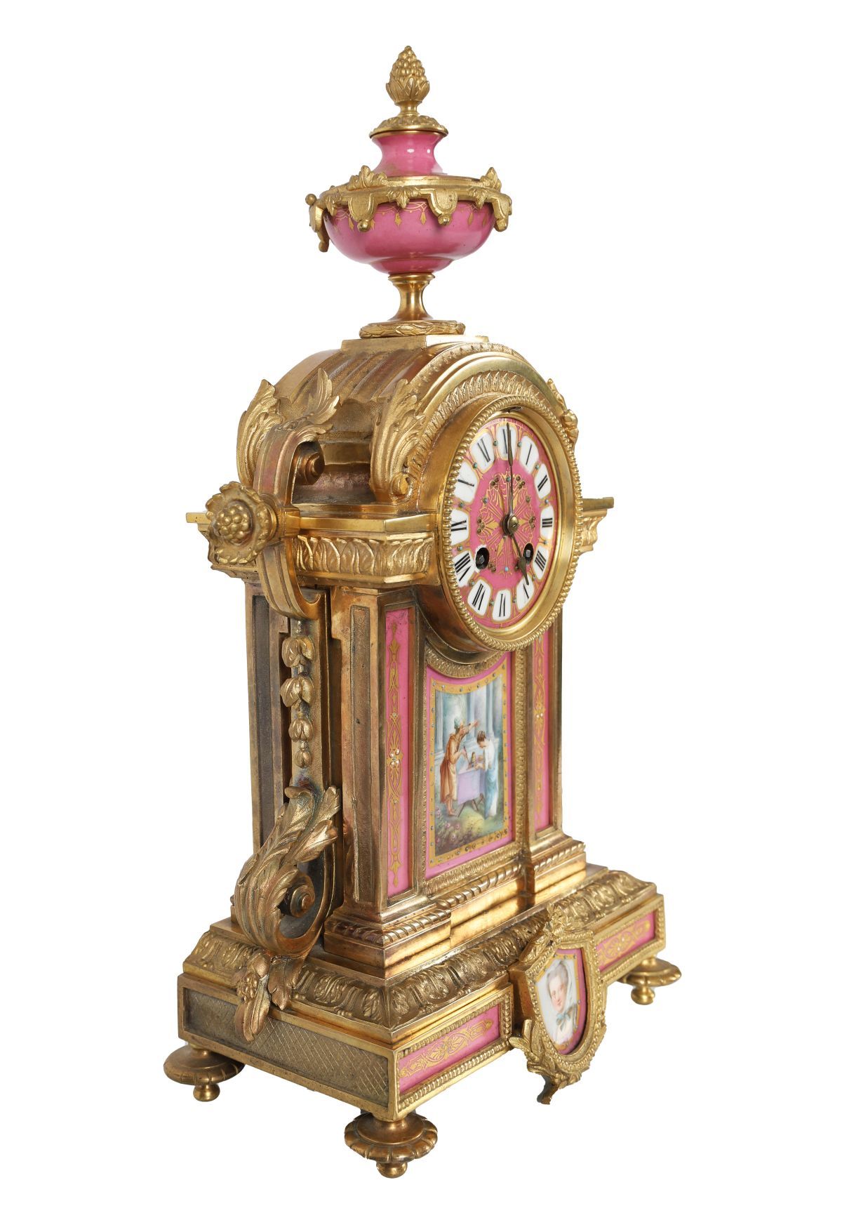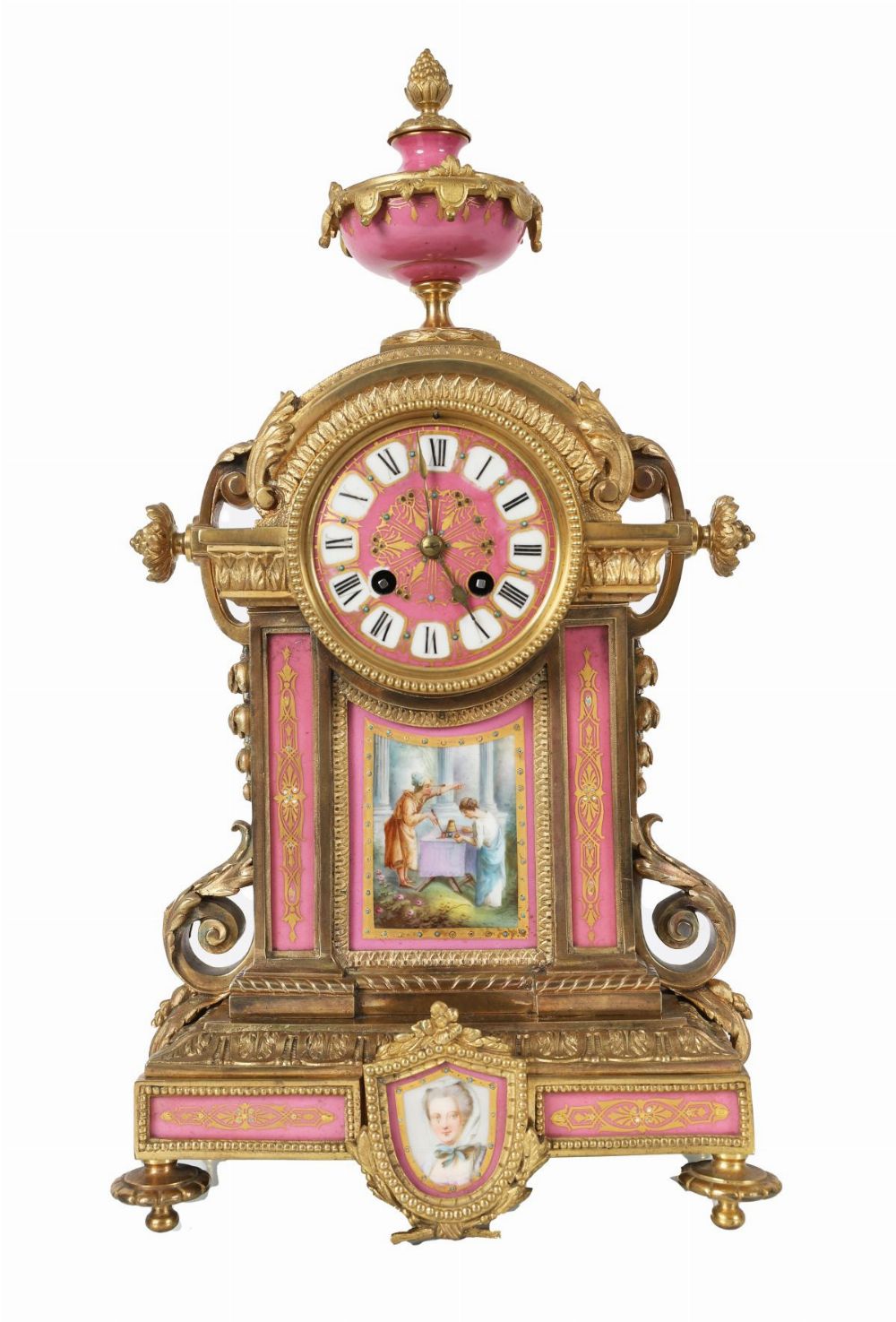 An exceptional French ormolu and Sèvres-style mantel clock, the case richly embellished in pink porcelain panels hand-painted with romantic and portrait scenes within gilt frames. The enamel dial with Roman numerals surmounted by an urn finial.