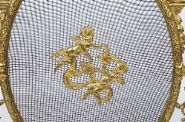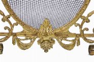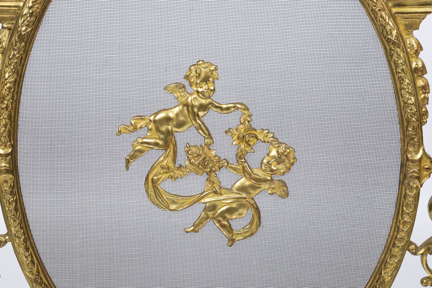 An exceptional 19th-century French ormolu fire screen, the oval frame enclosing a mesh centre mounted with cherubs, musical trophies and crossed standards below a crest of arms surmounted by plumed helmets. Richly cast and chased with Rococo and neoclassical ornamentation, raised on scroll feet.