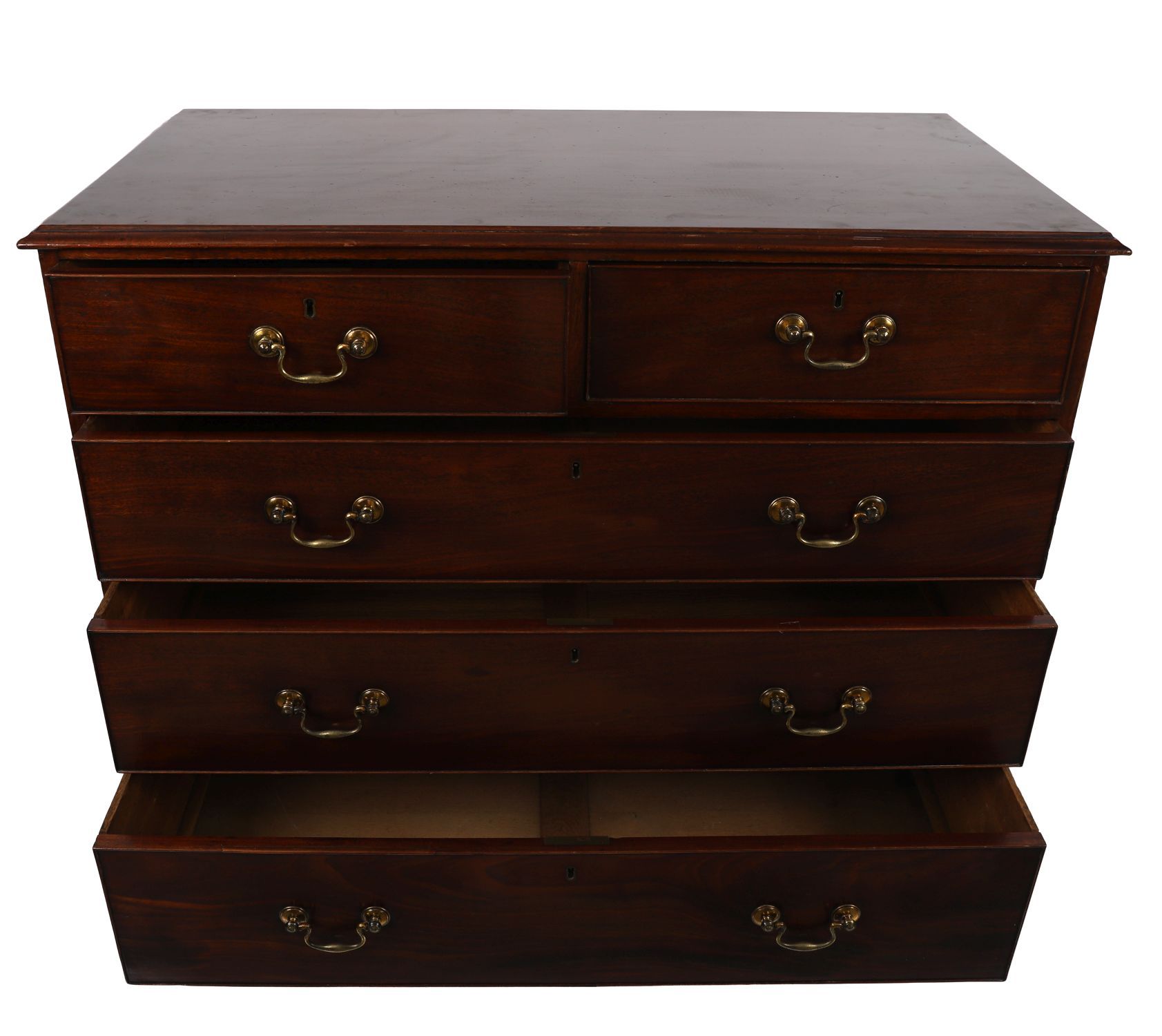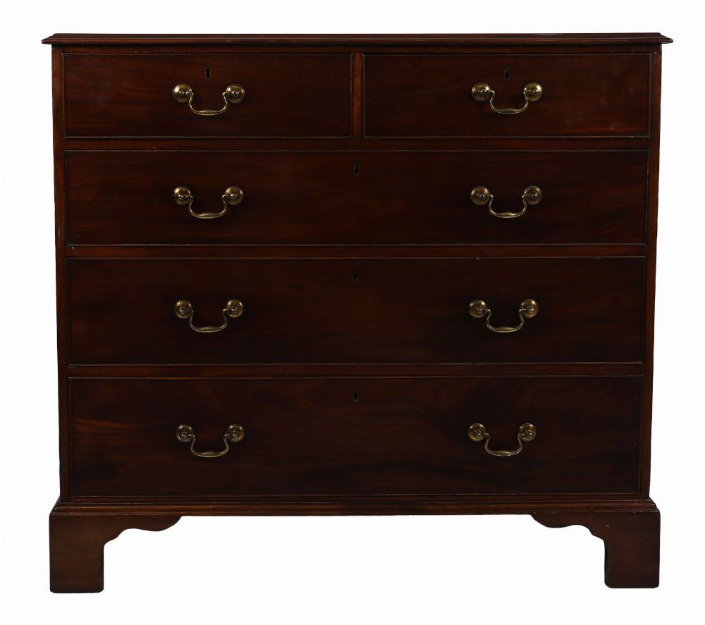 A mid-18th-century George II chest of drawers, the rectangular top above two short and three long drawers with brass handles, raised on bracket feet, displaying fine colour and patination.