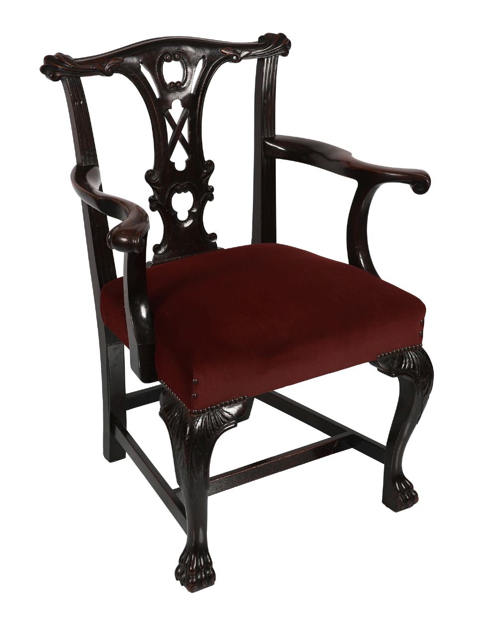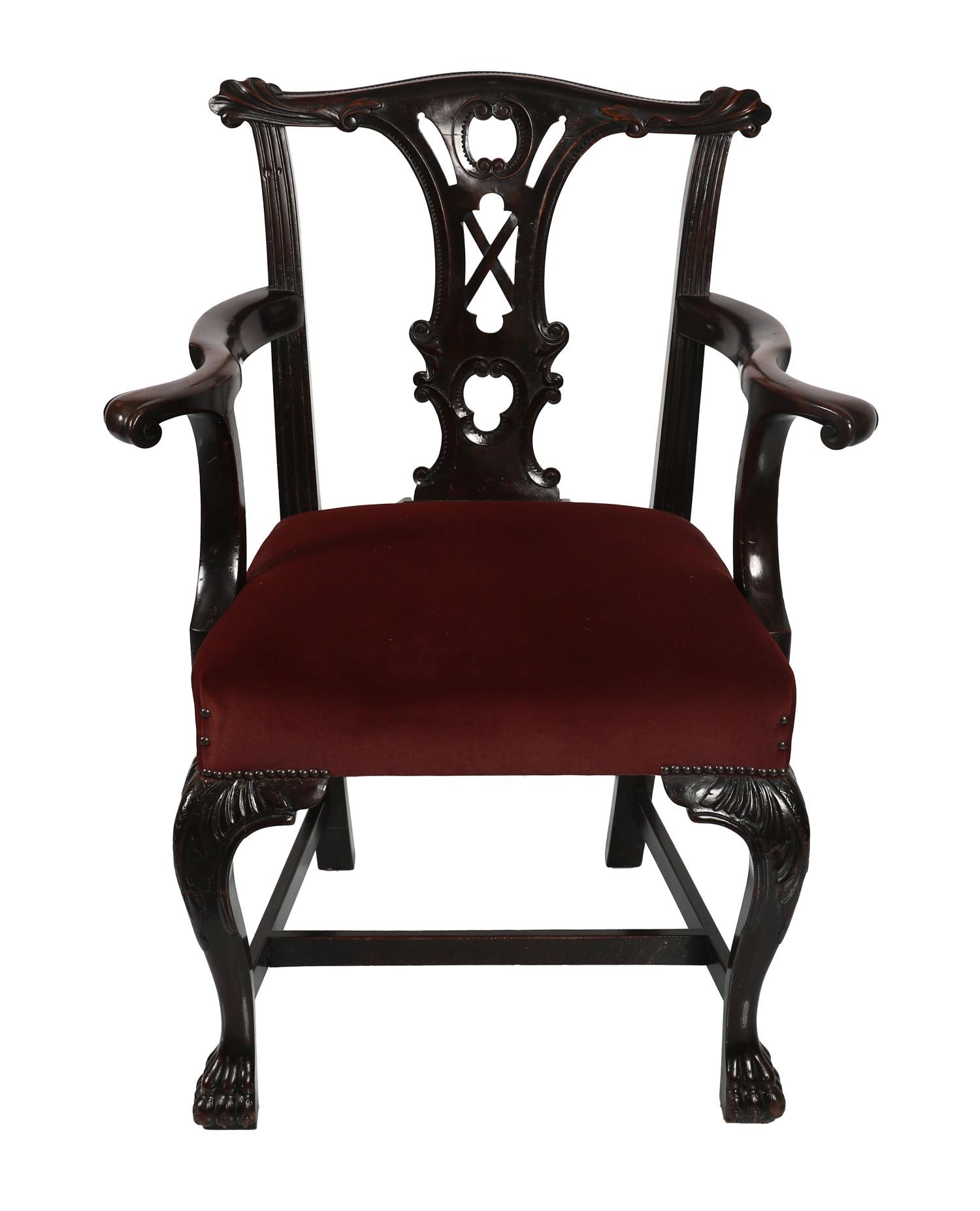 A richly carved Chippendale mahogany elbow chair attributed to Butler of Dublin, with serpentine crest rail above a pierced vase-shaped splat and stuff-over seat, raised on acanthus leaf-carved cabriole forelegs joined by stretcher rails, and terminating in paw feet.