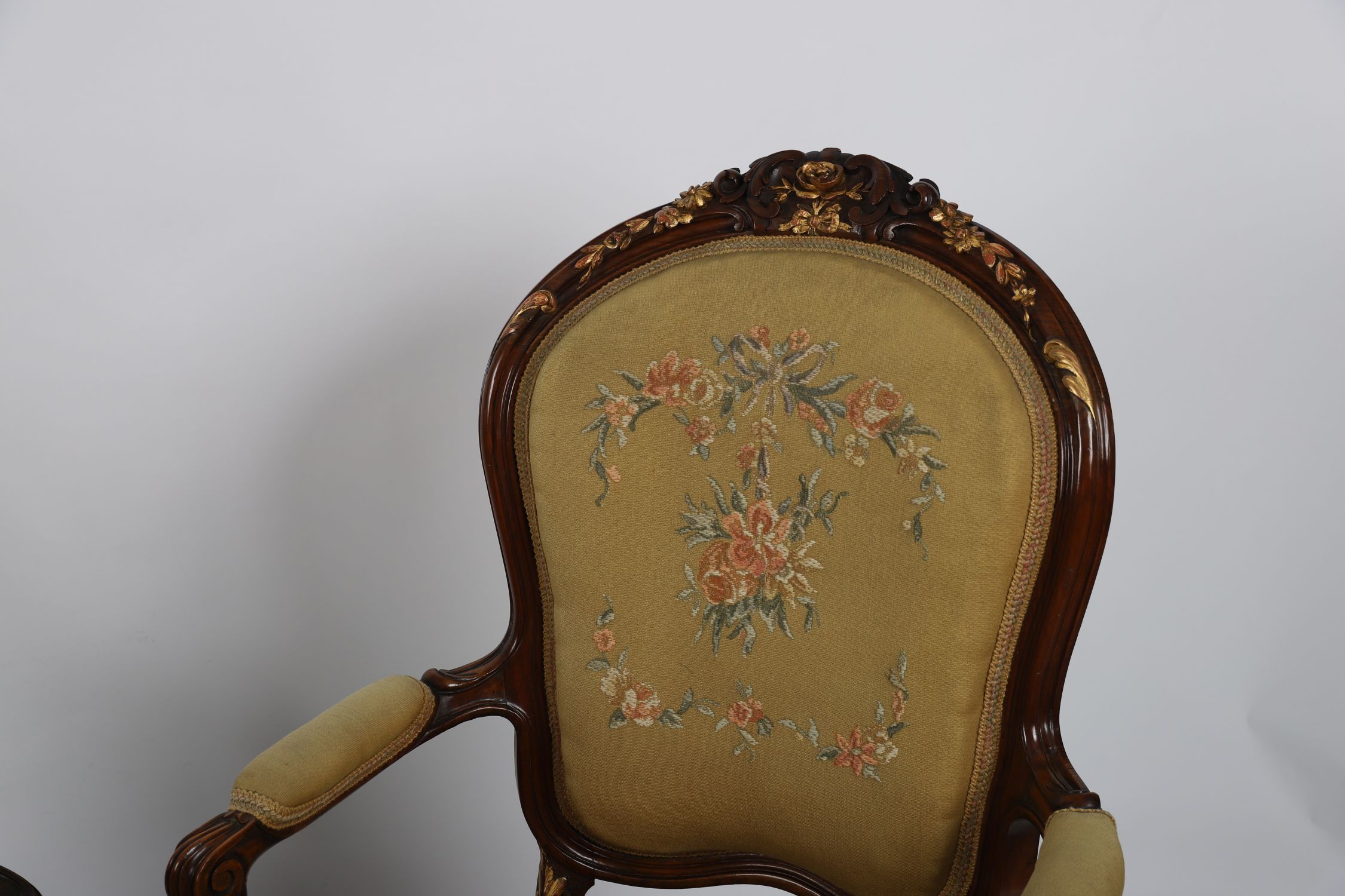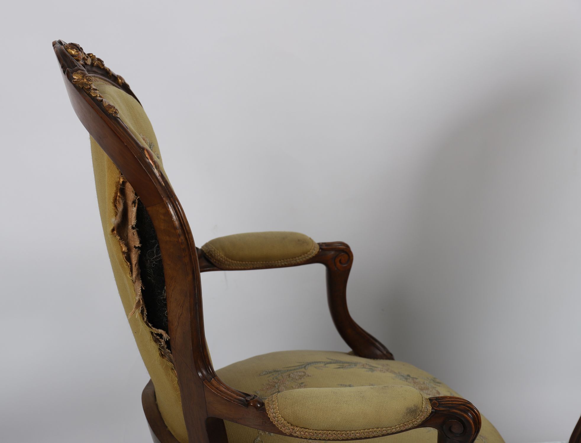A pair of finely carved walnut armchairs, the frames enriched with parcel gilt, upholstered in gold damask with floral embroidery.