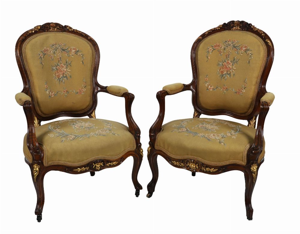 Lot 431 EXCEPTIONAL PAIR OF WALNUT AND PARCEL-GILT ARMCHAIRS