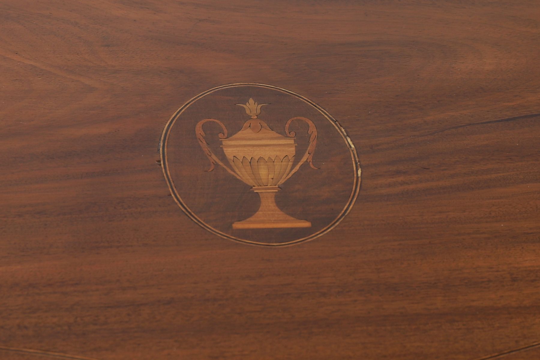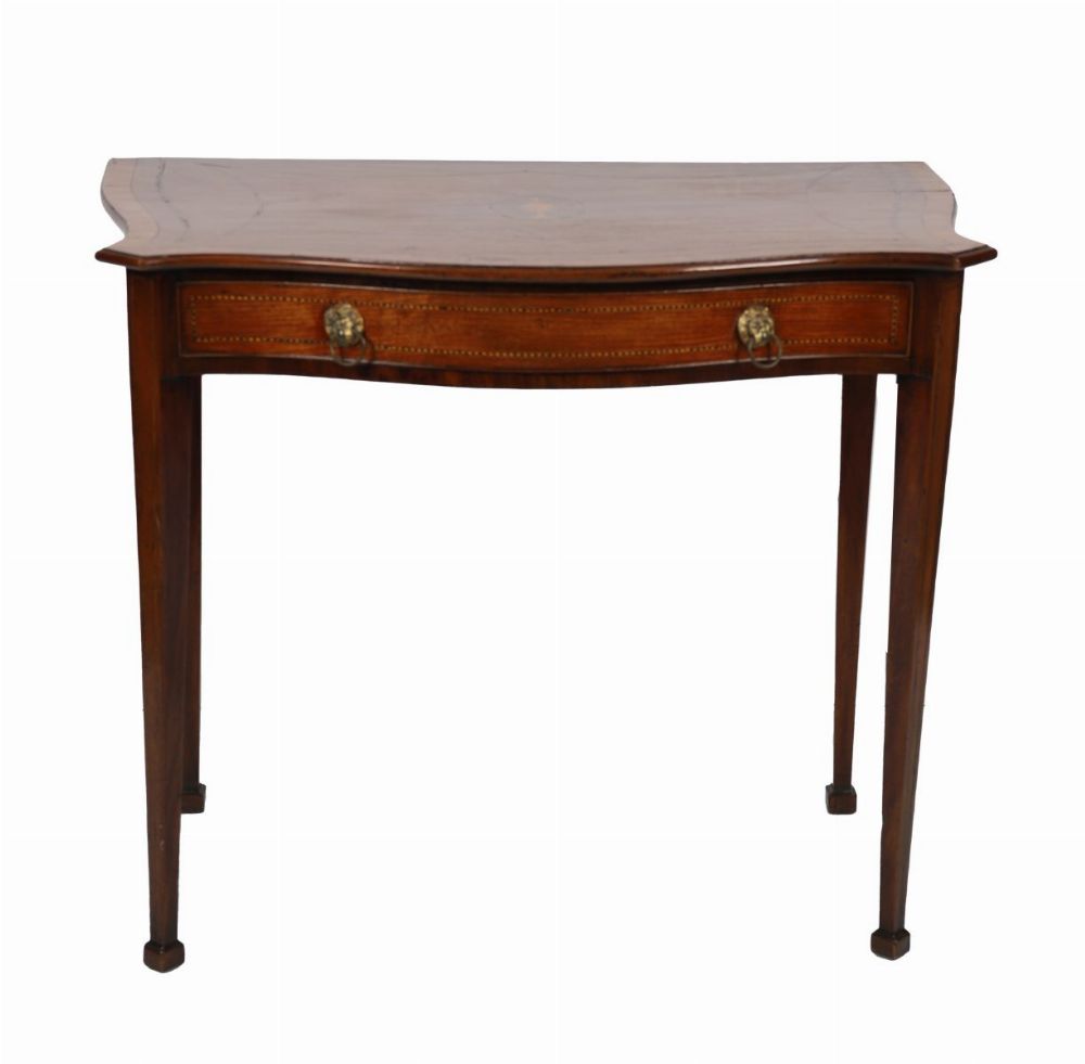 Late 18th century. An exceptional Sheraton period serpentine front side table, finely inlaid with satinwood stringing and a central urn motif, fitted with a single drawer and raised on elegant square tapering legs with spade feet.