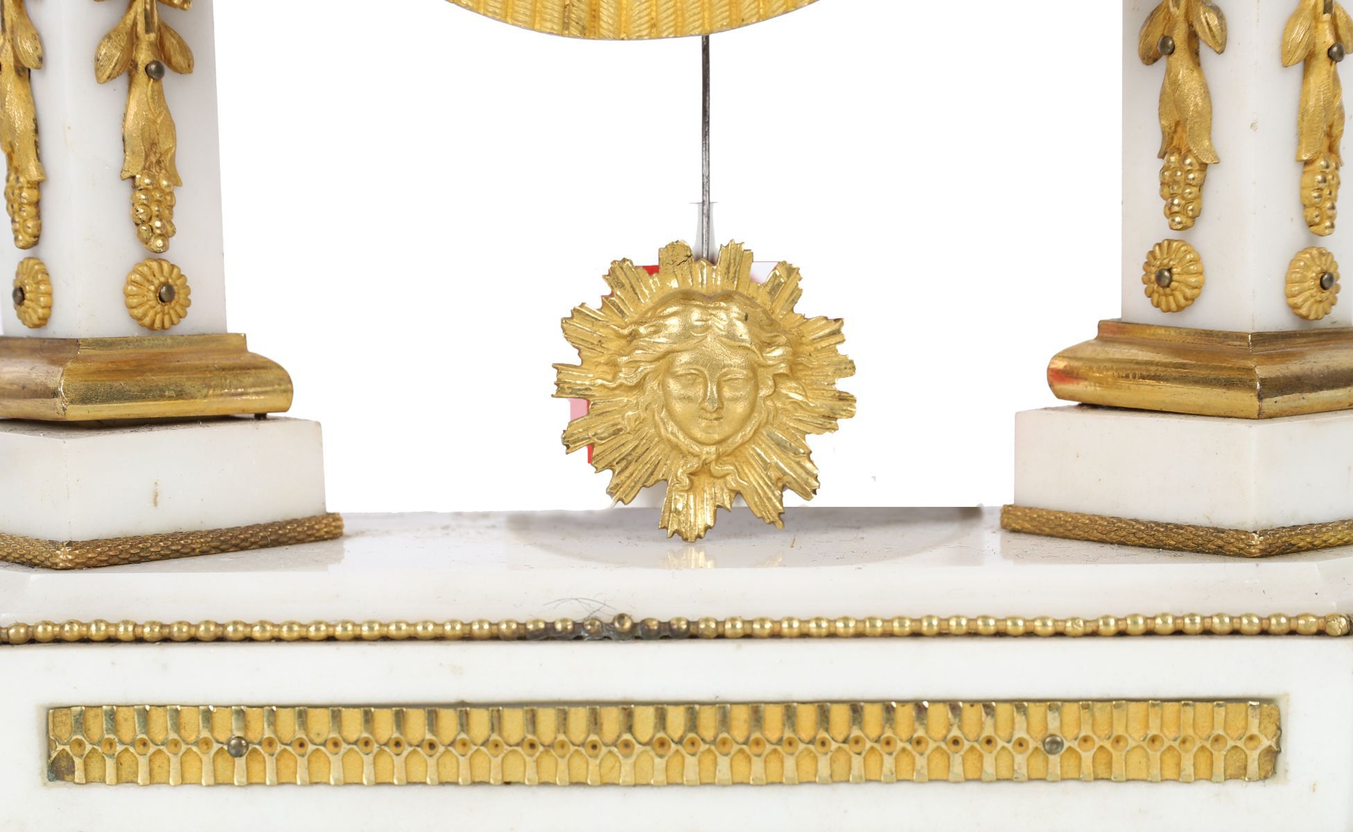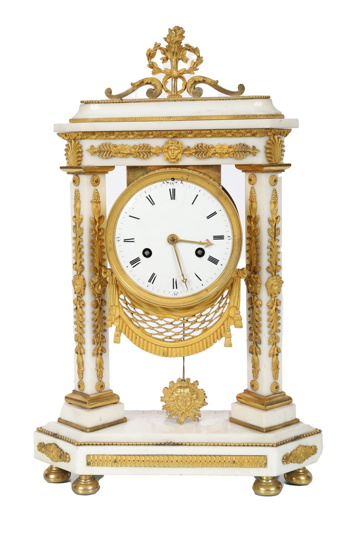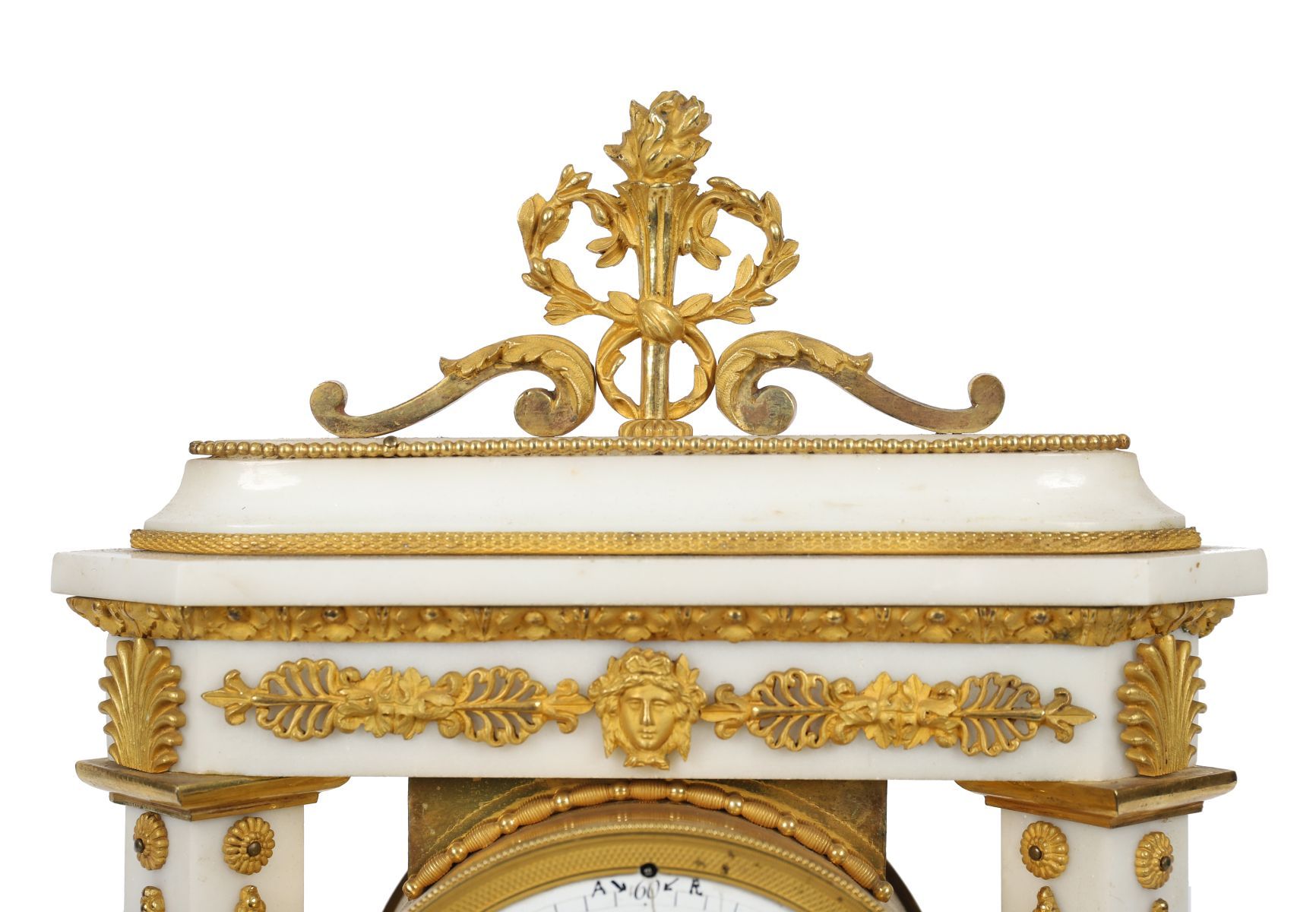 An exceptionally fine French mantel clock of statuary white marble and gilt bronze, the classical architectural case surmounted by a pierced anthemion cresting, the dial with Roman numerals within a finely chased ormolu bezel. The fluted supports and foliate mounts of exquisite quality, resting on a plinth base with toupie feet.