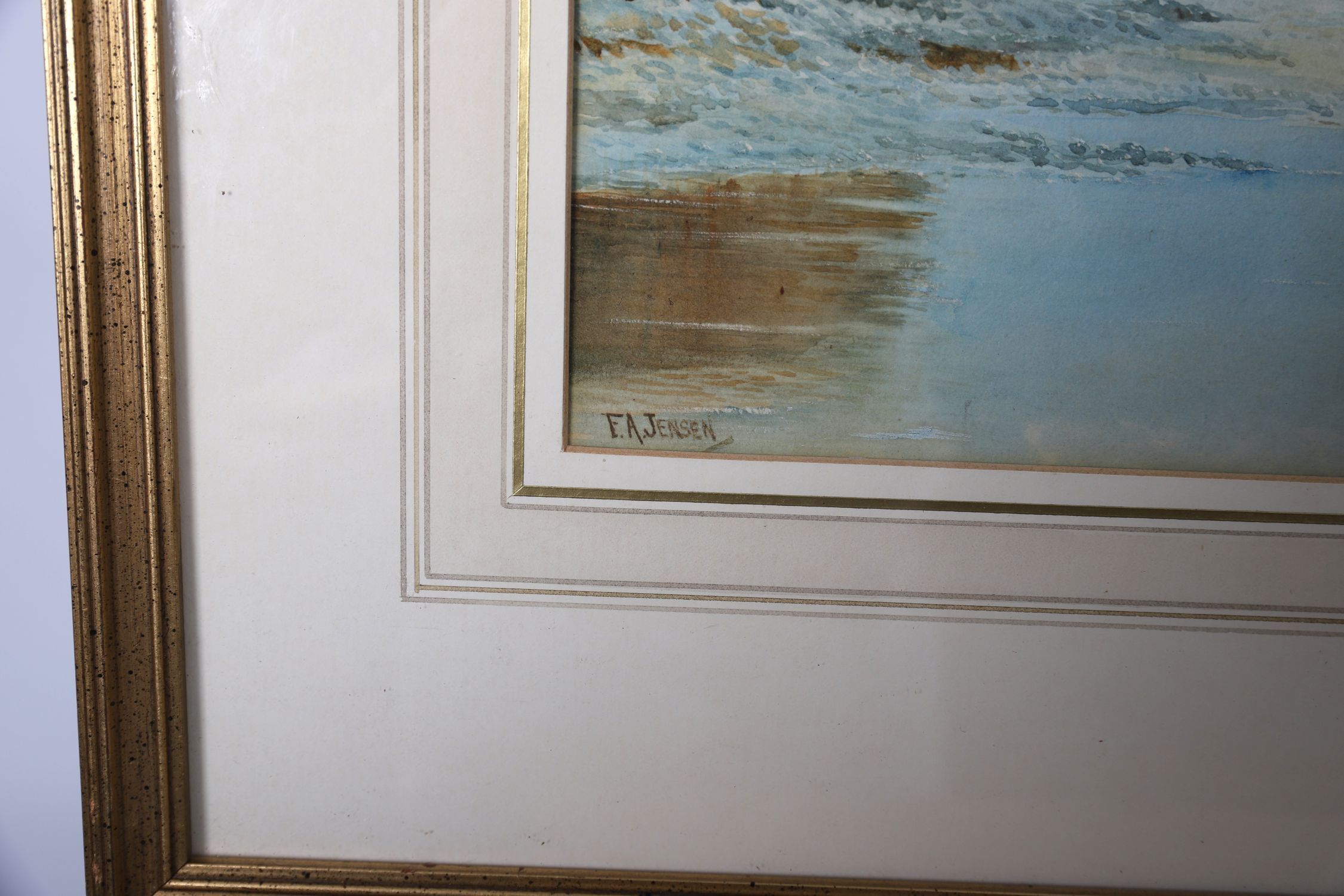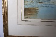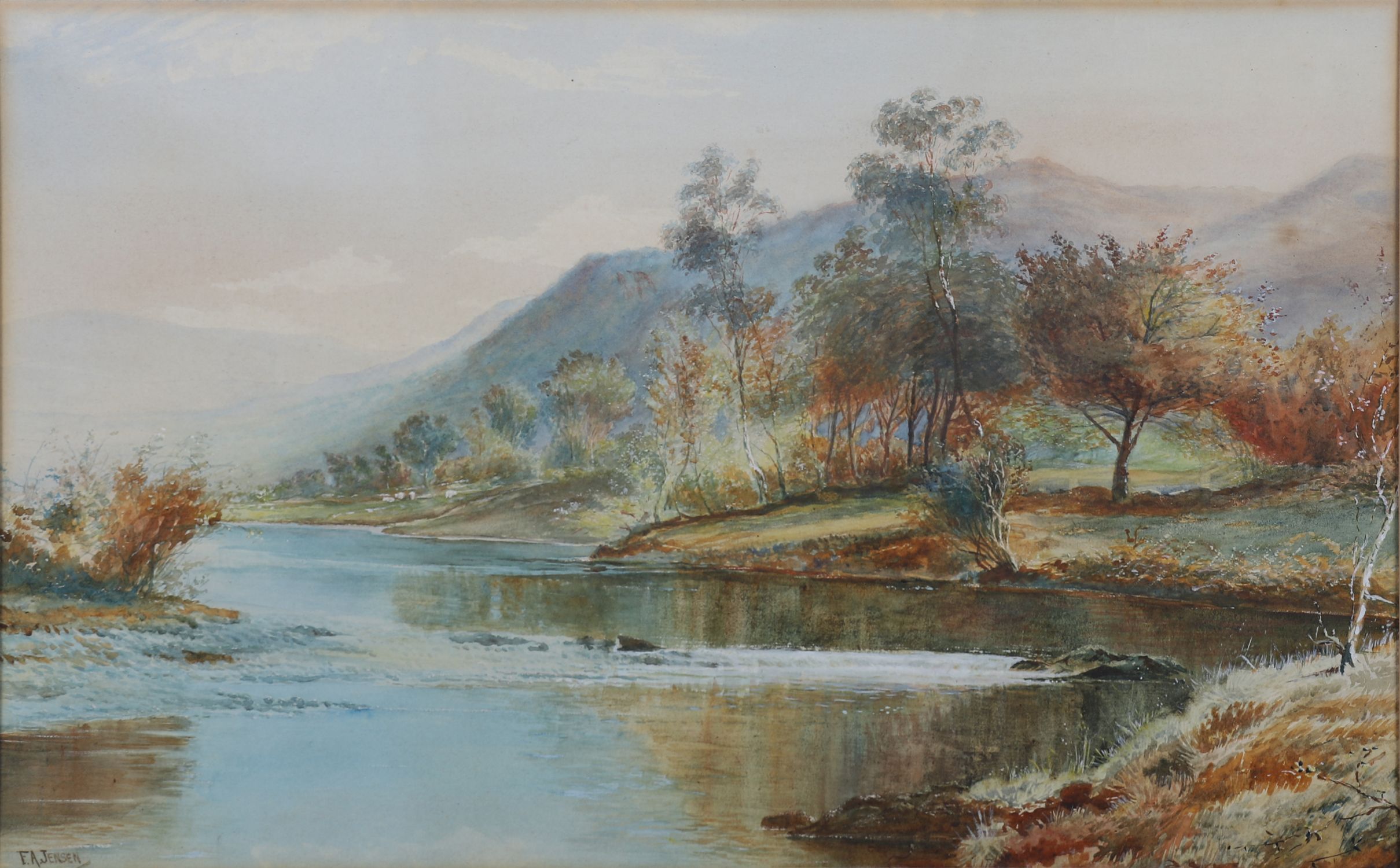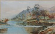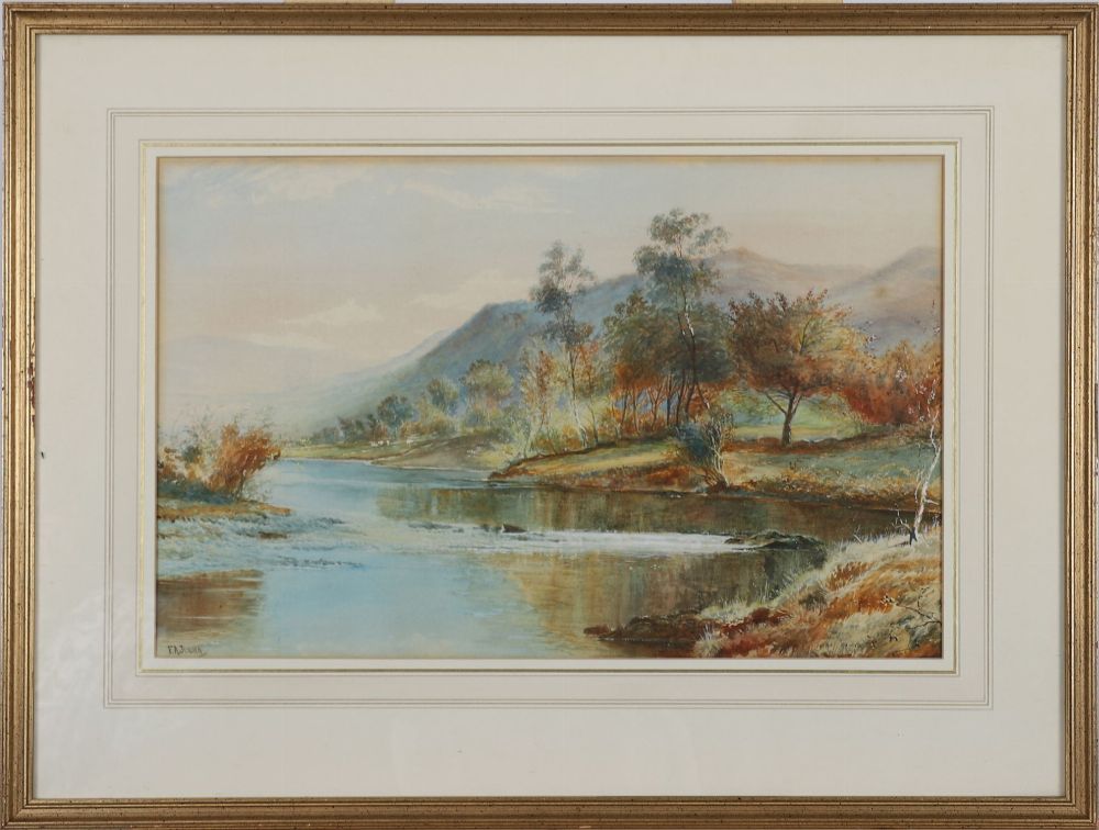 Watercolour on paper, depicting a calm river landscape with distant hills and autumn foliage. Mounted and framed. Watercolour.