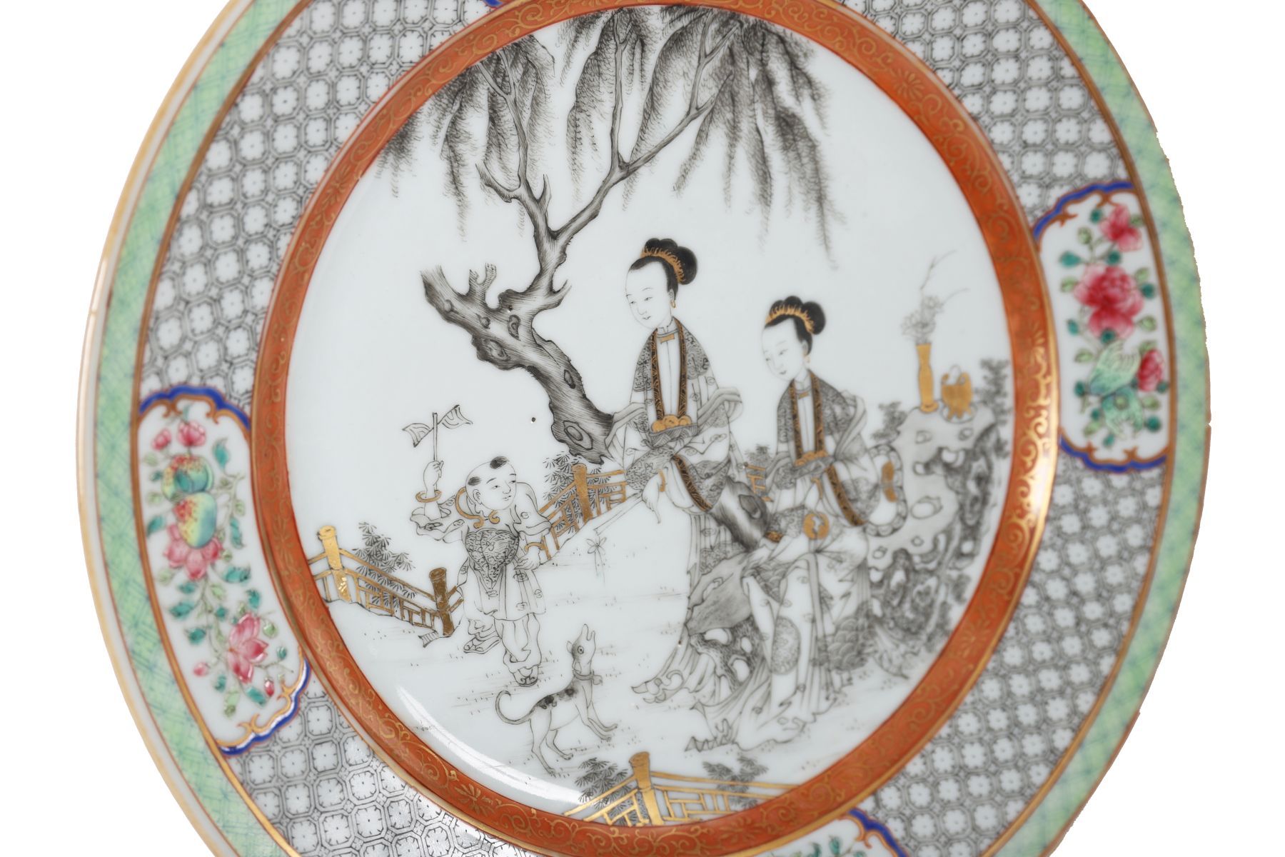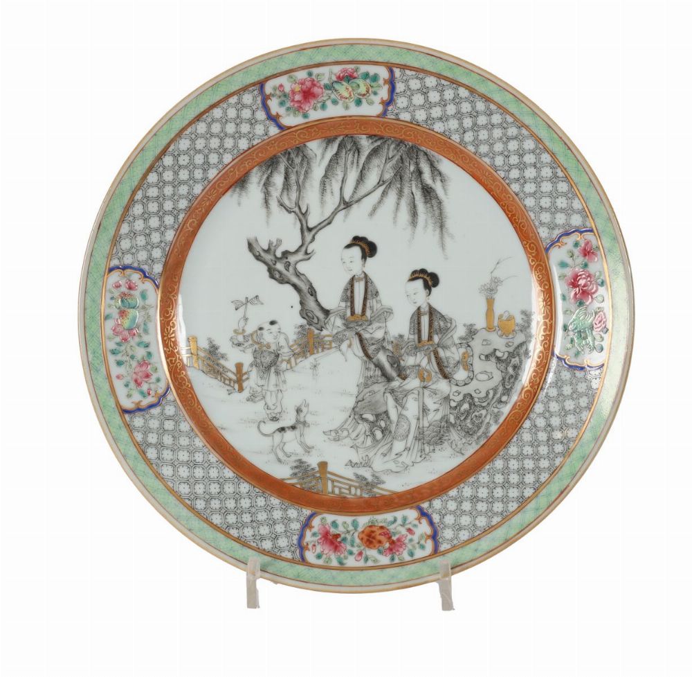 A polychrome porcelain plate depicting two court ladies and an attendant in a garden landscape with a dog and tree, surrounded by a patterned border with floral reserves and gilt detailing.