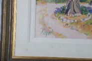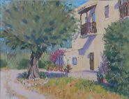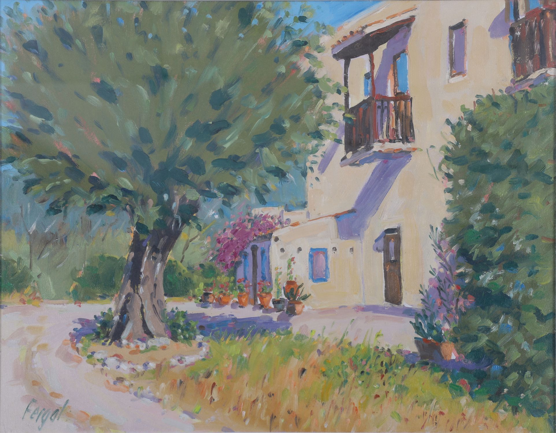 Oil on board depicting a sunlit Ibizan villa surrounded by trees and flowering shrubs. Signed lower right. Framed.