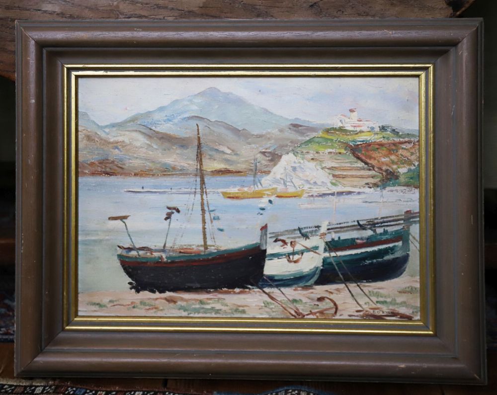 Coastal scene with fishing boats drawn up on shore, signed. Framed. Oil on board.
