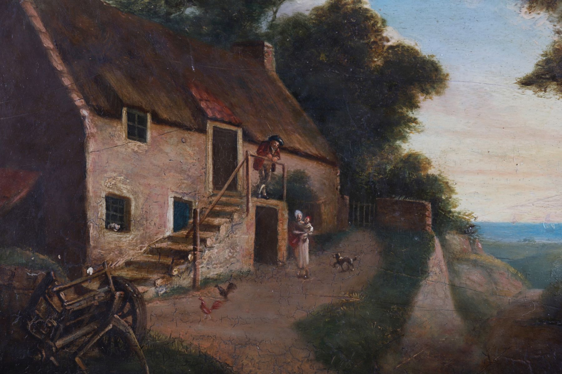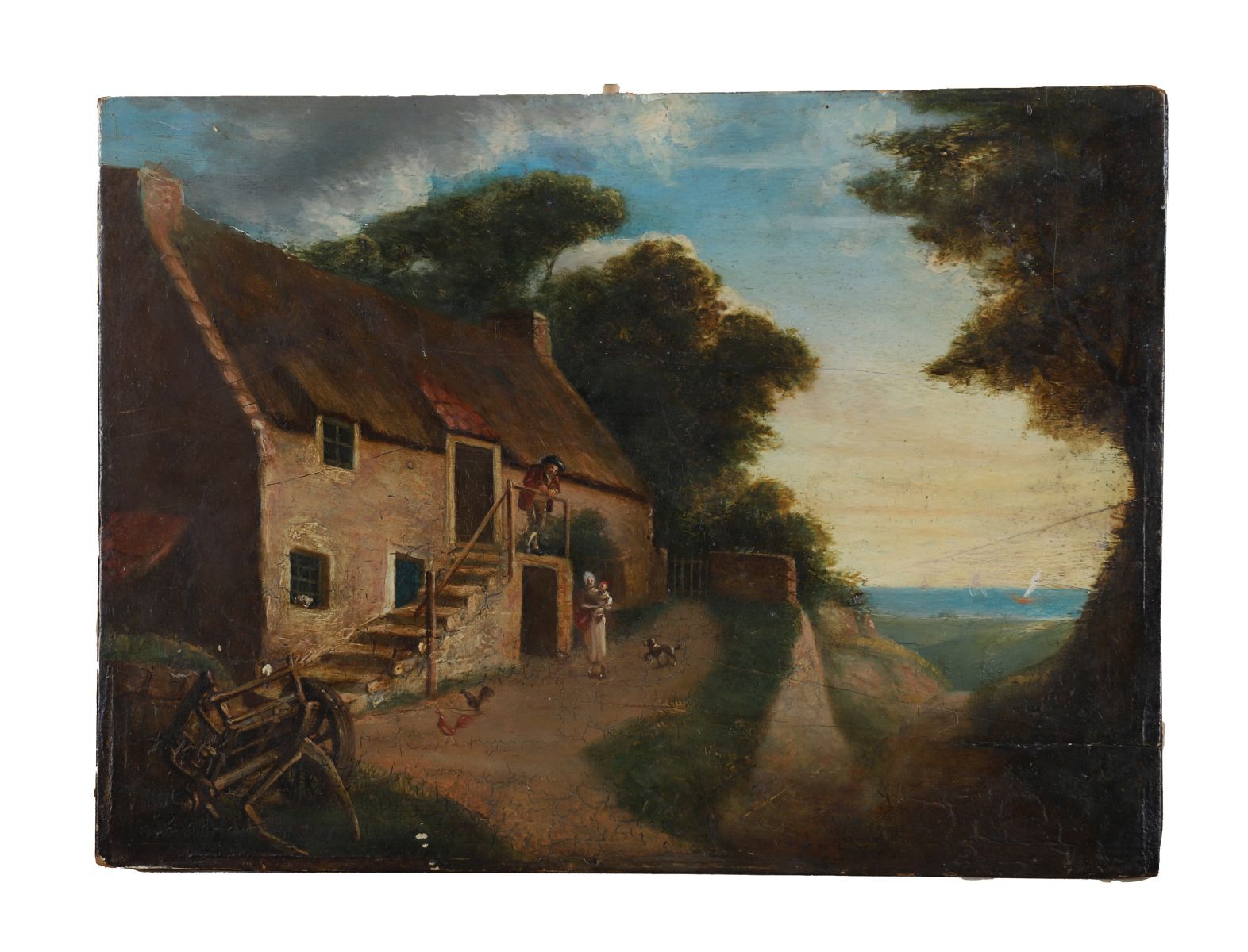 Lot 1024 FIGURES BEFORE A COTTAGE, COAST LANDSCAPE BEYOND