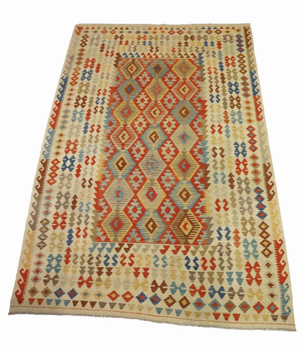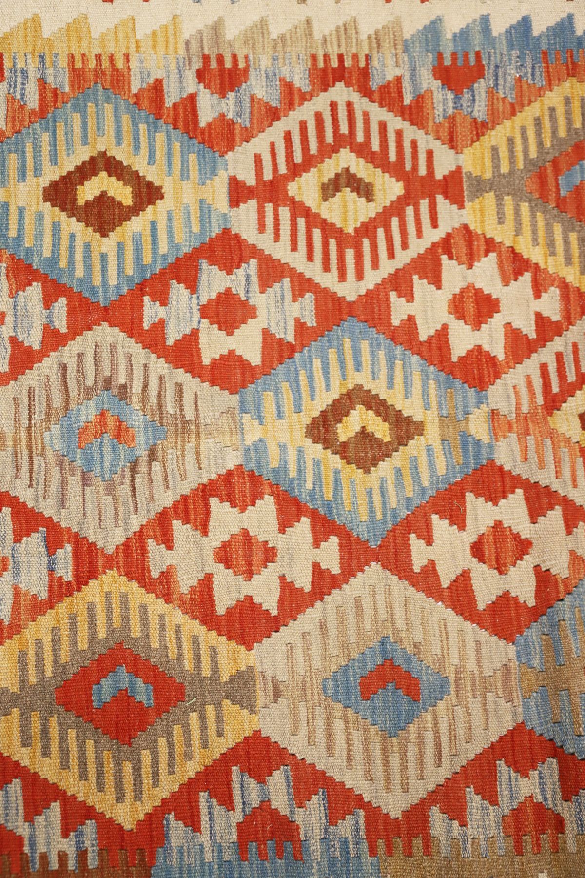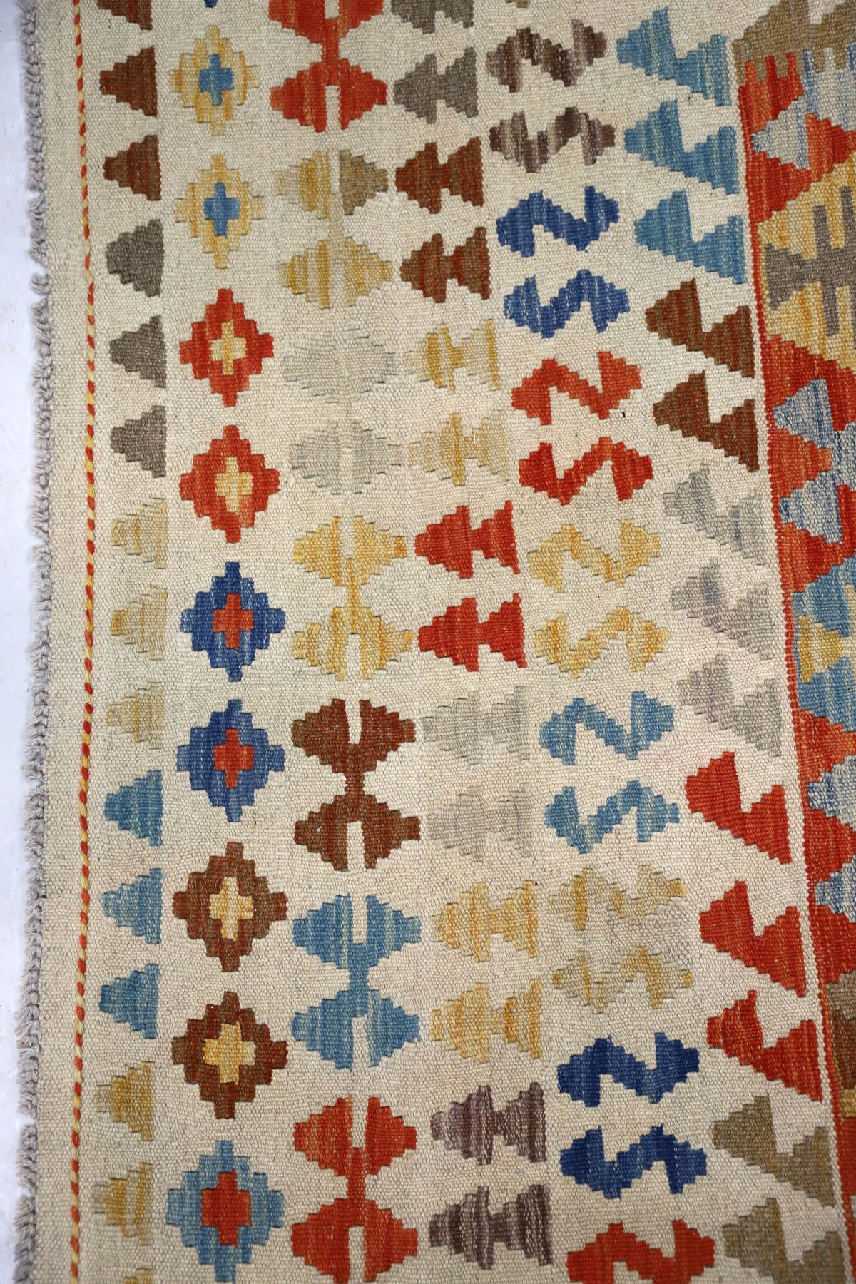 the field with an all-over arrangement of stepped diamond motifs in soft red, teal, ochre and muted blue, framed by a broad ivory border decorated with repeating geometric and tribal devices. Vegetable dyed.