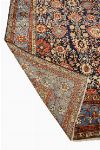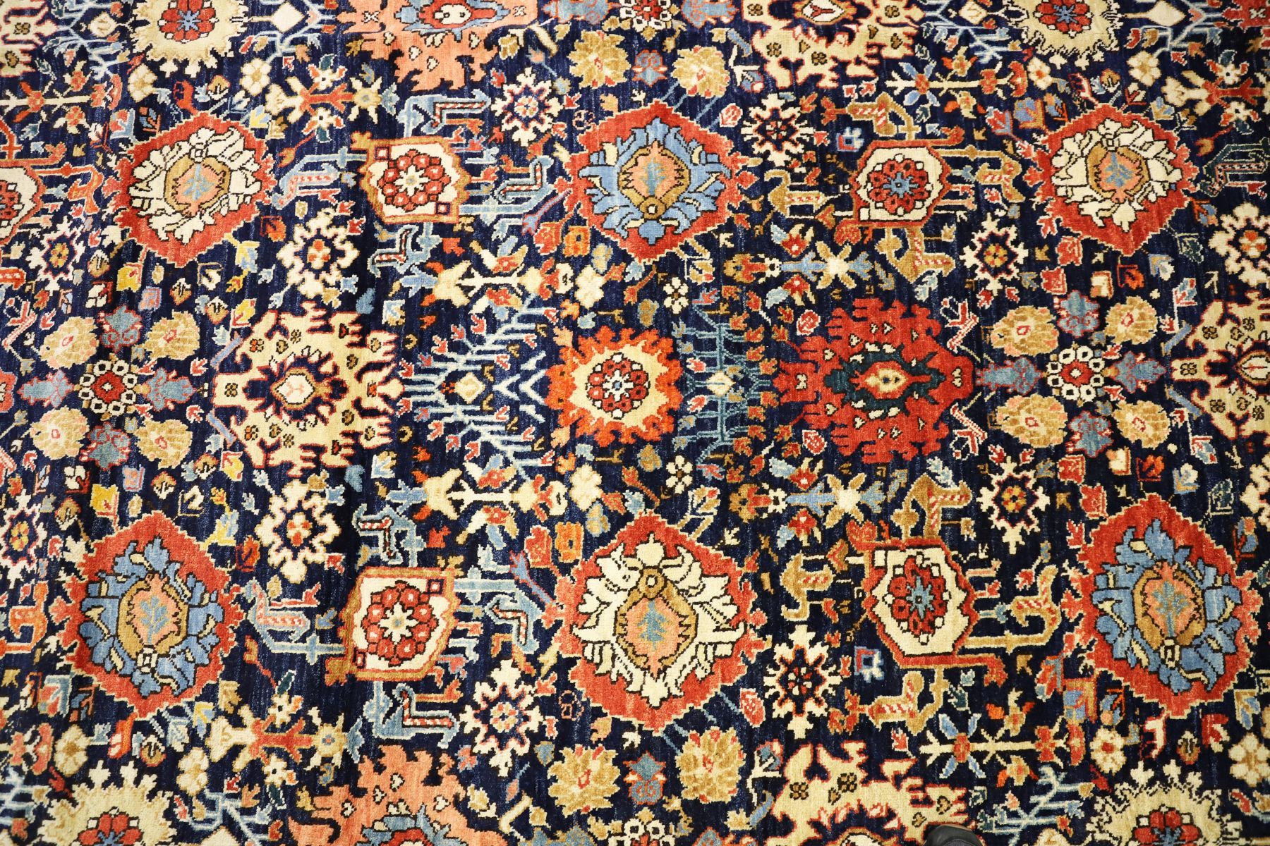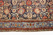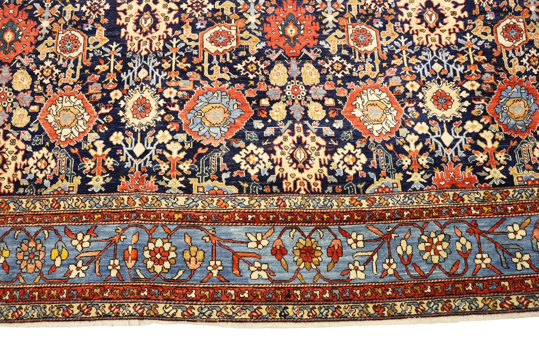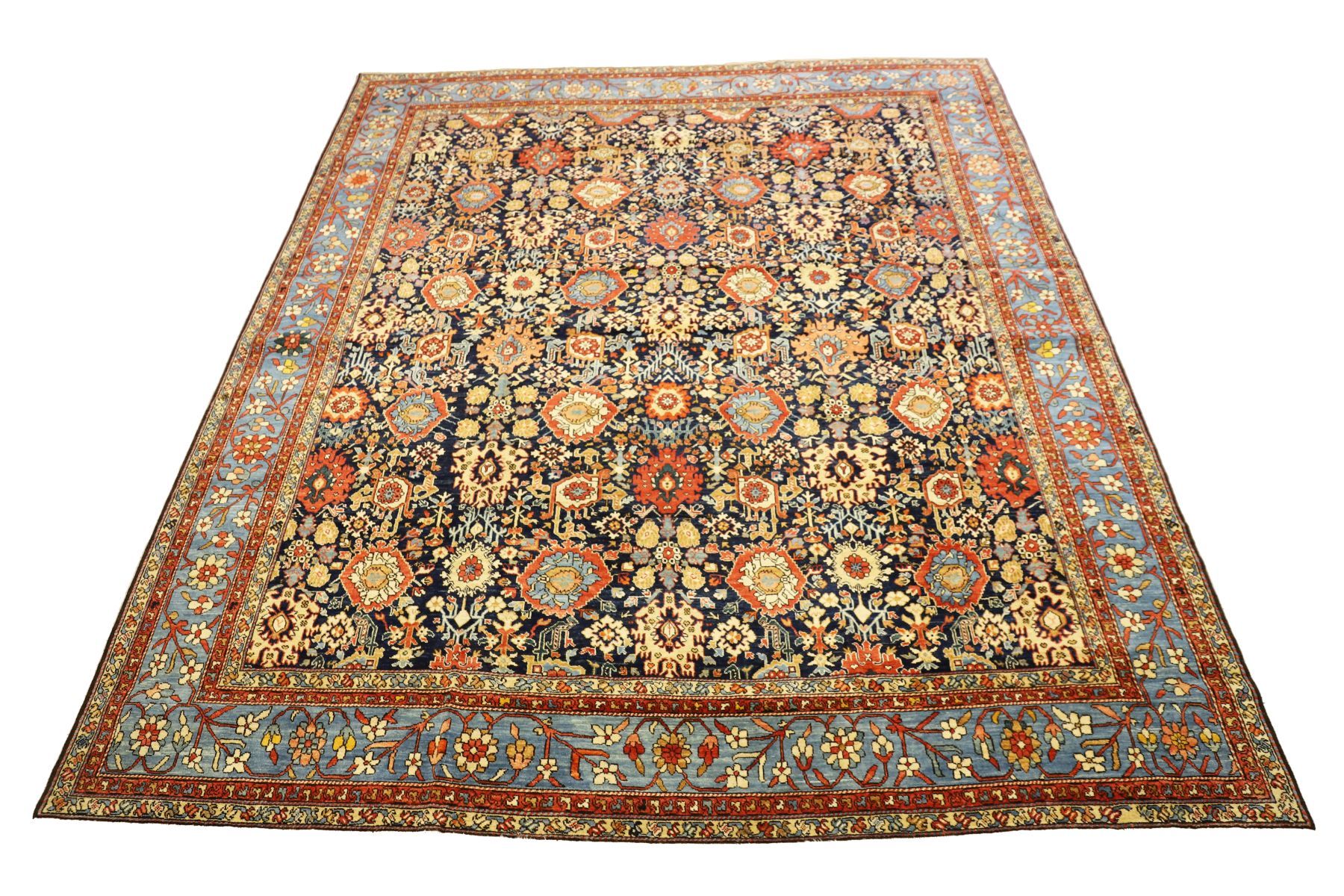the deep indigo ground densely decorated with all-over floral and rosette arrangements enclosed by a pale blue border with scrolling floral motifs and flanked by multiple guard borders.