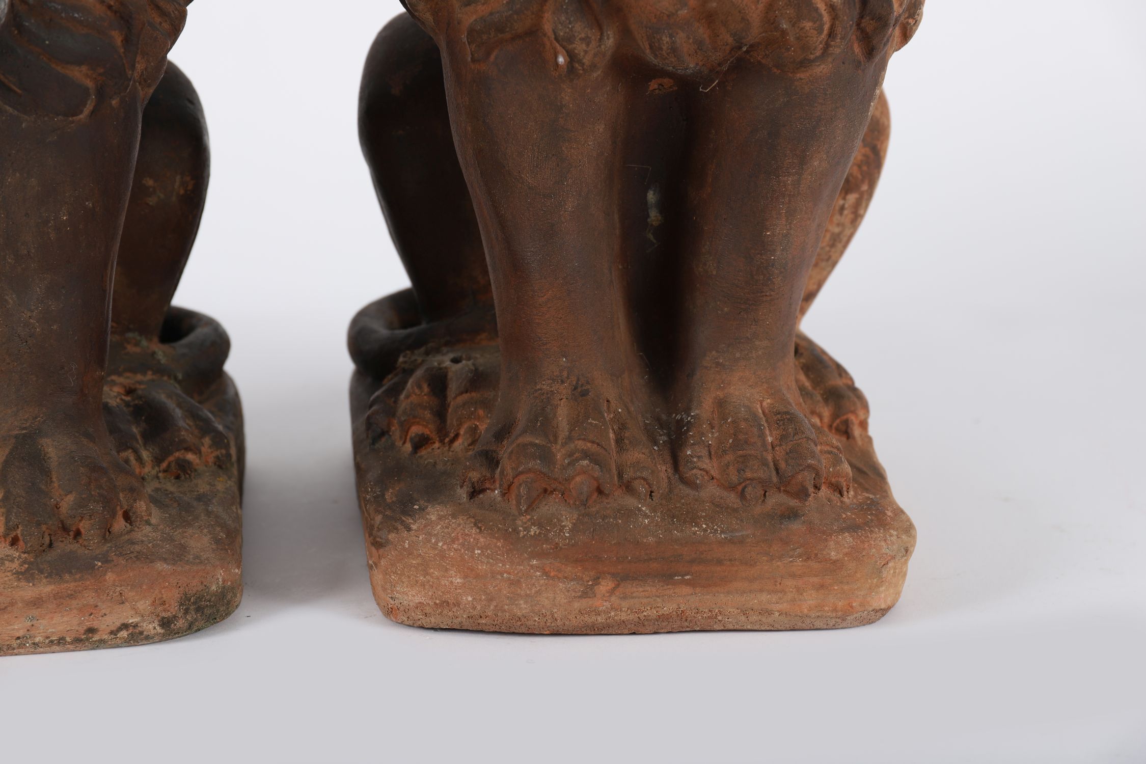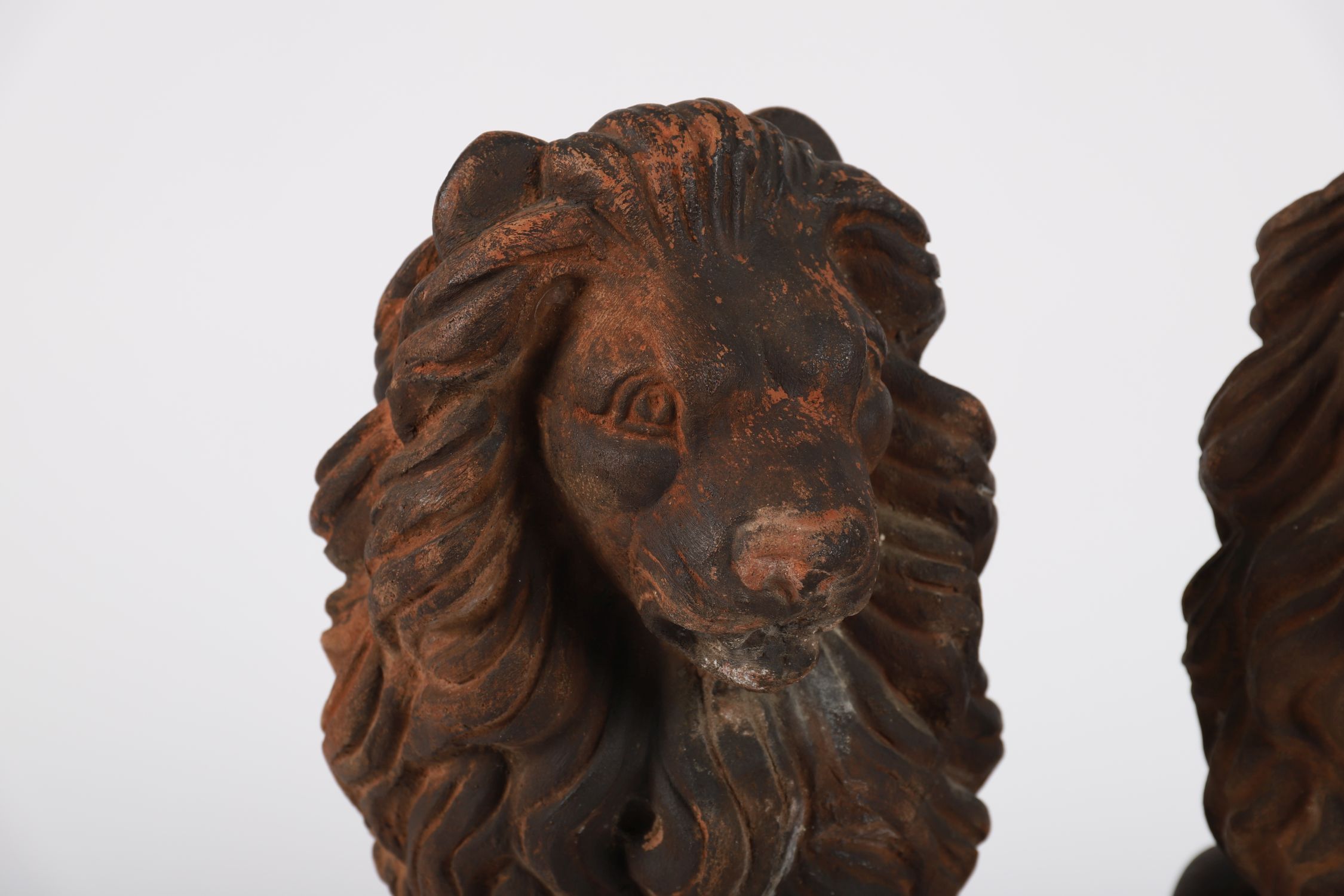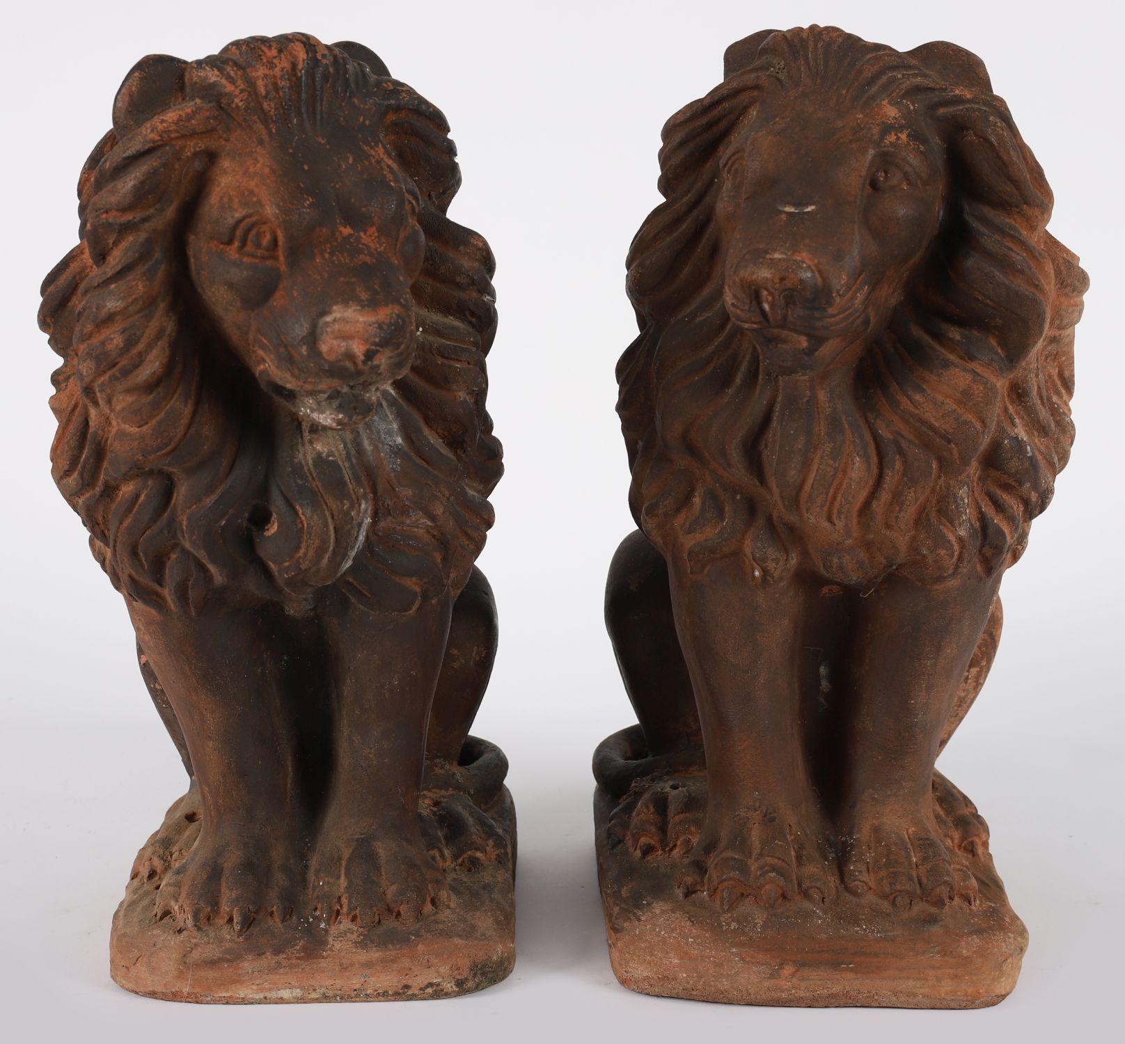 A finely modelled pair of 19th-century cast terracotta lions in seated pose, each with deeply detailed mane and expressive facial features.