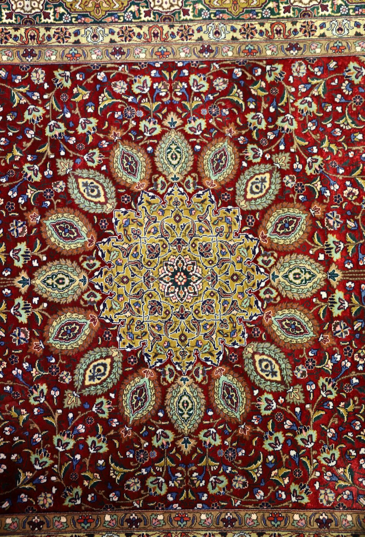 the deep crimson field centred by a complex radiating medallion with intricate floral latticework, surrounded by a dense all-over arrangement of scrolling vines, palmettes and flowering sprays. 8x8 knots per square cm.