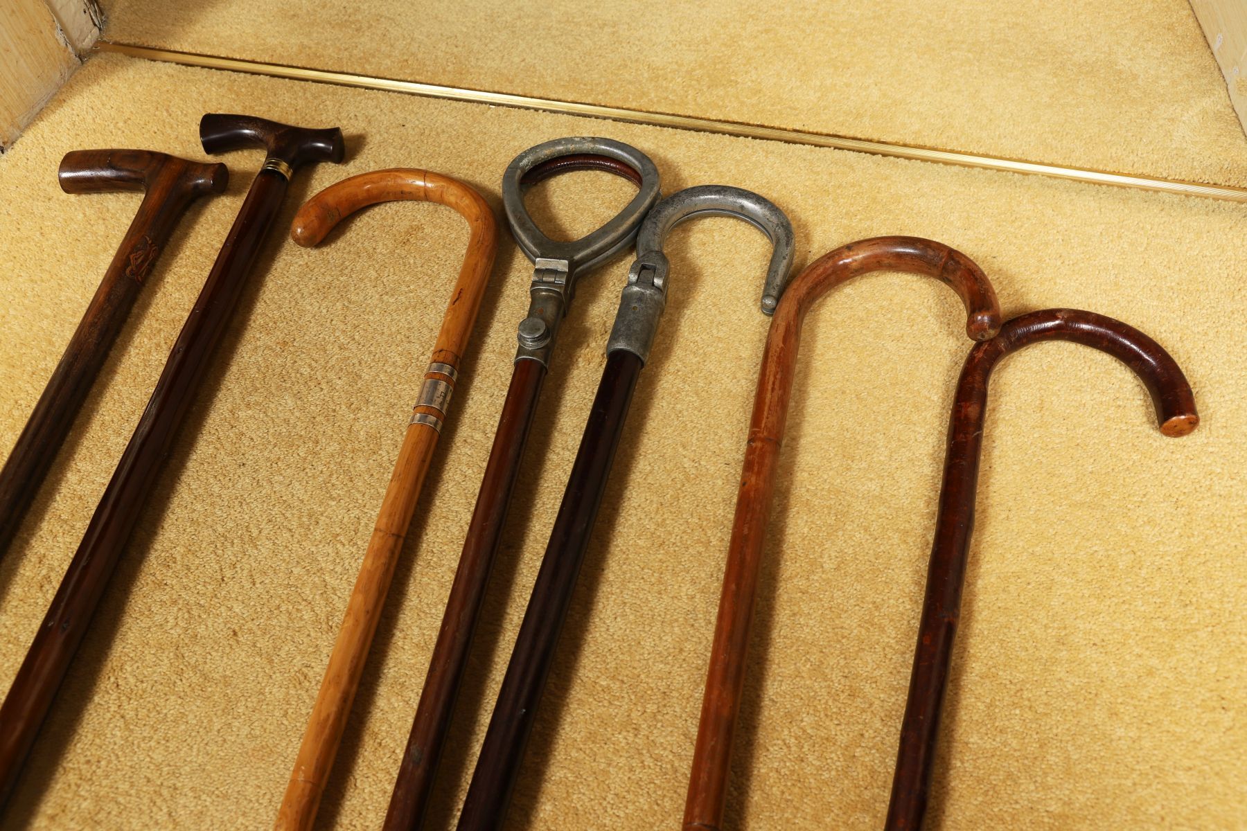 A group of seven sticks comprising five walking sticks and two racing sticks, with a variety of curved and straight handles, including wooden and metal mounts.
