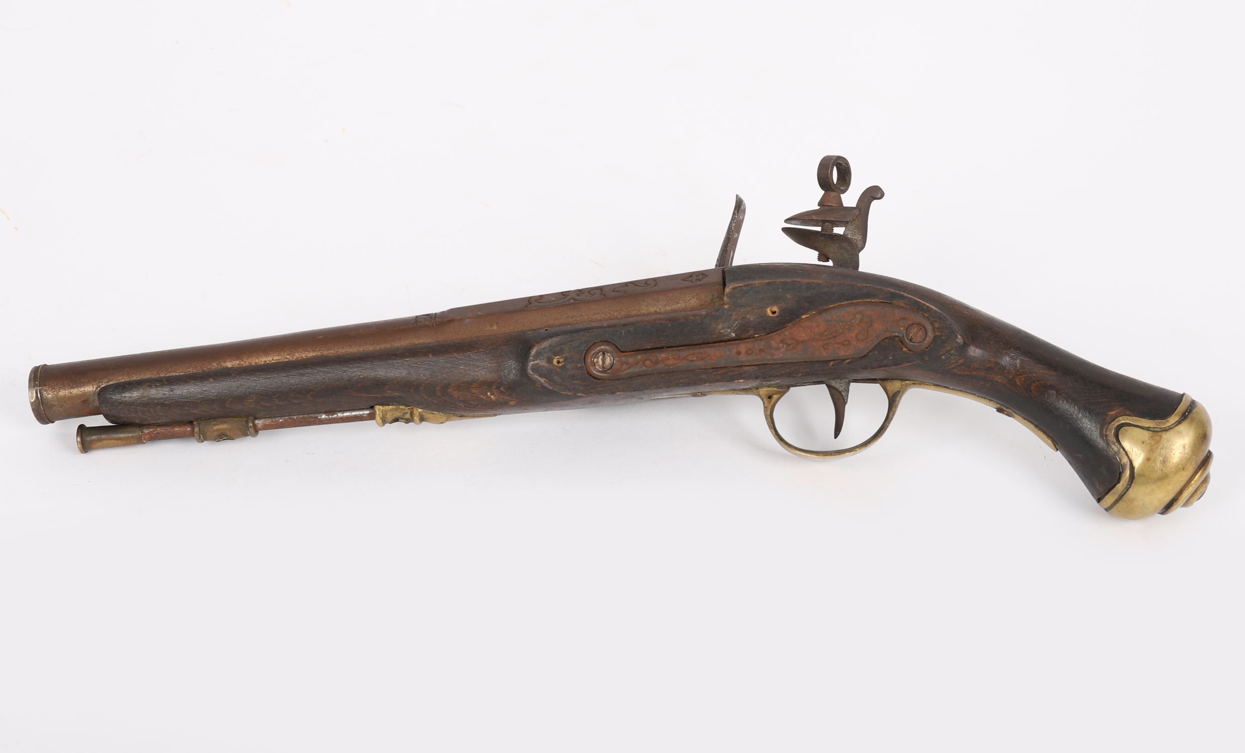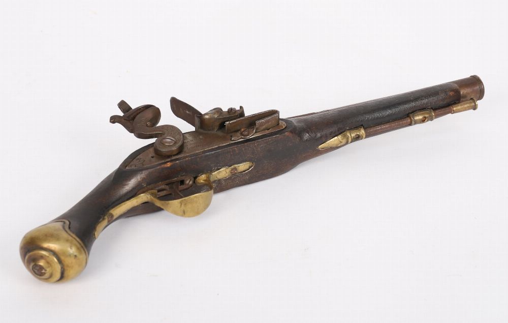 An early 19th-century flintlock pistol by Grander & Potts of London, with browned octagonal-to-round barrel, signed lockplate, and brass furniture including trigger guard and ramrod pipes. The full walnut stock with brass-tipped wooden ramrod, side plate, and carved apron to the tang. Grander & Potts were London gunmakers known for producing robust service and civilian pistols during the flintlock period.
