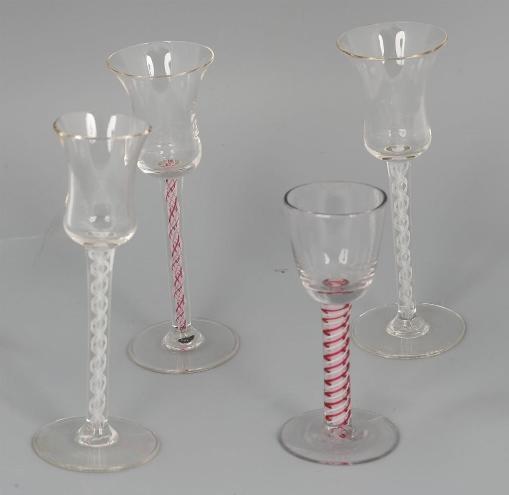 Lot 38 FOUR 19TH-CENTURY WINE GLASSES WITH AIR-TWIST AND COLOUR TWIST STEMS