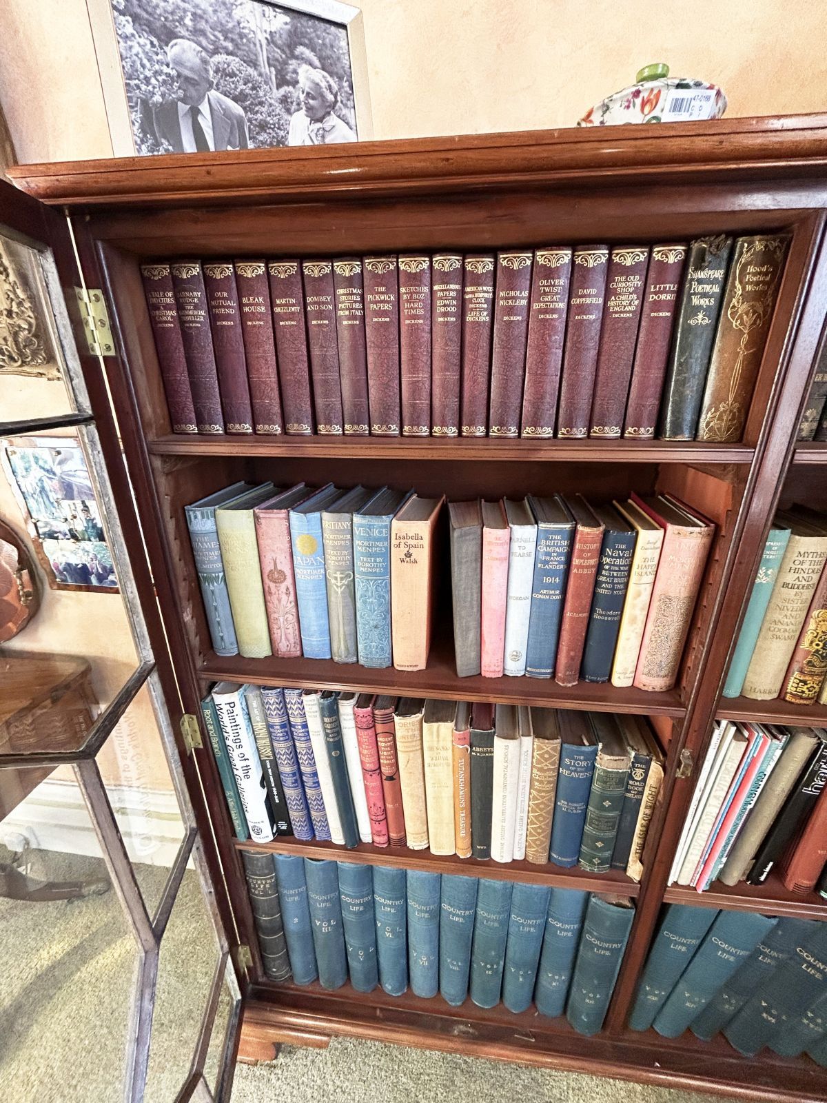 A mixed collection of bound volumes, including literature, history, and reference works.