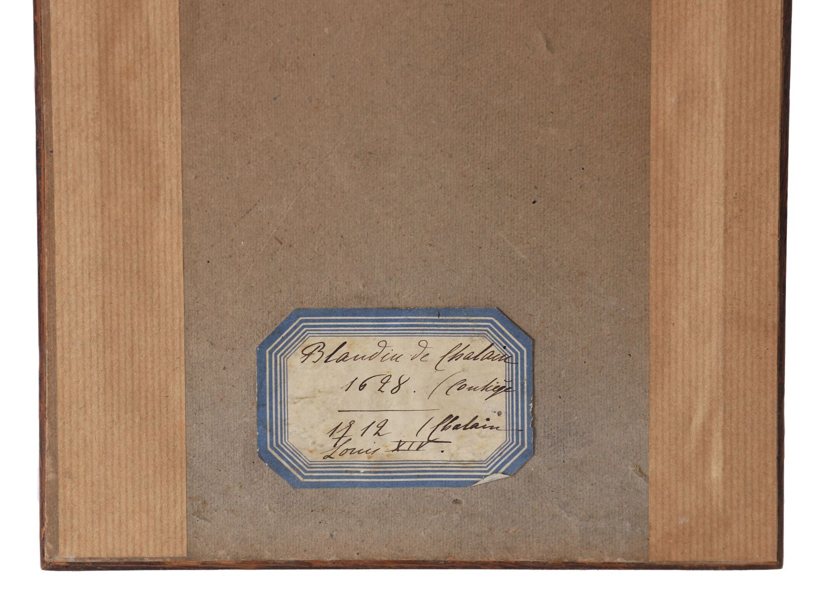 Framed armorial crest featuring the Blandin de Chalain coat of arms, painted with supporters and coronet, presented with provenance notes relating to Château Chalain. This heraldic presentation is of genealogical and decorative interest.