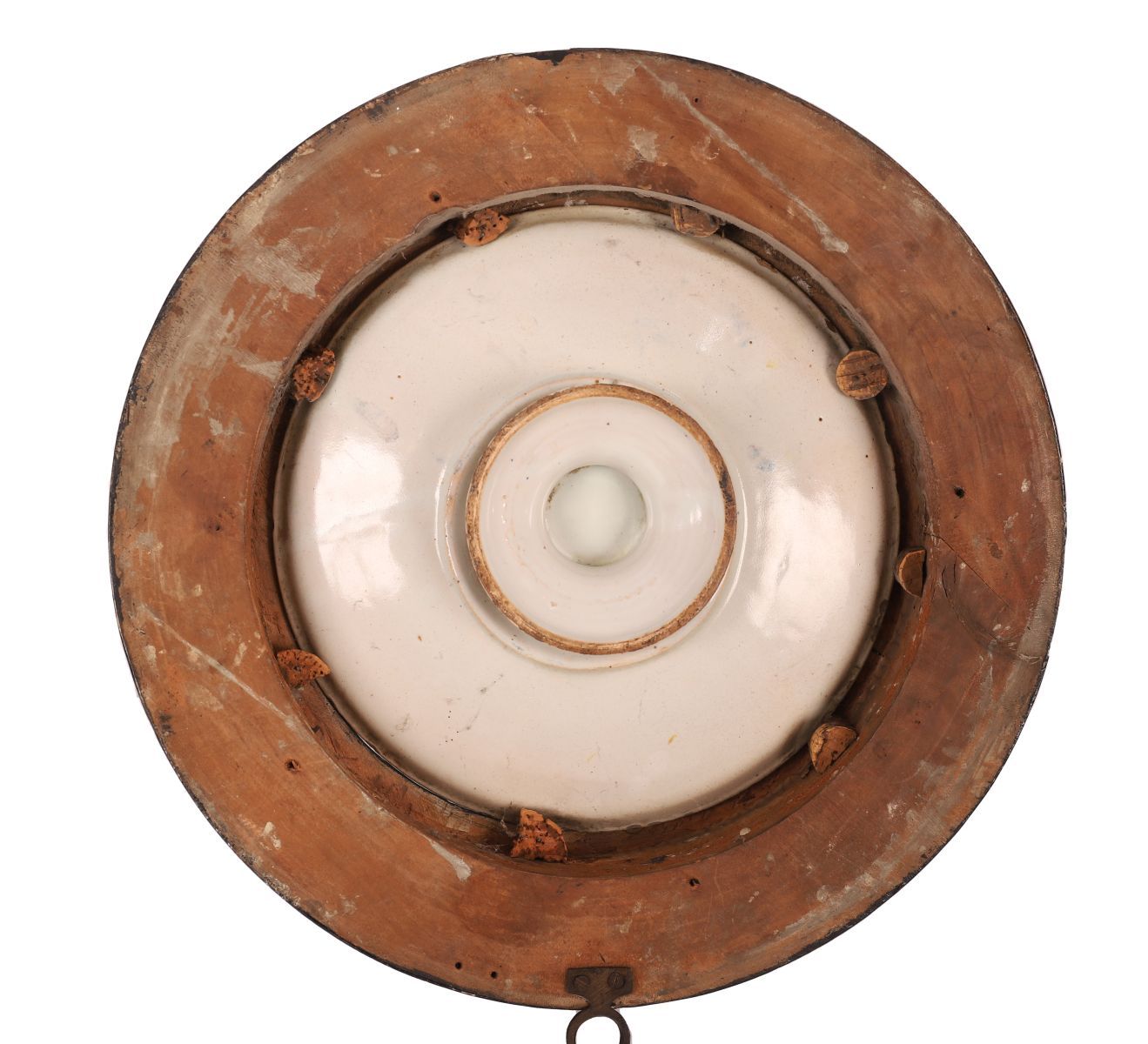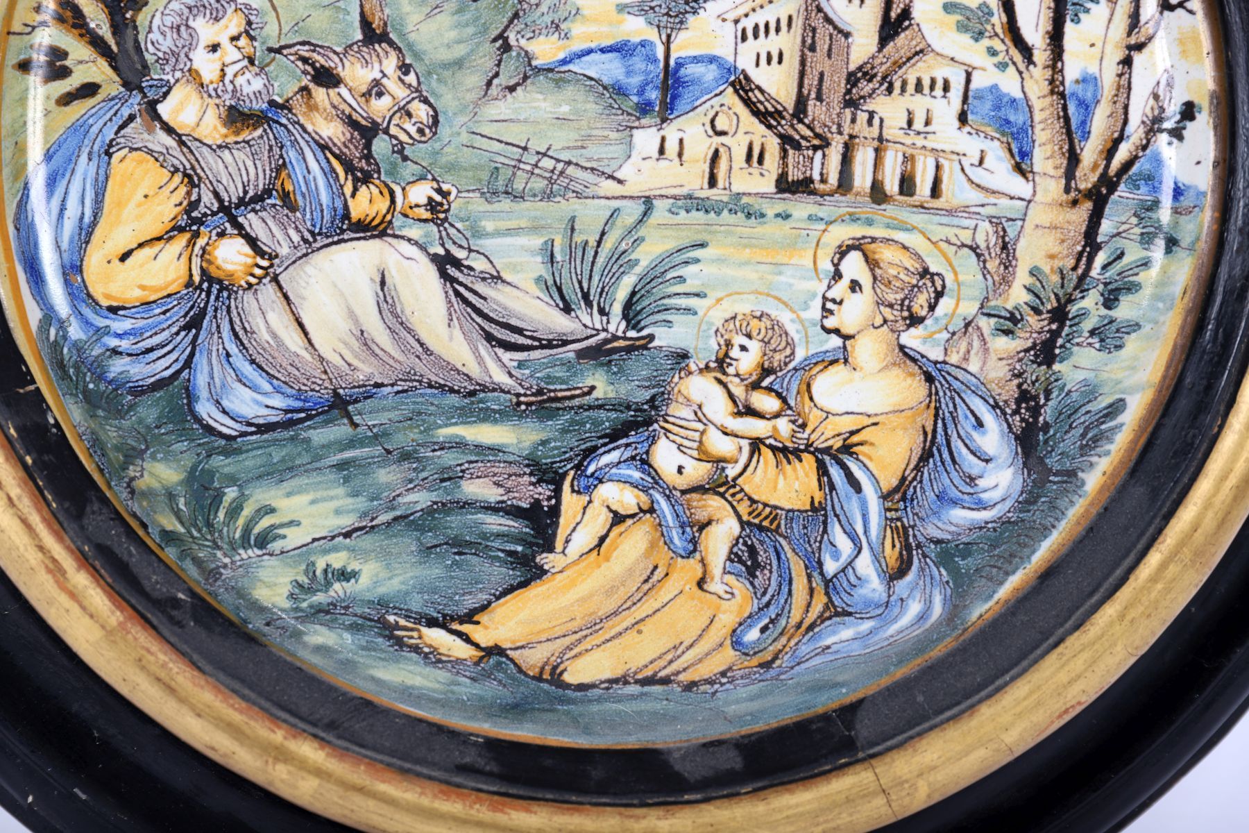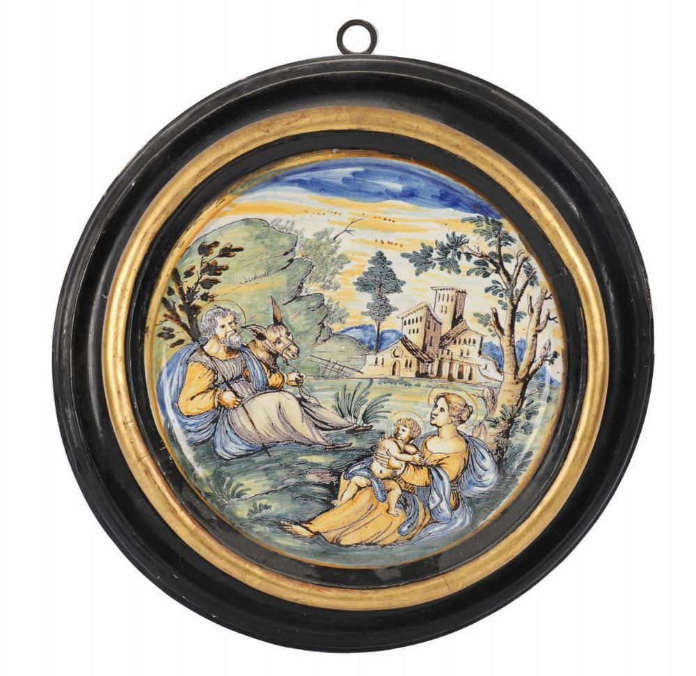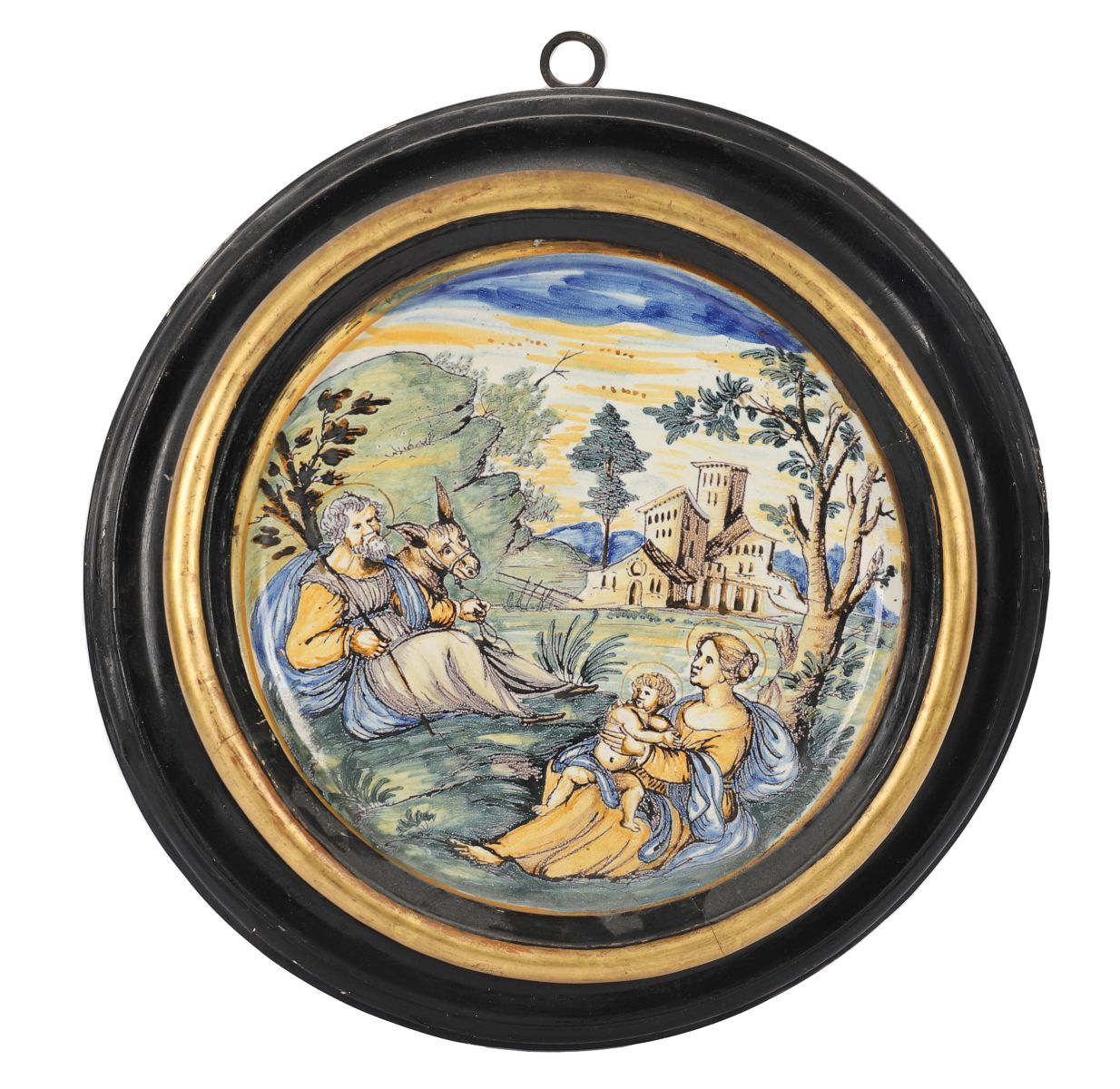 A faience or majolica circular plaque painted with a figural scene within a landscape setting, mounted within a black and gilt circular frame.