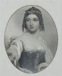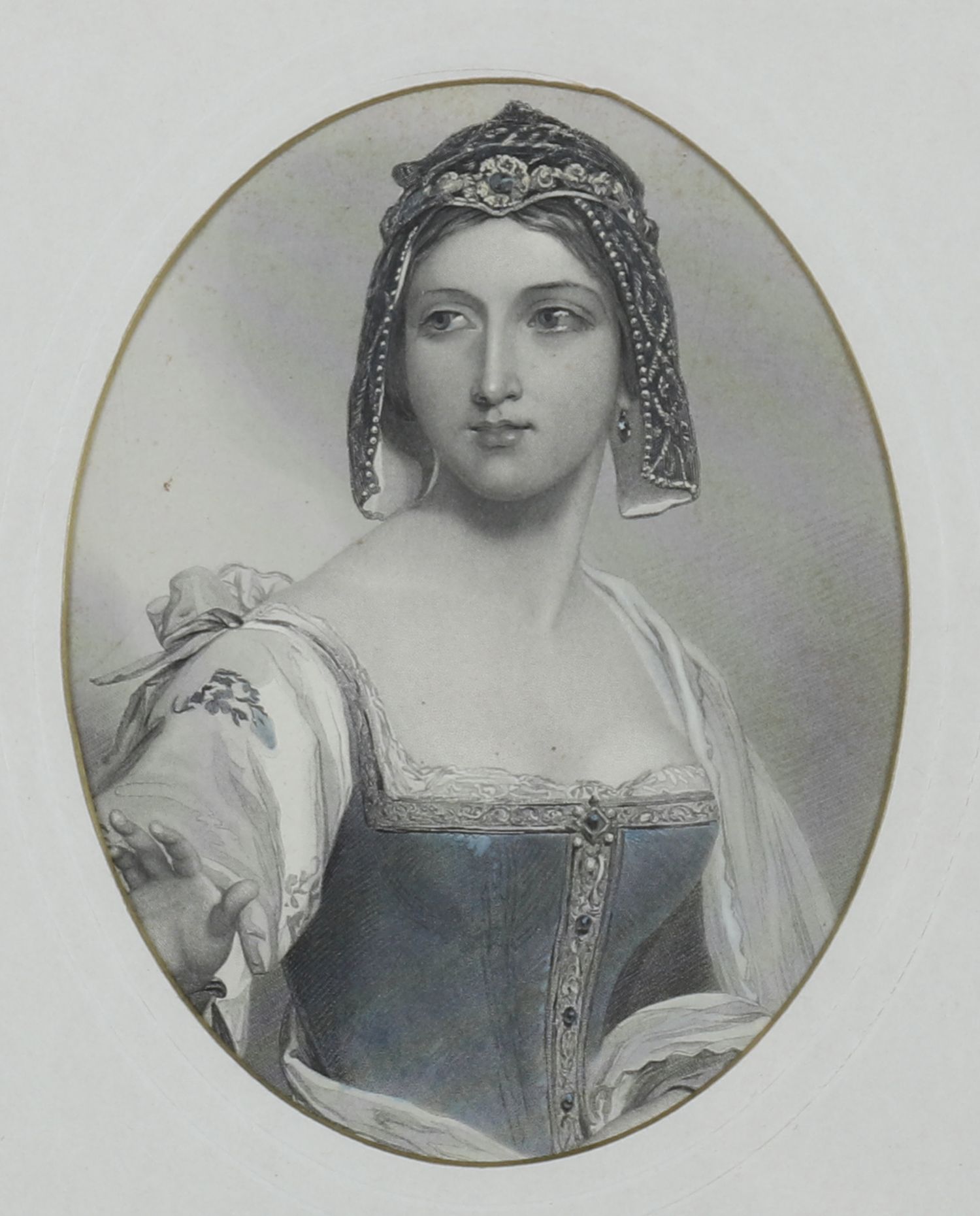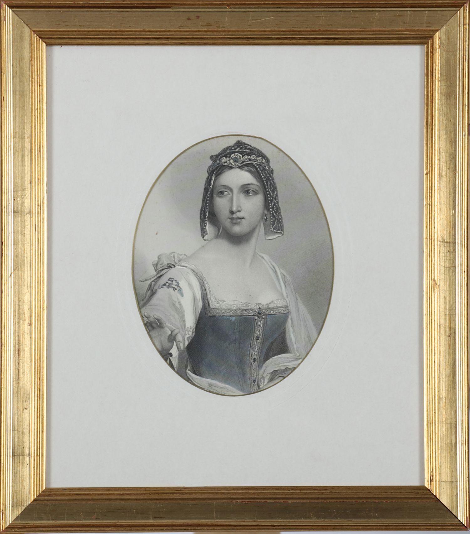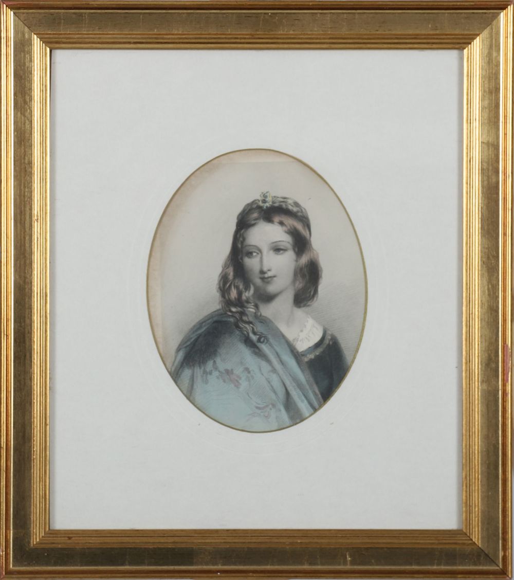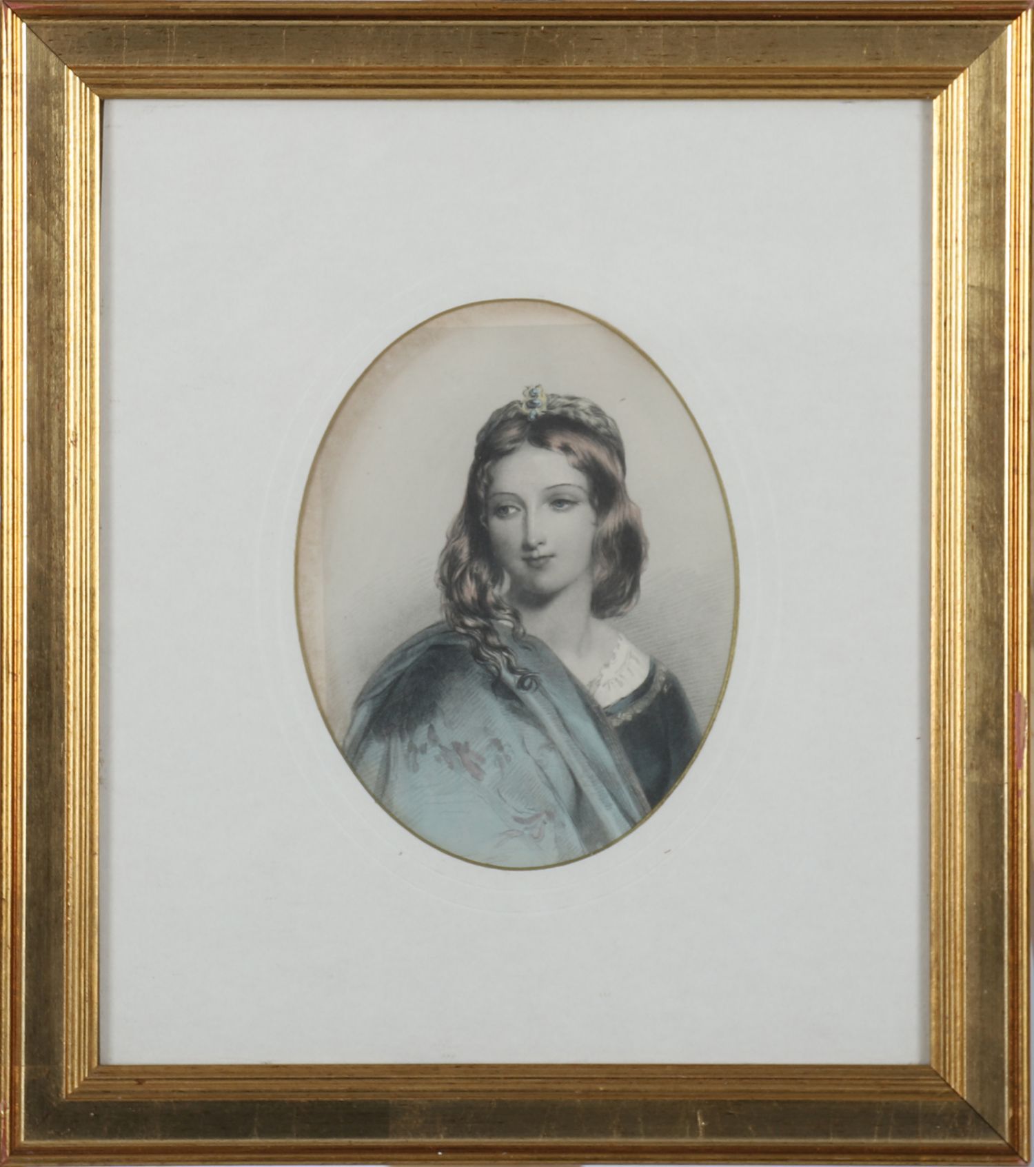 An oval-framed print of a young lady with long hair, wearing a draped garment with blue shawl, the portrait delicately tinted. Mounted within a giltwood frame.