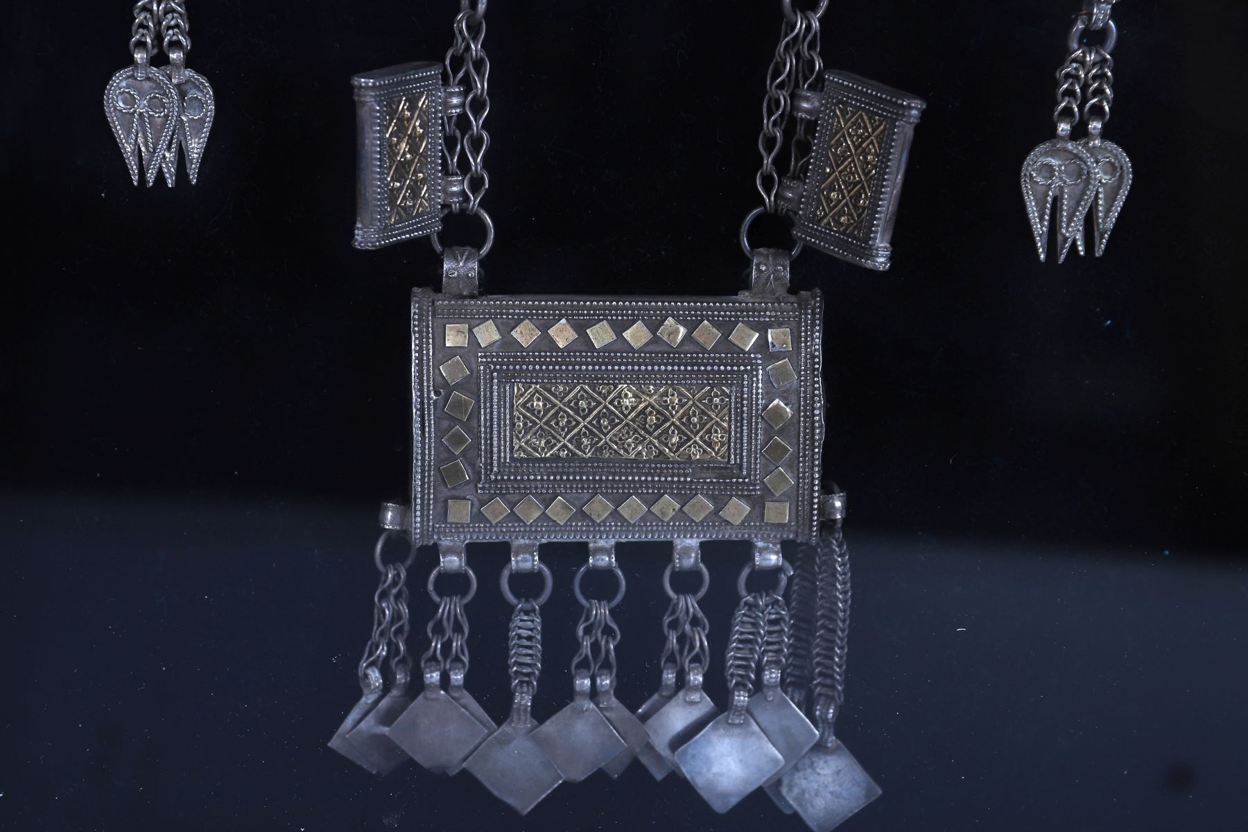 An ornate Bedouin silver jewellery set, comprising a traditional necklace with amulet pendant and matching hoop earrings, displayed in a gilt frame. The necklace features a central amulet box with applied filigree and granulated detail, suspended with stylised pendants and faux coin dangles. The earrings echo the design with finely detailed leaf charms and square plaque elements.
