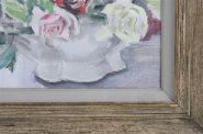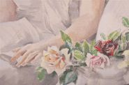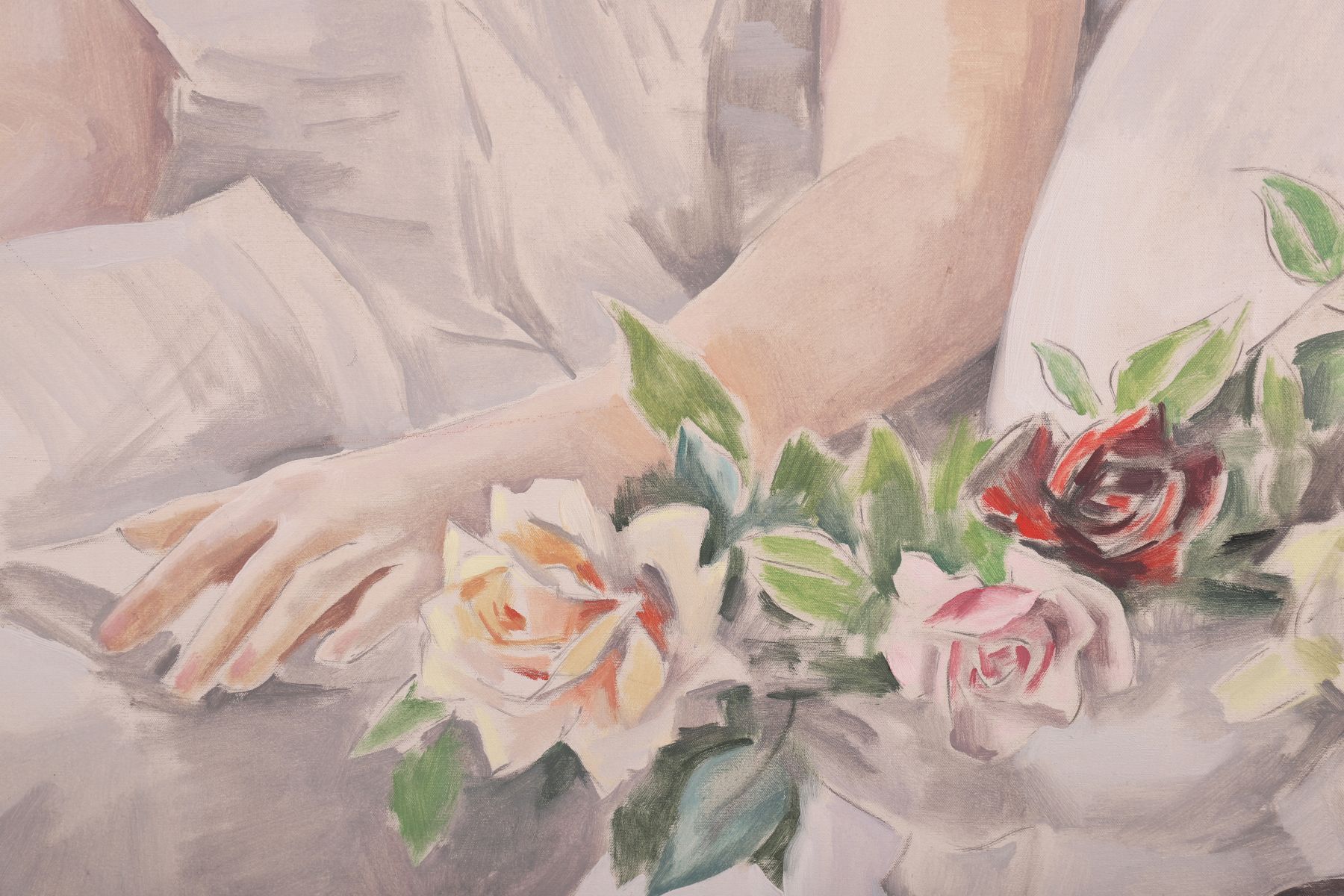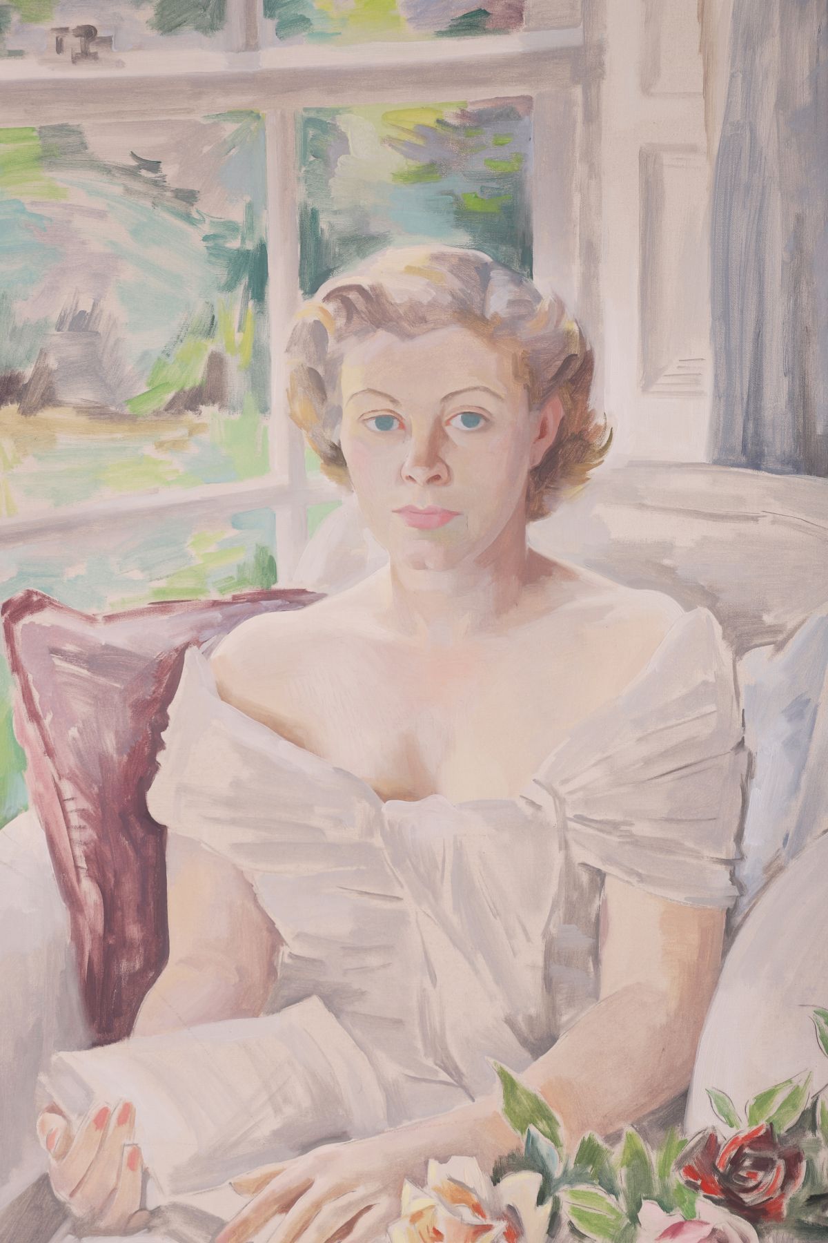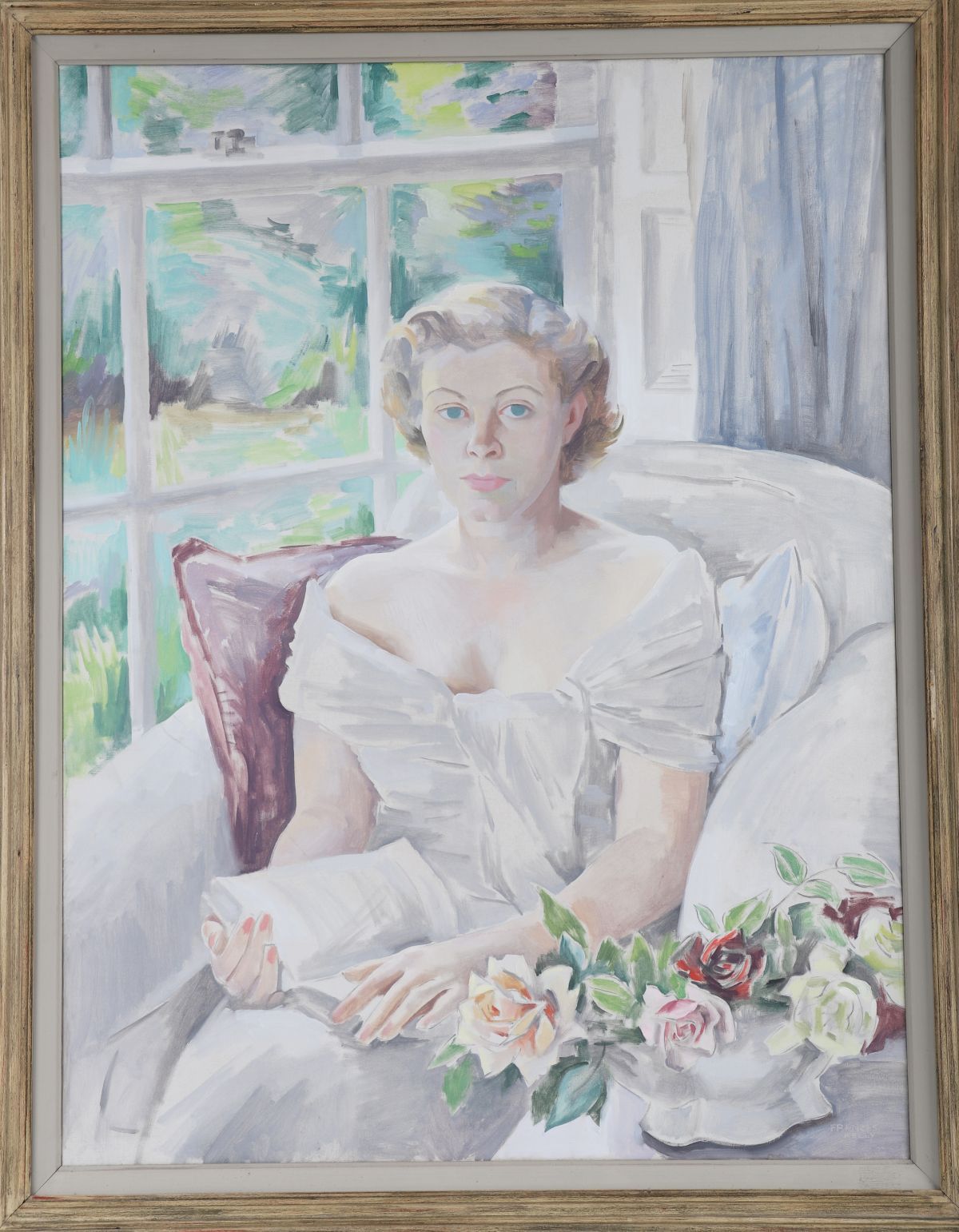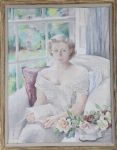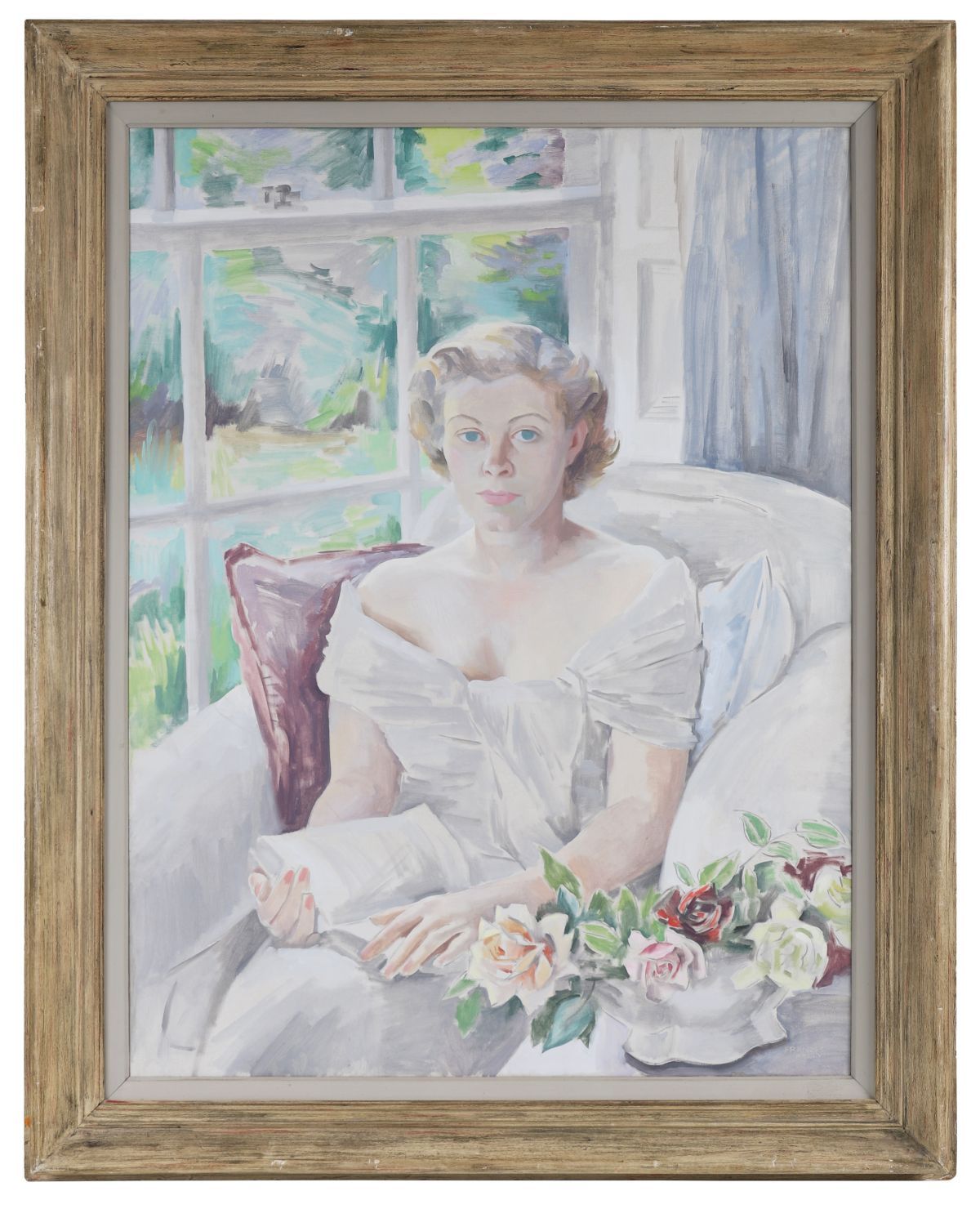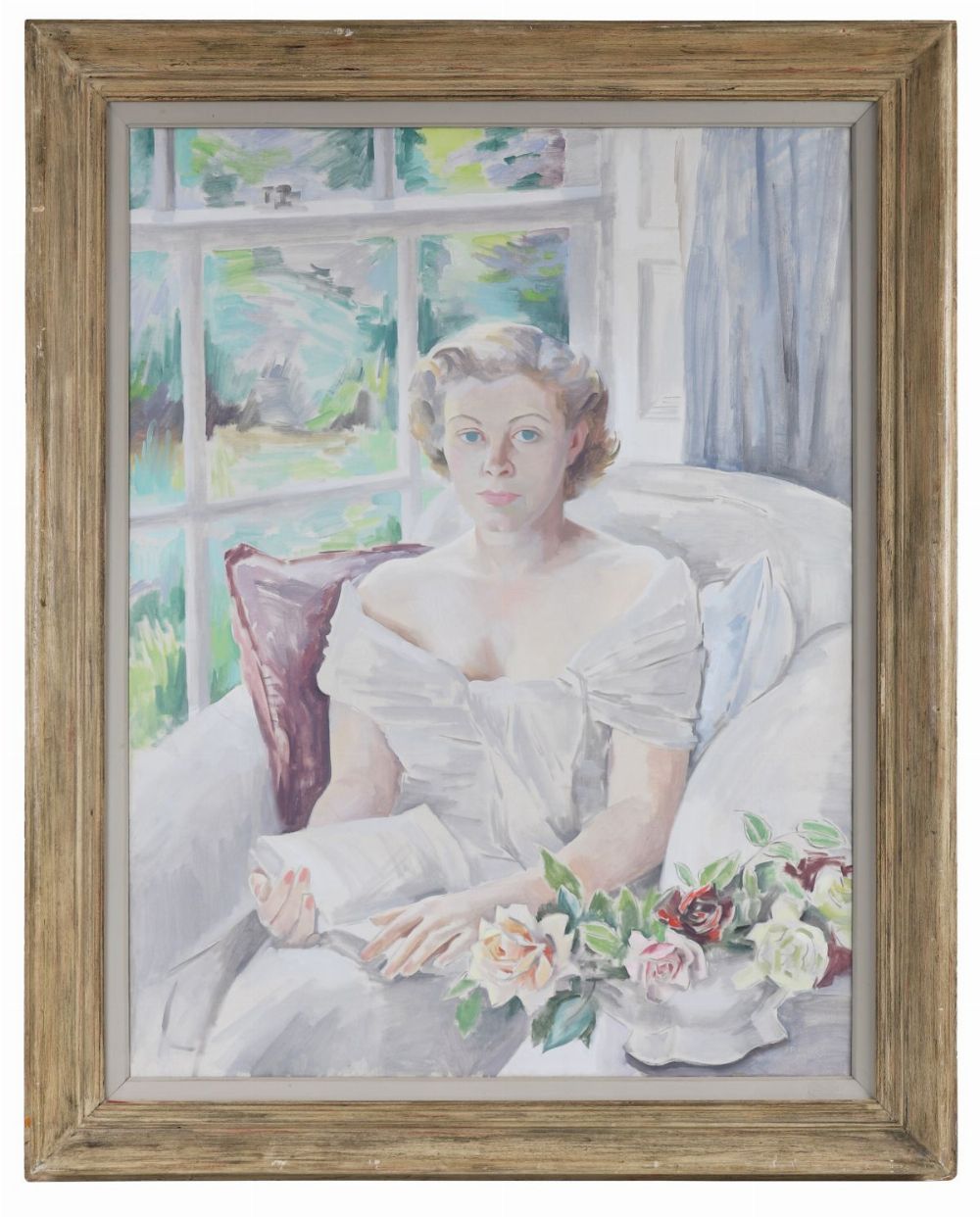 An elegant portrait of the Irish poet Eavan Boland (1944–2020) by Frances Kelly (1908–2002), depicting the sitter seated beside a large window, dressed in a soft white gown and holding a folded letter, with a cluster of roses arranged before her. The composition is rendered in Kelly’s distinctive luminous palette, with confident brushwork and an emphasis on natural light. The scene conveys poise, intellect, and the reflective sensitivity often associated with Boland’s literary persona. Presented in a giltwood frame.