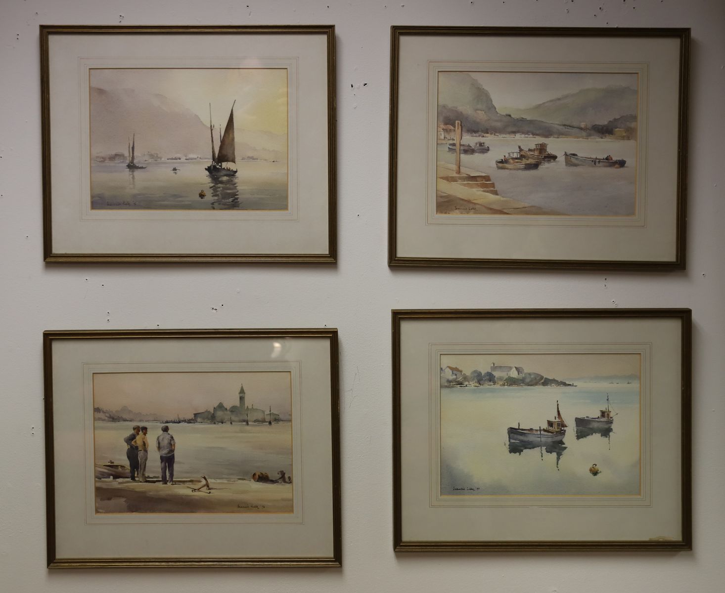 A set of four framed watercolours by Francis Leke, each signed and dated 1976-77, depicting estuary and harbour scenes including Dartmouth Estuary and Folkestone Inner Harbour. Each with delicate washes capturing boats, figures, and coastal architecture.
