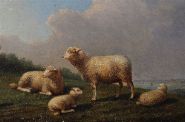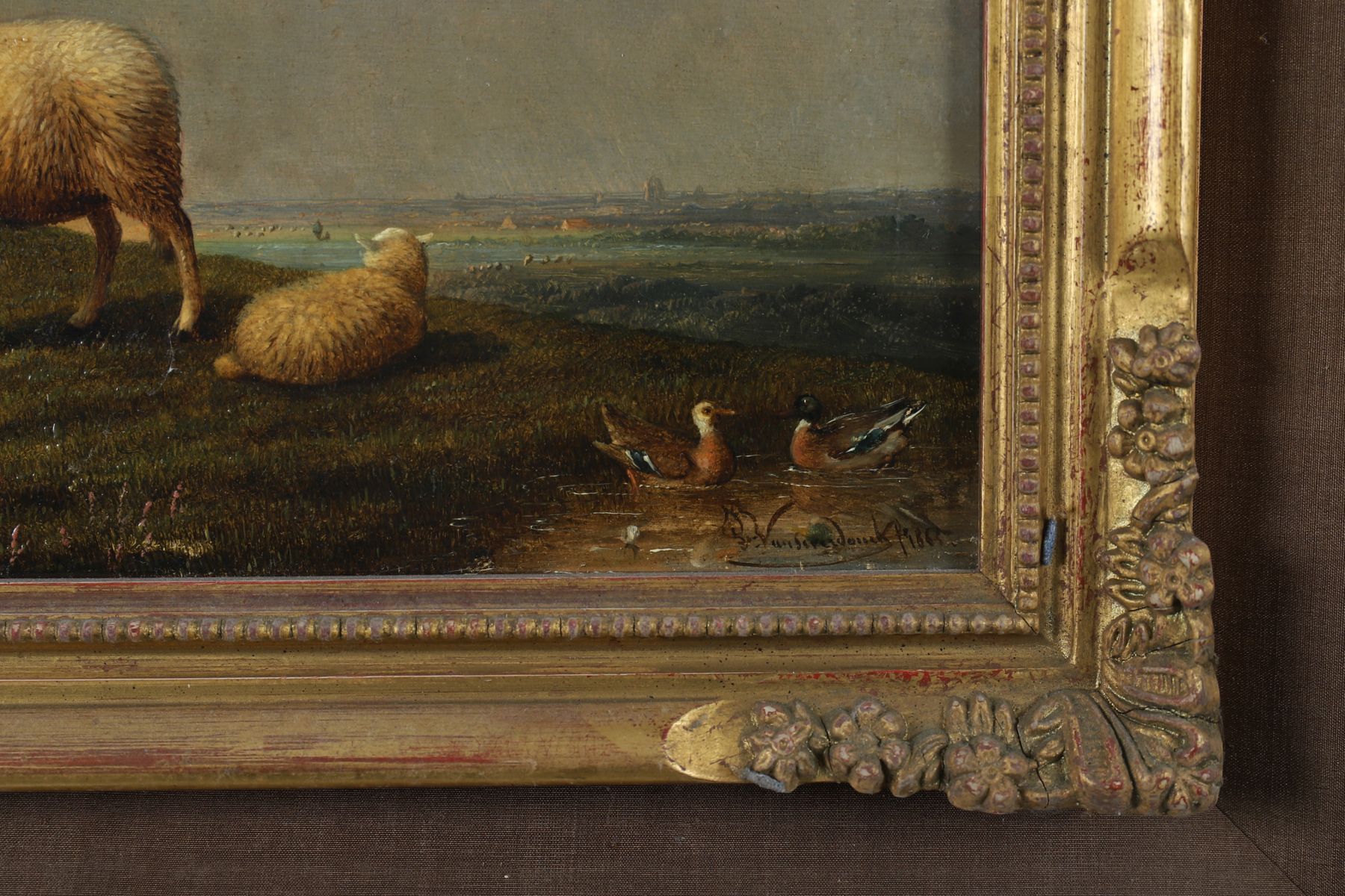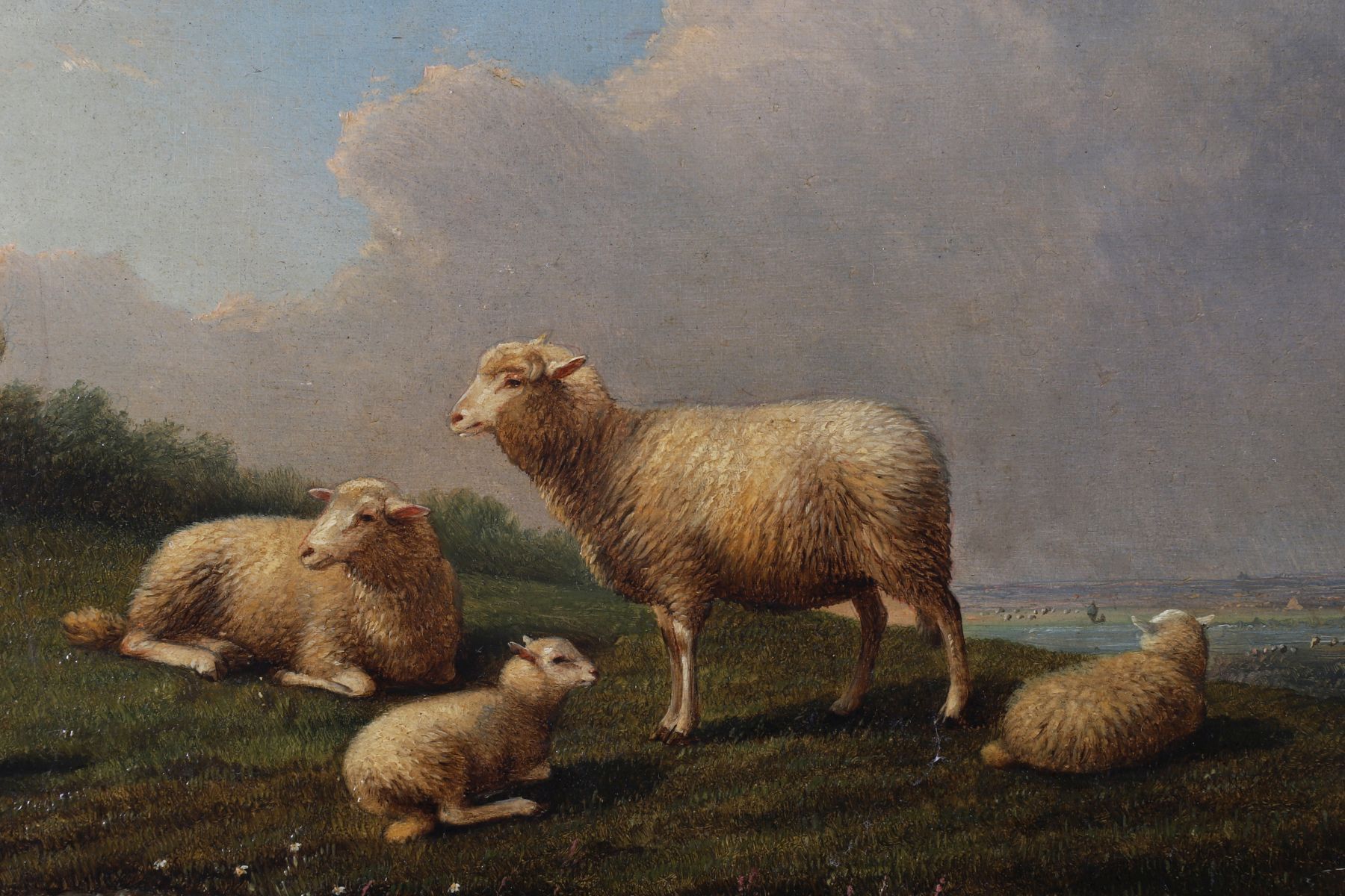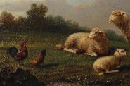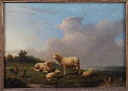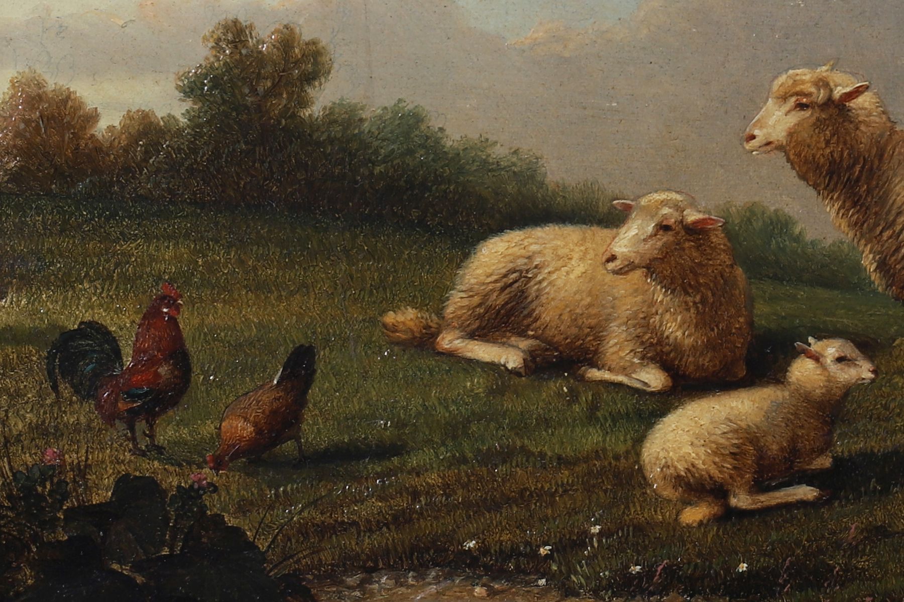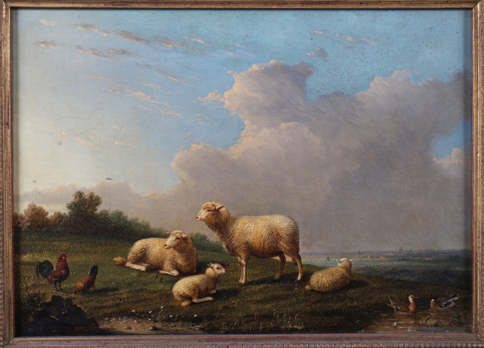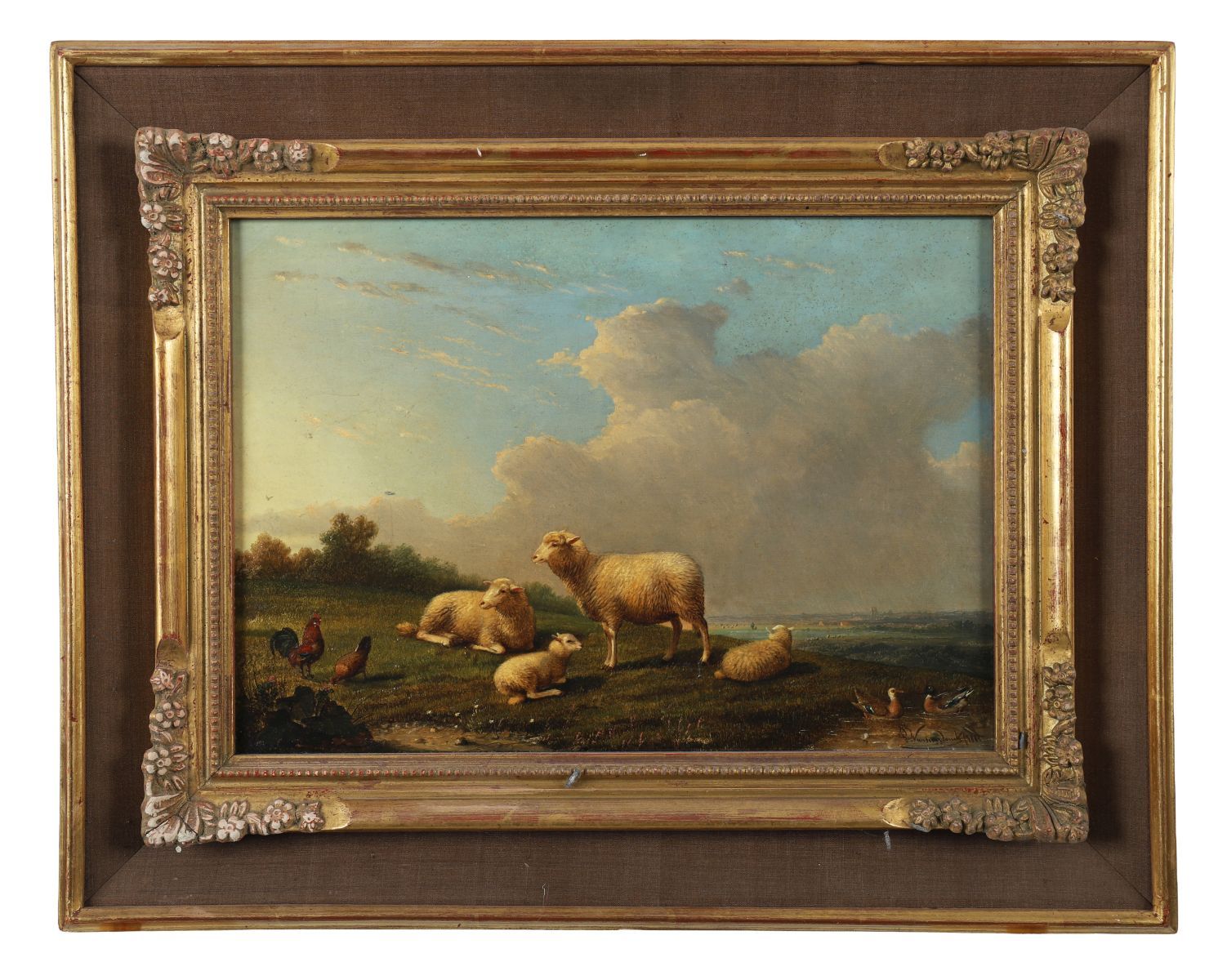 A pastoral landscape showing a flock of sheep resting and grazing on open pasture under a luminous sky, with poultry nearby. Oil on panel, signed lower right. Presented in a gilt frame.