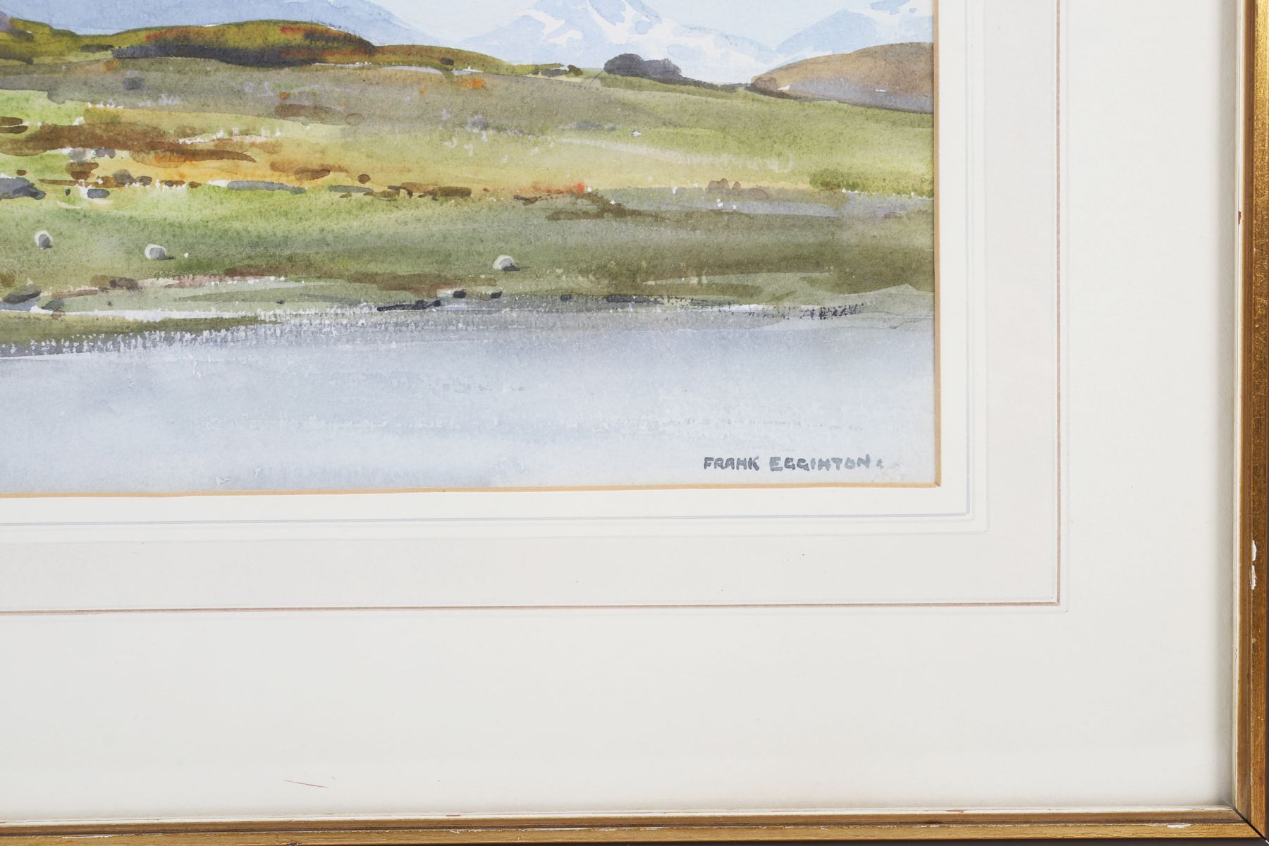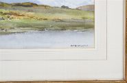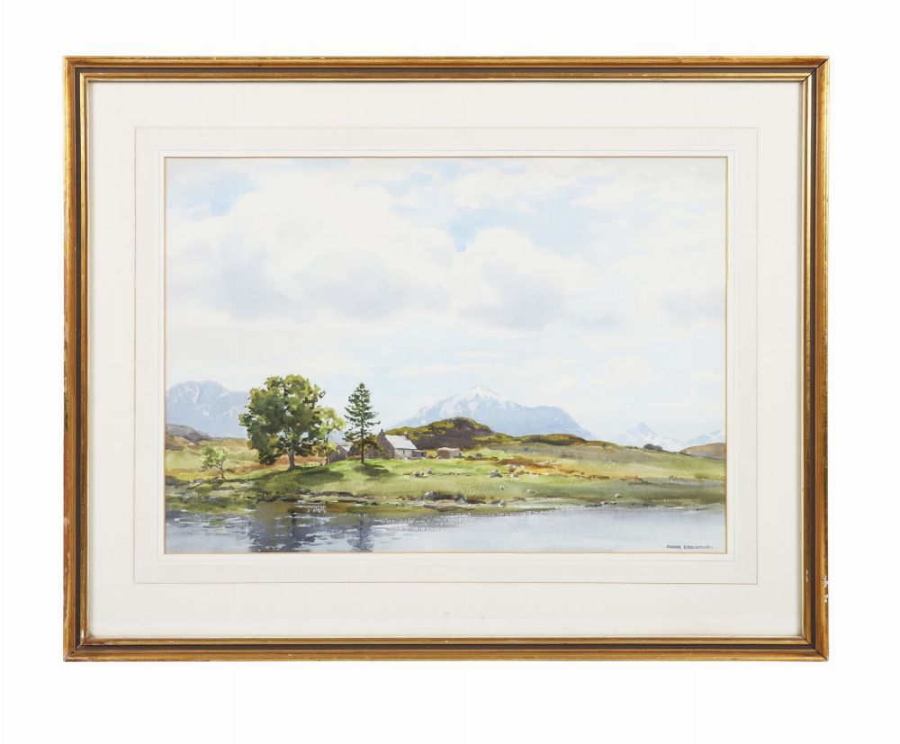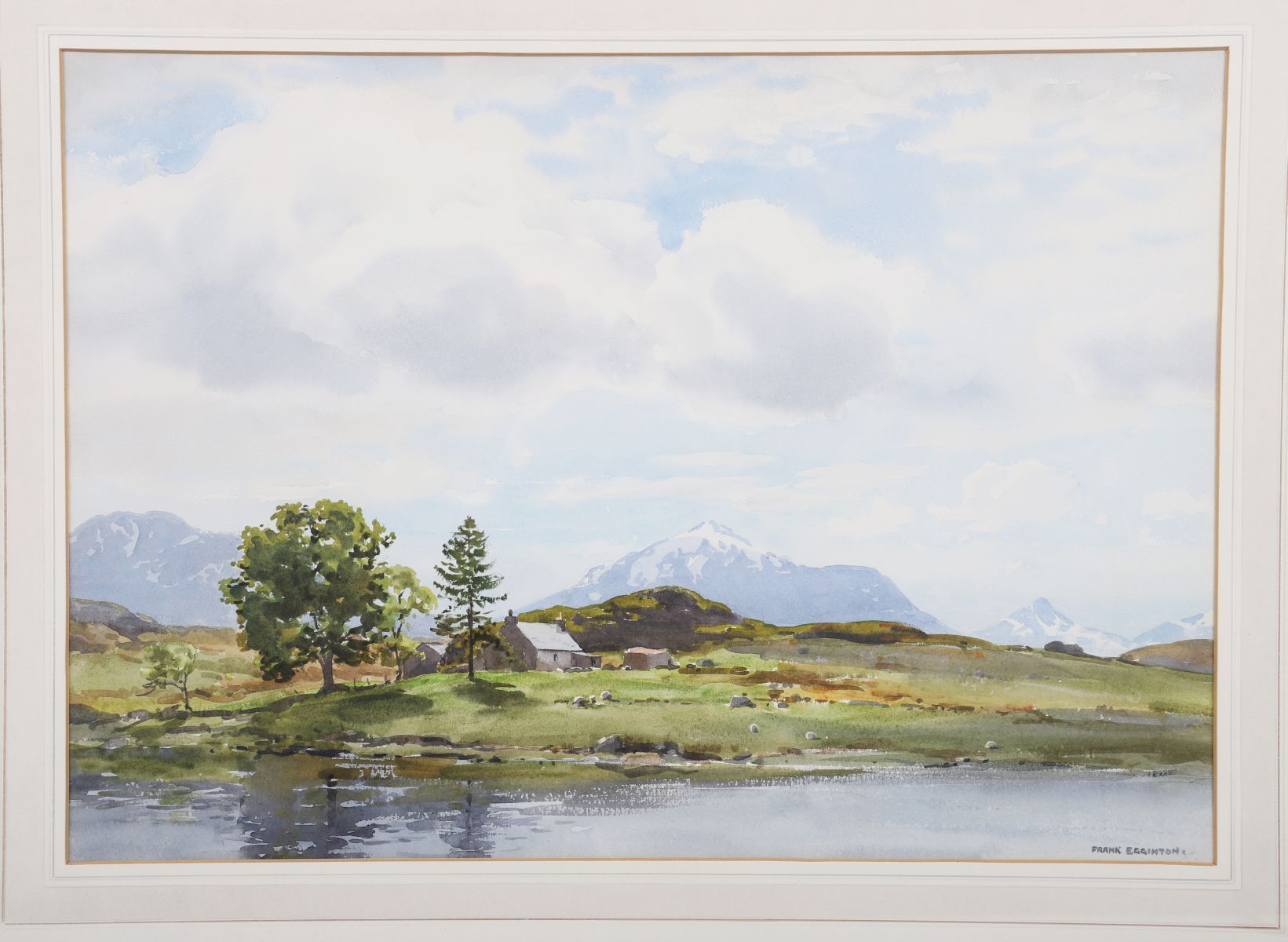 A finely executed watercolour depicting a tranquil Highland landscape in Glen Spean, Inverness-Shire. Egginton’s characteristic clarity and delicacy of touch are evident in the soft cloud-laden sky, distant snow-tipped peaks and the serene reflective waters in the foreground. A small cluster of cottages and trees sits nestled amid rolling green terrain, rendered with the artist’s precise yet atmospheric handling of light and colour. Signed lower right. Presented in a gilt frame with double mount.